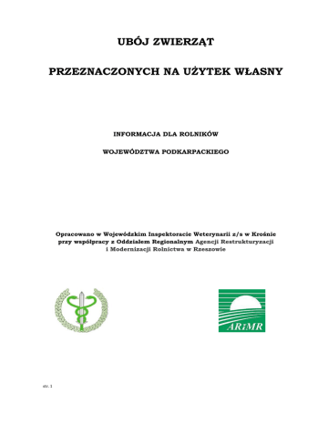 UBÓJ ZWIERZĄT PRZEZNACZONYCH NA UŻYTEK WŁASNY INFORMACJA DLA ROLNIKÓW WOJEWÓDZTWA PODKARPACKIEGO Opracowano w Wojewódzkim Inspektoracie Weterynarii z/s w Krośnie przy współpracy z Oddziałem Regionalnym Agencji Restrukturyzacji i Modernizacji Rolnictwa w Rzeszowie str. 1 Podstawy prawne dla uboju zwierząt przeznaczonych na użytek własny stanowią następujące akty prawne prawa krajowego i wspólnotowego : Ustawa z dnia 16 grudnia 2005r. o produktach pochodzenia zwierzęcego (Dz. U. z 2006r. Nr 17, poz. 127 z późn. zm.), Ustawa z dnia 2 kwietnia 2004r. o systemie identyfikacji i rejestracji zwierząt (Dz. U. z 2008r. Nr 204, poz. 1281 z późn. zm.), Rozporządzenie MRiRW z dnia 21 października 2010r. w sprawie wymagań weterynaryjnych przy produkcji mięsa przeznaczonego na użytek własny (Dz. U. z 2010r. Nr 207, poz. 1370), Rozporządzenie MRiRW z dnia 9 września 2004r. w sprawie kwalifikacji osób uprawnionych do zawodowego uboju oraz warunków i metod uboju i uśmiercania zwierząt (Dz. U. z 2004r. Nr 205, poz. 2102 z późn. zm.), Rozporządzenie MRiRW z dnia 20 października 2005r. w sprawie wymagań weterynaryjnych przy przewozie wyłącznie na terytorium Rzeczypospolitej Polskiej, ubocznych produktów zwierzęcych oraz sposobu wykorzystania tych produktów (Dz. U. z 2005r. Nr 217, poz, 1839), Rozporządzenie Parlamentu Europejskiego i Rady (WE): Nr 1069/2009 określające przepisy sanitarne dotyczące produktów ubocznych pochodzenia zwierzęcego nieprzeznaczonych do spożycia przez ludzi, i uchylające rozporządzenie (WE) Nr 1774/2002, Rozporządzenie Parlamentu Europejskiego i Rady (WE) Nr 999/2001 ustanawiające zasady dotyczące zapobiegania, kontroli i zwalczania niektórych pasażowalnych gąbczastych encefalopatii. str. 2 I WSTĘP Na terenie gospodarstwa, na użytek własny, można dokonywać uboju owiec, kóz, trzody chlewnej, drobiu, zajęczaków w dowolnym wieku oraz cieląt do 6 m-ca życia. Ubojowi należy poddawać wyłącznie zwierzęta zdrowe, nie podlegające ograniczeniom z powodu podejrzenia lub stwierdzenia chorób zakaźnych zwierząt, oraz po upływie okresu karencji określonym dla użytego produktu leczniczego, jeżeli przed poddaniem ubojowi zwierzęta były leczone tymi produktami. Przedstawiona informacja nie zastąpi wymienionych wcześniej przepisów prawa, ani też nie zawiera wszystkich wymagań w zakresie „uboju domowego” zwierząt. Jest to rodzaj przewodnika, którego celem jest ich przybliżenie Rolnikom Województwa Podkarpackiego. Szczegółowe informacje uzyskacie Państwo u właściwych dla miejsc zamieszkania powiatowych lekarzy weterynarii – załącznik nr 1, którzy sprawują nadzór nad przedmiotową działalnością, w tym egzekucją spełnienia wymagań dla niej określonych. II UBÓJ CIELĄT, OWIEC I KÓZ Posiadacz cieląt, owiec i kóz na co najmniej 24 godziny przed ubojem zobowiązany jest przekazać powiatowemu lekarzowi weterynarii powiadomienie o zamiarze przeprowadzenia uboju wg wzoru zawartego w rozporządzeniu w sprawie wymagań weterynaryjnych przy produkcji mięsa przeznaczonego na użytek własny - załącznik nr 2. Powiadomienie zawiera oprócz danych dotyczących posiadacza zwierzęcia i danych dotyczących ubijanych zwierząt, informację o zgłoszeniu mięsa do badania poubojowego (badanie poubojowe tych zwierząt nie jest obowiązkowe), oraz oświadczenie o zagospodarowaniu na własny koszt materiału szczególnego ryzyka pochodzącego od ubijanych zwierząt szczegółowo opisanym w pkt VII. Poubojowe badanie mięsa (w przypadku zaznaczenia takiej opcji we wniosku) przeprowadza wyznaczony urzędowy lekarz weterynarii właściwy dla terenu, na którym będzie prowadzony ubój na potrzeby własne. Po zbadaniu mięsa urzędowy lekarz weterynarii wydaje zaświadczenie o przeprowadzonym badaniu poubojowym i uznaniu mięsa za zdatne do spożycia. Jeśli w wyniku badania mięso zostanie uznane za nie nadające się do spożycia, podlega ono oznakowaniu przez urzędowego lekarza weterynarii, który wydaje decyzję o uznaniu mięsa za niezdatne do spożycia i określa sposób postępowania z tym mięsem. str. 3 Wykaz urzędowych lekarzy weterynarii przeprowadzających badanie poubojowe na terenie województwa podkarpackiego zawiera załącznik nr 3. III UBÓJ ŚWIŃ I NUTRII Posiadacz świń lub nutrii, na co najmniej 24 godziny przed ubojem zobowiązany jest przekazać powiatowemu lekarzowi weterynarii informację o zamiarze dokonania uboju. Informacja (w formie pisemnej, telefonicznie lub osobiście ) zawiera: a) imię i nazwisko, miejsce zamieszkania oraz adres zgłaszającego, b) gatunek i liczbę zwierząt poddawanych ubojowi, c) oznakowanie świń, d) miejsce i termin uboju, e) imię i nazwisko oraz adres osoby uprawnionej do przeprowadzenia uboju, f) inne dane mające na celu ułatwienie kontaktu ze zgłaszającym, w szczególności jego numer telefonu, g) zgłoszenie mięsa do badania poubojowego. Badanie poubojowe całej tuszy zwierzęcia jest dobrowolne i wynika z deklaracji posiadacza, przekazanej powiatowemu lekarzowi weterynarii ( zawartej w w/w informacji ). Badanie poubojowe świń i nutrii, w tym badanie mięsa w kierunku włośni przeprowadzają urzędowi lekarze weterynarii wymienieni w załączniku nr 3. Obowiązek badania świń i nutrii dotyczy tylko wykrywania włośni. W przypadku badania mięsa świń i nutrii tylko na obecność włośni, urzędowy lekarz weterynarii wystawia zaświadczenie o przeprowadzeniu badania próbek mięsa w którym określa jednocześnie (w zależności od dostępnej metody badania w kierunku włośni), czy to mięso może być spożywane bez ograniczeń dotyczących obróbki cieplnej, czy też wyłącznie po poddaniu go obróbce termicznej w temp. powyżej 71°C, z wykluczeniem przygotowania potraw na grillu lub w kuchence mikrofalowej. Mięso świń i nutrii poddanych ubojowi nie może zostać spożyte ani przetworzone przed uzyskaniem zaświadczenia. 
