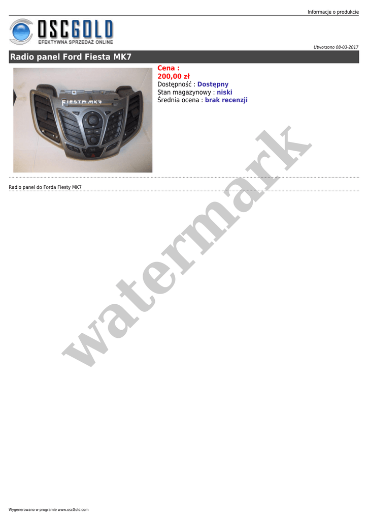 Informacje o produkcie Utworzono 08-03-2017 Radio panel Ford Fiesta MK7 Cena : 200,00 zł w at Radio panel do Forda Fiesty MK7 er m ar k Dostępność : Dostępny Stan magazynowy : niski Średnia ocena : brak recenzji Wygenerowano w programie www.oscGold.com