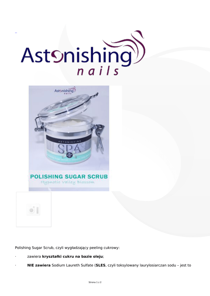 Polishing Sugar Scrub, czyli wygładzający peeling cukrowy: · zawiera kryształki cukru na bazie oleju; · NIE zawiera Sodium Laureth Sulfate (SLES, czyli toksylowany laurylosiarczan sodu – jest to Strona 1 z 2 substancja pokrewna SLS będąca pochodną ropy naftowej o właściwościach silnie spieniających.) oraz Sodium Lauryl Sulfate (SLS, czyli aurylosiarczan sodu jest to silnie myjący i pianotwórczy detergent. Ma właściwości uczulające i drażniące, może powodować wysuszenie skóry) ; · nie zawiera parabenów; · nie zawiera sylikonów; · nie zawiera barwników; · nie zawiera olejów mineralnych; · nadaje się do wszystkich rodzajów skóry; · jest testowany dermatologicznie. Strona 2 z 2