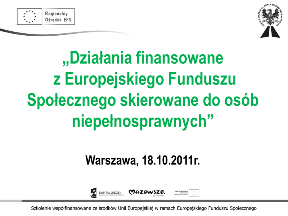 „Działania finansowane z Europejskiego Funduszu Społecznego skierowane do osób niepełnosprawnych” Warszawa, 18.10.2011r. Szkolenie współfinansowane ze środków Unii Europejskiej w ramach Europejskiego Funduszu Społecznego Osoby niepełnosprawne – diagnoza sytuacji zawarta w PO KL (1) „W świetle wyników Narodowego Spisu Powszechnego Ludności i Mieszkań przeprowadzonego przez Główny Urząd Statystyczny w 2002 r. liczba osób niepełnosprawnych w Polsce wynosiła w momencie badania 5,457 mln osób”. „Źródłem utrzymania dla 84% osób niepełnosprawnych są głównie świadczenia społeczne (renty, emerytury, zasiłki). Współczynnik aktywności zawodowej osób niepełnosprawnych od 1994 r. nieustannie maleje i to w tempie szybszym niż dla ogółu zatrudnionych”. „NSP pokazał, że prawie 98% osób niepełnosprawnych żyje w jednoosobowych lub rodzinnych gospodarstwach domowych, a ok. 100 tys. przebywa w obiektach zbiorowego zakwaterowania, w tym w specjalistycznych ośrodkach. Większość osób niepełnosprawnych w Polsce jest bierna zawodowo, a ich potencjał nie jest wykorzystywany przez gospodarkę. Wynika to zarówno z dyskryminacji tej grupy na rynku pracy przez pracodawców, samej postawy osób niepełnosprawnych (bierność, niska motywacja), ale także ze znacznie gorszego wykształcenia i kwalifikacji osób niepełnosprawnych”. Szkolenie współfinansowane ze środków Unii Europejskiej w ramach Europejskiego Funduszu Społecznego Osoby niepełnosprawne – diagnoza sytuacji zawarta w PO KL (2) „Ponad połowa osób niepełnosprawnych posiada najwyżej wykształcenie podstawowe. Osoby niepełnosprawne są zatrudnione głównie na zamkniętym rynku pracy, czyli w zakładach pracy chronionej, gdzie w 2005 r. pracowało ok. 200 tys. osób niepełnosprawnych (40% zatrudnionych ogółem), w tym tylko co druga osoba niepełnosprawna w pełnym wymiarze czasu”. „Ponadto zatrudnienie osób niepełnosprawnych cechuje się stosunkowo dużym zróżnicowaniem regionalnym – najwyższe wartości obserwowane są w województwach z dużym udziałem rolnictwa. W 2005 r. w lubelskim, podlaskim i podkarpackim pracowało około jednej czwartej osób niepełnosprawnych w wieku produkcyjnym, zaś najniższy wskaźnik zatrudnienia odnotowany został w zachodniopomorskim (10,9%)” Szkolenie współfinansowane ze środków Unii Europejskiej w ramach Europejskiego Funduszu Społecznego Sytuacja uczniów niepełnosprawnych – diagnoza sytuacji zawarta w PO KL „W roku szkolnym 2004/2005 funkcjonowało łącznie 2 382 specjalnych szkół podstawowych, gimnazjów i szkół ponadgimnazjalnych, w których kształciło się 103 543 uczniów. W samych szkołach podstawowych dla dzieci i młodzieży w roku szkolnym 2005/2006 uczyło się 78,5 tys. uczniów ze specjalnymi potrzebami edukacyjnymi, co stanowiło 3,0% zbiorowości uczniów szkół podstawowych. Natomiast w oddziałach integracyjnych i ogólnodostępnych szkół podstawowych i gimnazjów kształci się 68 600 uczniów”. „Podstawowym problemem w zakresie dostępności usług edukacyjnych dla osób niepełnosprawnych są trudności, na jakie napotykają uczniowie niepełnosprawni w pokonywaniu drogi do szkoły. (…) W roku szkolnym 2004/2005 dowożonych było 10 876 uczniów.” Szkolenie współfinansowane ze środków Unii Europejskiej w ramach Europejskiego Funduszu Społecznego Priorytety Centralne Poddziałanie 1.3.6 PFRON - projekty systemowe (1) Typ realizowanych operacji (projektów) -ekspertyzy i badania dotyczące diagnozy potrzeb, efektywności form wsparcia oraz aktywizacji zawodowej i społecznej wobec osób niepełnosprawnych, -ogólnokrajowe i ponadregionalne projekty aktywizacji zawodowej i integracji społecznej, skierowane do osób niepełnosprawnych i ich otoczenia (ze szczególnym uwzględnieniem wykorzystania nowoczesnych technologii oraz projektów promujących elastyczne i innowacyjne formy zatrudnienia), - identyfikacja i promocja najlepszych rozwiązań z zakresu pomocy osobom niepełnosprawnym, - kampanie informacyjne skierowane m.in. do pracodawców w celu zachęcania ich do zatrudniania osób niepełnosprawnych. Szkolenie współfinansowane ze środków Unii Europejskiej w ramach Europejskiego Funduszu Społecznego Poddziałanie 1.3.6 PFRON - projekty systemowe (2) Typ beneficjentów: PFRON Grupy docelowe (osoby, instytucje, grupy społeczne bezpośrednio korzystające z pomocy): - osoby niepełnosprawne z rzadko występującymi niepełnosprawnościami i niektórymi niepełnosprawnościami sprzężonymi, - rodziny i najbliższe otoczenie osób niepełnosprawnych, - instytucje i podmioty bezpośrednio realizujące zadania na rzecz osób niepełnosprawnych - pracodawcy, - partnerzy społeczno-gospodarczy. Szkolenie współfinansowane ze środków Unii Europejskiej w ramach Europejskiego Funduszu Społecznego Priorytety Regionalne W roku 2012 w ramach Programu Operacyjnego Kapitał Ludzki zakłada się premiowanie projektów ukierunkowanych na poprawę sytuacji osób niepełnosprawnych w sferze m.in. zatrudnienia i edukacji. Szkolenie współfinansowane ze środków Unii Europejskiej w ramach Europejskiego Funduszu Społecznego PRIORYTET VI Poddziałanie 6.1.3 Poprawa zdolności do zatrudnienia oraz podnoszenie poziomu aktywności zawodowej osób bezrobotnych Beneficjent systemowy :powiatowe urzędy pracy z terenu województwa mazowieckiego Grupę docelową w projekcie, w co najmniej 30 %, stanowią osoby należące do jednej lub kilku poniżej wymienionych grup: - osoby niepełnosprawne; - osoby w wieku poniżej 25. roku życia; osoby w wieku powyżej 50. roku życia. Szkolenie współfinansowane ze środków Unii Europejskiej w ramach Europejskiego Funduszu Społecznego Typ/typy projektów (operacji) realizowane w ramach projektu : Instrumenty i usługi wymienione w ustawie z dnia 20 kwietnia 2004 r. o promocji zatrudnienia i instytucjach rynku pracy (Dz. U. z 2008 r. Nr 69 poz.