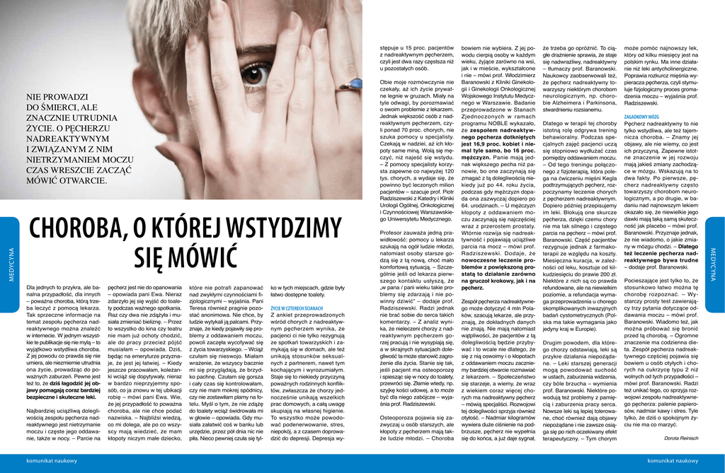 stępuje u 15 proc. pacjentów z nadreaktywnym pęcherzem, czyli jest dwa razy częstsza niż u pozostałych osób. Choroba, o której wstydzimy się mówić Dla jednych to przykra, ale banalna przypadłość, dla innych – poważna choroba, którą trzeba leczyć z pomocą lekarza. Tak sprzeczne informacje na temat zespołu pęcherza nadreaktywnego można znaleźć w internecie. W jednym wszystkie te publikacje się nie mylą – to wyjątkowo wstydliwa choroba. Z jej powodu co prawda się nie umiera, ale niezmiernie utrudnia ona życie, prowadząc do poważnych zaburzeń. Pewne jest też to, że dziś łagodzić jej objawy pomagają coraz bardziej bezpieczne i skuteczne leki. Najbardziej uciążliwą dolegliwością zespołu pęcherza nadreaktywnego jest nietrzymanie moczu i częste jego oddawanie, także w nocy. – Parcie na komunikat naukowy pęcherz jest nie do opanowania – opowiada pani Ewa. Nieraz zdarzyło jej się wyjść do toalety podczas ważnego spotkania. Raz czy dwa nie zdążyła i musiała zmieniać bieliznę. – Przez to wszystko do kina czy teatru nie mam już ochoty chodzić, ale do pracy przecież pójść musiałam – opowiada. Dziś, będąc na emeryturze przyznaje, że jest jej łatwiej. – Kiedy jeszcze pracowałam, koleżanki wciąż się dopytywały, nieraz w bardzo nieprzyjemny sposób, co ja znowu w tej ubikacji robię – mówi pani Ewa. Wie, że jej przypadłość to poważna choroba, ale nie chce podać nazwiska. – Najbliżsi wiedzą, co mi dolega, ale po co wszyscy mają wiedzieć, że mam kłopoty niczym małe dziecko, które nie potrafi zapanować nad zwykłymi czynnościami fizjologicznymi – wyjaśnia. Pani Teresa również pragnie pozostać anonimowa. Nie chce, by ludzie wytykali ją palcami. Przyznaje, że kiedy pojawiły się problemy z oddawaniem moczu, powoli zaczęła wycofywać się z życia towarzyskiego. – Wciąż czułam się nieswojo. Miałam wrażenie, że wszyscy bacznie mi się przyglądają, że brzydko pachnę. Czułam się gorsza i cały czas się kontrolowałam, czy nie mam mokrej spódnicy, czy nie zostawiłam plamy na fotelu. Myśl o tym, że nie zdążę do toalety wciąż świdrowała mi w głowie – opowiada. Gdy musiała załatwić coś w banku lub urzędzie, przez pół dnia nic nie piła. Nieco pewniej czuła się tyl- ko w tych miejscach, gdzie były łatwo dostępne toalety. Życie w czterech ścianach Z ankiet przeprowadzonych wśród chorych z nadreaktywnym pęcherzem wynika, że pacjenci ci nie tylko rezygnują ze spotkań towarzyskich i zamykają się w domach, ale też unikają stosunków seksualnych z partnerem, nawet tym kochającym i wyrozumiałym. Staje się to niekiedy przyczyną poważnych rodzinnych konfliktów, zwłaszcza że chorzy jednocześnie unikają wszelkich prac domowych, a całą uwagę skupiają na własnej higienie. To wszystko może powodować podenerwowanie, stres, niepokój, a z czasem doprowadzić do depresji. Depresja wy- Profesor zauważa jedną prawidłowość: pomocy u lekarza szukają na ogół ludzie młodzi, natomiast osoby starsze godzą się z tą nową, choć mało komfortową sytuacją. – Szczególnie jeśli od lekarza pierwszego kontaktu usłyszą, że „w pana / pani wieku takie problemy się zdarzają i nie powinny dziwić” – dodaje prof. Radziszewski. Radzi jednak nie brać sobie do serca takich komentarzy. – Z analiz wynika, że nieleczeni chorzy z nadreaktywnym pęcherzem gorzej pracują i nie wysypiają się, a w skrajnych sytuacjach dolegliwość ta może stanowić zagrożenie dla życia. Stanie się tak, jeśli pacjent ma osteoporozę i spiesząc się w nocy do toalety, przewróci się. Złamie wtedy, np. szyjkę kości udowej, a to może być dla niego zabójcze – wyjaśnia prof. Radziszewski. Osteoporoza pojawia się zazwyczaj u osób starszych, ale kłopoty z pęcherzem mają także ludzie młodzi. – Choroba Zespół pęcherza nadreaktywnego może dotyczyć 4 mln Polaków, szacują lekarze, ale przyznają, że dokładnych danych nie znają. Nie mają natomiast wątpliwości, że pacjentów z tą dolegliwością będzie przybywać i to wcale nie dlatego, że się z nią oswoimy i o kłopotach z oddawaniem moczu zaczniemy bardziej otwarcie rozmawiać z lekarzem. – Społeczeństwo się starzeje, a wiemy, że wraz z wiekiem coraz więcej chorych ma nadreaktywny pęcherz – mówią specjaliści. Rozwojowi tej dolegliwości sprzyja również otyłość. – Nadmiar kilogramów wywiera duże ciśnienie na podbrzusze, pęcherz nie wypełnia się do końca, a już daje sygnał, że trzeba go opróżnić. To ciągłe drażnienie sprawia, że staje się nadwrażliwy, nadreaktywny – tłumaczy prof. Baranowski. Naukowcy zaobserwowali też, że pęcherz nadreaktywny towarzyszy niektórym chorobom neurologicznym, np. chorobie Alzheimera i Parkinsona, stwardnieniu rozsianemu. Dlatego w terapii tej choroby istotną rolę odgrywa trening behawioralny. Podczas specjalnych zajęć pacjenci uczą się stopniowo wydłużać czas pomiędzy oddawaniem moczu. – Od tego treningu połączonego z fizjoterapią, która polega na ćwiczeniu mięśni Kegla podtrzymujących pęcherz, rozpoczynamy leczenie chorych z pęcherzem nadreaktywnym. Dopiero później przepisujemy im leki. Blokują one skurcze pęcherza, dzięki czemu chory nie ma tak silnego i częstego parcia na pęcherz – mówi prof. Baranowski. Część pacjentów rezygnuje jednak z farmakoterapii ze względu na koszty. Miesięczna kuracja, w zależności od leku, kosztuje od kilkudziesięciu do prawie 200 zł. Niektóre z nich są co prawda refundowane, ale na niewielkim poziomie, a refundacja wymaga przeprowadzenia u chorego skomplikowanych inwazyjnych badań cystometrycznych (Polska ma takie wymagania jako jedyny kraj w Europie). Drugim powodem, dla którego chorzy odstawiają, leki są przykre działania niepożądane. – Leki starszej generacji mogą powodować suchość w ustach, zaburzenia widzenia, cz