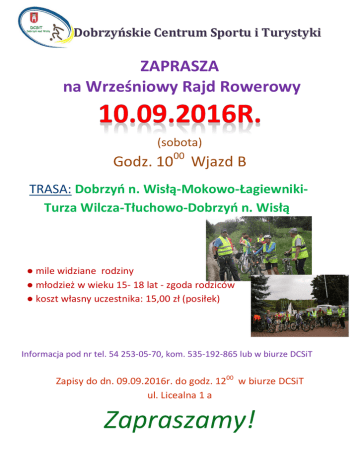Dobrzyńskie Centrum Sportu i Turystyki ZAPRASZA na Wrześniowy Rajd Rowerowy (sobota) Godz. 10 00 Wjazd B TRASA: Dobrzyń n. Wisłą-Mokowo-ŁagiewnikiTurza Wilcza-Tłuchowo-Dobrzyń n. Wisłą ● mile widziane rodziny ● młodzież w wieku 15- 18 lat - zgoda rodziców ● koszt własny uczestnika: 15,00 zł (posiłek) Informacja pod nr tel. 54 253-05-70, kom. 535-192-865 lub w biurze DCSiT Zapisy do dn. 09.09.2016r. do godz. 1200 w biurze DCSiT ul. Licealna 1 a Zapraszamy!