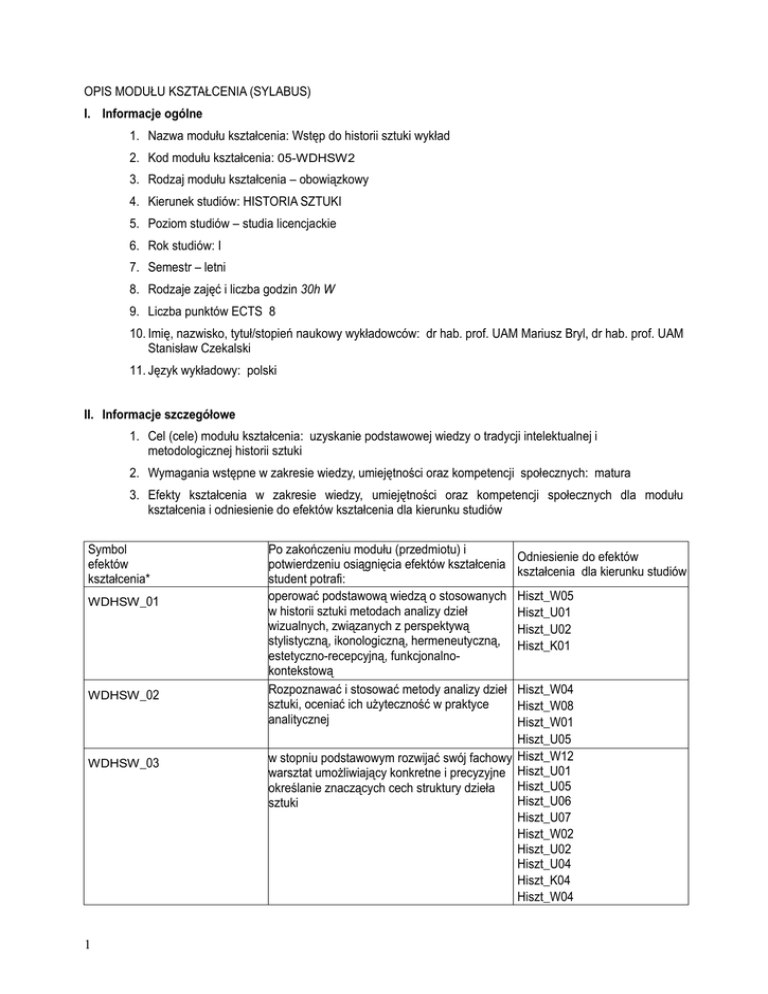 OPIS MODUŁU KSZTAŁCENIA (SYLABUS) I. Informacje ogólne 1. Nazwa modułu kształcenia: Wstęp do historii sztuki wykład 2. Kod modułu kształcenia: 05-WDHSW2 3. Rodzaj modułu kształcenia – obowiązkowy 4. Kierunek studiów: HISTORIA SZTUKI 5. Poziom studiów – studia licencjackie 6. Rok studiów: I 7. Semestr – letni 8. Rodzaje zajęć i liczba godzin 30h W 9. Liczba punktów ECTS 8 10. Imię, nazwisko, tytuł/stopień naukowy wykładowców: dr hab. prof. UAM Mariusz Bryl, dr hab. prof. UAM Stanisław Czekalski 11. Język wykładowy: polski II. Informacje szczegółowe 1. Cel (cele) modułu kształcenia: uzyskanie podstawowej wiedzy o tradycji intelektualnej i metodologicznej historii sztuki 2. Wymagania wstępne w zakresie wiedzy, umiejętności oraz kompetencji społecznych: matura 3. Efekty kształcenia w zakresie wiedzy, umiejętności oraz kompetencji społecznych dla modułu kształcenia i odniesienie do efektów kształcenia dla kierunku studiów Symbol efektów kształcenia* WDHSW _01 WDHSW _02 WDHSW _03 1 Po zakończeniu modułu (przedmiotu) i potwierdzeniu osiągnięcia efektów kształcenia student potrafi: operować podstawową wiedzą o stosowanych w historii sztuki metodach analizy dzieł wizualnych, związanych z perspektywą stylistyczną, ikonologiczną, hermeneutyczną, estetyczno-recepcyjną, funkcjonalnokontekstową Rozpoznawać i stosować metody analizy dzieł sztuki, oceniać ich użyteczność w praktyce analitycznej Odniesienie do efektów kształcenia dla kierunku studiów Hiszt_W05 Hiszt_U01 Hiszt_U02 Hiszt_K01 Hiszt_W04 Hiszt_W08 Hiszt_W01 Hiszt_U05 w stopniu podstawowym rozwijać swój fachowy Hiszt_W12 warsztat umożliwiający konkretne i precyzyjne Hiszt_U01 Hiszt_U05 określanie znaczących cech struktury dzieła Hiszt_U06 sztuki Hiszt_U07 Hiszt_W02 Hiszt_U02 Hiszt_U04 Hiszt_K04 Hiszt_W04 Hiszt_W08 WDHSW _04 ujmować miejsce historii sztuki i jej teoretycznych i metodologicznych założeń w kontekście innych nauk humanistycznych Hiszt_W01 Hiszt_W04 Hiszt_W08 Hiszt_U05 4. Treści kształcenia Nazwa modułu kształcenia: Symbol treści kształcenia* TK_01 TK_02 TK_03 TK_04 TK_05 TK_06 Opis treści kształcenia Wykład przekazuje i porządkuje podstawową wiedzę o stosowanych w historii sztuki metodach analizy dzieł wizualnych, związanych z perspektywą stylistyczną, ikonologiczną, hermeneutyczną, estetyczno-recepcyjną, funkcjonalno-kontekstową, semiologiczną Rudymenty współczesnego warsztatu analitycznego dyscypliny prezentowane są na tle jej tradycji intelektualnej i metodologicznej, sięgającej podstaw koncepcji przedstawiania, sposobu znaczenia i rozumienia przedstawień obrazowych Najważniejsze metody analizy dzieł omawiane są w związku z inspiracjami czerpanymi przez historię sztuki z innych obszarów wiedzy, takich jak filozofia, psychologia, nauka o literaturze Omówienie użytecznych metod analizy na konkretnych przykładach wykształca umiejętność ich samodzielnego stosowania Wykład buduje świadomość teoretyczną i metodologiczną dotyczącą historii sztuki jako nauki humanistycznej Wykład buduje fachowy warsztat umożliwiający konkretne i precyzyjne określanie znaczących cech struktury dzieł wizualnych, odczytywanie ich znaczeń oraz zobiektywizowaną ocenę ich jakości artystycznej Odniesienie do efektów kształcenia modułu# WDHSW _01 WDHSW _02 WDHSW _01 WDHSW _03 WDHSW _04 WDHSW _01 WDHSW _04 WDHSW _01 WDHSW _02 WDHSW _03 WDHSW _01 WDHSW _04 WDHSW _02 WDHSW _03 5. Zalecana literatura: H. Wölfflin, Podstawowe pojęcia historii sztuki. Problem rozwoju stylu w sztuce nowożytnej, Wrocław 1962 E. H. Gombrich, Sztuka i złudzenie. O psychologii przedstawiania obrazowego, Warszawa 1981 E. Panofsky, Ikonografia i ikonologia, w: tegoż, Studia z historii sztuki, Warszawa 1971 S. Pazura, Struktura i sacrum. Estetyka sztuk plastycznych Hansa Sedlmayra, w: Sztuka i społeczeństwo, t. 1: Ocalenie przez sztukę, red. A. Kuczyńska, Warszawa 1973 M. Bryl, Płaszczyzna, ogląd, absolut. Inspiracje hermeneutyczne we współczesnej historii sztuki, „Artium Quaestiones" VI, 1993 R. Arnheim, Sztuka i percepcja wzrokowa. Psychologia twórczego oka, Warszawa 1978 2 M. Imdahl, Składnia i semantyka obrazu. O „Karcie Setnika" z Kodeksu Egberta, „Quart", 2/2010 M. Imdahl, Giotto. Z zagadnień ikonicznej struktury sensu, „Artium Quaestiones" IV, 1990 (przedruk w: Perspektywy współczesnej historii sztuki. Antologia przekładów „Artium Quaestiones", Poznań 2009) M. Bryl, Obraz i widz. O nowej książce Wolfganga Kempa, „Artium Quaestiones" IV, 1990 W. Kemp, Dzieło sztuki i widz: metoda estetyczno-recepcyjna, w: Perspektywy współczesnej historii sztuki... U. Eco, Pejzaż semiotyczny, Warszawa 1972 (lub odpowiednie fragmenty książki Nieobecna struktura, Warszawa 1996) R. Barthes, Podstawy semiologii, Kraków 2009 Z. Waźbiński, Wstęp, [w:] Vasari i nowożytna historiografia sztuki, Wrocław 1975 s. 995 J. J. Winckelmann, Myśli o naśladowaniu greckich rzeźb i malowideł, w: Teoretycy, artyści i krytycy o sztuce, 1700-1870, red. E. Grabska i M. Poprzęcka, Warszawa 1974 J. J. Winckelmann, Opis Torsa w rzymskim Belwederze, tamże J. Burckhardt, Kultura Odrodzenia we Włoszech, Warszawa 1961 (1968, 1991) E. H. Gombrich, W poszukiwaniu historii kultury, w: Pojęcia, problemy, metody współczesnej nauki o sztuce, Warszawa 1976 K. Piwocki, Pierwsza nowoczesna historia sztuki. Poglądy Aloisa Riegla, Warszawa 1970; s. 37-95 Aby Warburg, Mnemosyne. Wprowadzenie do Atlasu Pamięci, „Stan Rzeczy”, 2015, (nr 8), s. 35-51 Aby Warburg, „Śniadanie na trawie” Maneta. Wzorotwórcza funkcja pogańskich bóstw elementarnych dla nowoczesnego odczucia natury, „Konteksty", 2011, nr 2-3, s. 110-119 Aby Warburg, Narodziny Wenus i inne szkice renesansowe, Gdańsk 2010 (jeden tekst do wyboru) Jan Białostocki, Posłanie Aby Warburga: historia sztuki czy historia kultury?, w: tegoż, Refleksje i syntezy ze świat