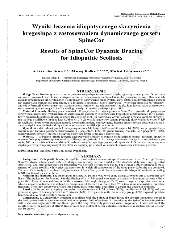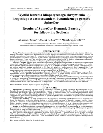 tio np roh ibit ed . Wyniki leczenia idiopatycznego skrzywienia kręgosłupa z zastosowaniem dynamicznego gorsetu SpineCor Results of SpineCor Dynamic Bracing for Idiopathic Scoliosis ibu Aleksander Szwed(E,F), Maciej Kołban(A,B,D,E,F), Michał Jałoszewski(A,B,E) STRESZCZEnIE dis tr Klinika Ortopedii i Traumatologii Dziecięcej Pomorskiej Akademii Medycznej, Szczecin, Polska Department of Paediatric Orthopaedics and Traumatology, Pomeranian Medical University, Szczecin, Poland rso na lu se on ly - Wstęp. W zachowawczym leczeniu skrzywienia kręgosłupa zastosowanie znajdują gorsety ortopedyczne. Od niedawna poza sztywnymi konstrukcjami dostępne są tzw. gorsety dynamiczne SpineCor o elastycznej konstrukcji. Działanie ich zakłada przeniesienie sił derotujących i korygujących skrzywienie przez system taśm. Istotą tego dynamicznego gorsetu jest zachowanie ruchomości kręgosłupa, a jednocześnie uzyskanie pozycji korygującej wszystkie składowe trójpłaszczyznowej deformacji. Celem pracy jest wczesna ocena wyników leczenia pacjentów ze skoliozą idiopatyczną z zastosowaniem gorsetu dynamicznego SpineCor według metody i kryteriów podanych przez SRS. Materiał i metody. Badaną grupę stanowiło 50 pacjentów leczonych gorsetem SpineCor z powodu idiopatycznego skrzywienia kręgosłupa. Wskazaniem do zastosowania gorsetu było skrzywienie kręgosłupa przekraczające 15° u pacjentów z brakiem dojrzałości układu kostnego (test Rissera 0-3). Za pozytywny wynik leczenia przyjęto korekcję skrzywienia lub jego stabilizację (zmiana kąta Cobb’a +/- 5°). Za wynik negatywny uznano progresję skrzywienia powyżej 5° lub do wielkości, która wymuszała konieczność wykonania zabiegu operacyjnego. Badaną grupę chorych podzielono w zależności od płci oraz wielkości skrzywienia w momencie kwalifikacji do leczenia. Wyniki. W całej badanej grupie korekcję uzyskano u 24 chorych (48%), stabilizację u 14 (28%), zaś progresję skrzywienia mimo leczenia gorsetem obserwowano u 7 pacjentów (14%). W grupie badanej znalazło się 5 pacjentów (10%), u których zastosowano leczenie operacyjne z powodu szybkiej progresji krzywienia. Wnioski. 1. W badanej grupie leczenie zachowawcze skoliozy w okresie niedojrzałości kostnej gorsetem SpineCor w około 70% przypadków spowodowało stabilizację skrzywienia. 2. Rozpoczęcie leczenia u chorych ze skrzywieniem powyżej 20° i wskaźnikiem Rissera od 0 do 3 bardzo skutecznie zapobiega progresji skrzywienia. 3. Do ostatecznej oceny niezbędna jest weryfikacja uzyskanych wyników co najmniej po 2 latach od momentu zakończenia leczenia gorsetem. pe Słowa kluczowe: skolioza, SpineCor, gorset dynamiczny SUMMARY Th is c op y is for Background. Orthopaedic bracing is used in conservative treatment of spinal curvatures. Apart from rigid braces, SpineCor dynamic braces with a flexible design have recently become available. The idea behind dynamic bracing is that derotational and correcting forces are transmitted via a system of corrective bands. The essence of this technique is maintenance of spine mobility while effecting a position in which all components of the three-plane deformity are corrected. The aim of this study is to evaluate early outcomes of SpineCor dynamic brace treatment for idiopathic scoliosis according to SRS methodology and criteria. Material and methods. The study group included 50 patients who were using SpineCor braces due to idiopathic scoliosis. The indication for bracing was the finding of a >15⑤ spinal curvature in skeletally immature patients (Risser grade 0-3). Correction or stabilization of the scoliosis (Cobb angle change of +/- 5°) were recognised as positive outcomes, while a negative outcome was defined as progression of the curve of more than 5° or to a value necessitating operative treatment. The study group was divided into subgroups at enrolment, according to gender and degree of scoliosis. Results. In the entire study group, correction was demonstrated in 24 patients (48%), stabilization in 14 (28%) and progression in spite of bracing occurred in 7 patients (14%). Five patients in the entire study group (10%) required operative treatment due to rapid curvature progression. Conclusions. 1. Conservative treatment of scoliosis with the SpineCor brace during the skeletal immaturity period in the study group leads to curvature stabilization in approx. 70% of patients. 2. Introducing the SpineCor brace in patients with a scoliosis angle over 20° and Risser grade 0-3 very effectively prevented curve progression. 3. Verification of the results needs to be carried out after at least 2 years post-treatment before definitive conclusions regarding bracing efficacy can be drawn. Key words: scoliosis, SpineCor, dynamic bracing - This copy is for personal use only - distribution prohibited. - This copy is for personal use only - distribution prohibited. - This copy is for personal use only - distribution prohibited. - This copy is for personal use only - distribution prohibited. O r t o p e d i a Traumatologia Rehabilitacja © MEDSPORTPRESS, 2009; 5(6); Vol. 11, 427-432 ARTYKUŁ ORYGINALNY / ORIGINAL ARTICLE 427 tio np roh ibit ibu dis tr ly - on se lu rso na pe MATERIAŁ I METODY MATERIAL AnD METHODS Badaną grupę stanowiło 50 pacjentów, z czego 45 osób to dziewczynki, a 5 chłopcy. Średnia wieku wynosiła 12,9 roku. Wskazaniem do rozpoczęcia leczenia było skrzywienie o kącie Cobb’a powyżej 15°, przy teście Rissera 0-3. Całkowity okres leczenia nie był krótszy niż 18 miesięcy. Przy kwalifikacji chorych analizowano wyniki badania klinicznego i radiologicznego. Wykonywano badanie radiologiczne całego kręgosłupa w projekcji a-p oraz bocznej, na stojąco, przed założeniem gorsetu, po jego założeniu, oraz w okresie obserwacji co 6 miesięcy, wykreślając kąt skrzywienia wg Cobb’a. The study group included 50 patients (45 girls, 5 boys) with an average age of 12.9 years. The indicatio