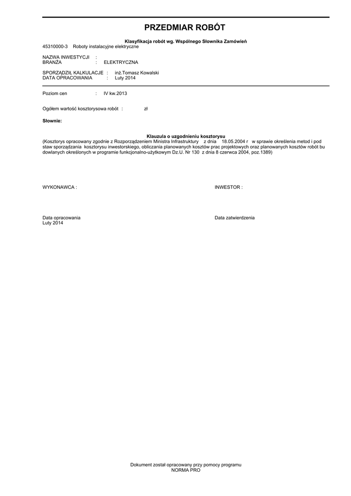 PRZEDMIAR ROBÓT 45310000-3 Klasyfikacja robót wg. Wspólnego Słownika Zamówień Roboty instalacyjne elektryczne NAZWA INWESTYCJI BRANŻA : : ELEKTRYCZNA SPORZĄDZIŁ KALKULACJE : DATA OPRACOWANIA : Poziom cen : inż.Tomasz Kowalski Luty 2014 IV kw.2013 Ogółem wartość kosztorysowa robót : zł Słownie: Klauzula o uzgodnieniu kosztorysu (Kosztorys opracowany zgodnie z Rozporządzeniem Ministra Infrastruktury z dnia 18.05.2004 r w sprawie określenia metod i pod staw sporządzania kosztorysu inwestorskiego, obliczania planowanych kosztów prac projektowych oraz planowanych kosztów robót bu dowlanych określonych w programie funkcjonalno-użytkowym Dz.U. Nr 130 z dnia 8 czerwca 2004, poz.1389) WYKONAWCA : INWESTOR : Data opracowania Luty 2014 Data zatwierdzenia Dokument został opracowany przy pomocy programu NORMA PRO Oświetlenie zew. USS nr2 w Jastrzębiu Zdroju -AKTUALIZACJAOBMIAR Lp. Podstawa Opis i wyliczenia 1 MODRENIZACJA ROZDZIELNI RNN 1 KNR-W 4-03 Demontaż podstawy bezpiecznika mocy 400A d.1 1121-14 analogia 1 j.m. szt. mb 3 KNNR 5 d.1 0406-01 analogia Rozłącznik bezpiecznikowy RBK 160 szt. 1 szt. Rozłącznik bezpiecznikowy RBK 250 szt. 1 szt. 2 5 KNR 5-10 d.2 0114-01 6 KNR 5-10 d.2 0108-01 7 KNNR 5 d.2 0113-01 8 KNR 5-08 d.2 0608-07 3 9 KNNR 5 d.3 0407-04 10 KNNR 5 d.3 0407-03 11 KNNR 5 d.3 0407-04 mb LINIE ZASILAJĄCE Układanie kabli wielożyłowych o masie do 0.5 kg/m na napięcie znamionowe poniżej 110 kV w rurach pustakach lub kanałach zamkniętych Kabel elektroenergetyczny miedziany YKY żo 3x6, 1 kV 440 m m Rury ochronne z PCW o śr.do 80 mm Rura ochronna PCV 50 430 m Układanie bednarki w rowach kablowych - bednarka do 120 mm2 Taśma Fe/Zn 25x4 400 m m m m szt. Rozłącznik lub wyłącznik przeciwporażeniowy 1 (2)-biegunowy w rozdzielnicach Rozłącznik bezp. np. R301 , 63/16A, 1-bieg 2 szt. Rozłącznik lub wyłącznik przeciwporażeniowy 3 (4)-biegunowy w rozdzielnicach Stycznik mocy 4-bieg. 25A, c.230VAC. 1 szt. szt. szt. szt. 13 KNNR 5 d.3 0407-04 Wyłącznik różnicowo-prąd., P304, 25A, 30mA szt. 1 szt. Wyłącznik nadprądowy 1-biegunowy w rozdzielnicach Wyłącznik nadmiarowy S 311, C2 1 szt. szt. szt. 15 Przekaźnik zmierzchowy astronomiczny 230VAC,2z d.3 kalk. własna 1 szt. 16 Przełącznik 16A, 1-bieg. d.3 kalk. własna 1 szt. Norma PRO Wersja 4.33 Nr seryjny: 23088 szt. szt. -2- 1.000 1.500 RAZEM 1.500 1.000 RAZEM 1.000 1.000 RAZEM 1.000 440.000 RAZEM 440.000 15.000 RAZEM 15.000 430.000 RAZEM 430.000 400.000 RAZEM 400.000 1.000 RAZEM 1.000 2.000 RAZEM 2.000 1.000 RAZEM 1.000 2.000 RAZEM 2.000 1.000 RAZEM 1.000 1.000 RAZEM 1.000 1.000 RAZEM 1.000 1.000 RAZEM 1.000 szt. 12 Dostawa i montaż bezpiecznika DO2 zwłoczne, 16A d.3 kalk. własna 2 14 KNNR 5 d.3 0407-01 1.000 RAZEM m Ręczne układanie kabli wielożyłowych o masie do 0.5 kg/m na napięcie znamionowe poniżej 110 kV w kanałach odkrywanych z mocowaniem Kabel elektroenergetyczny miedziany YKY żo 5x6, 1 kV 15 TABLICA TOZ Rozłącznik lub wyłącznik przeciwporażeniowy 3 (4)-biegunowy w rozdzielnicach Rozłącznik manewr.. 63A, 3-bieg 1 Razem szt. 2 Demontaż oszynowania AP. 30x4 d.1 kalk. własna 1.5 4 KNNR 5 d.1 0406-01 analogia Poszcz Oświetlenie zew. USS nr2 w Jastrzębiu Zdroju -AKTUALIZACJAOBMIAR Lp. Podstawa 17 KNNR 5 d.3 0407-01 analogia 18 KNNR 5 d.3 0403-01 4 19 KNNR 5 d.4 1001-01 20 KNNR 5 d.4 1004-01 Opis i wyliczenia Lampka sygnalizac. neonowa 230V j.m. szt. 3 szt. Szafa z tworzywa sztucznego szerok.260 wysok.800, głęb. 250 z fundamentem szt. do ustawienia na zewnątrz 1 szt. OŚWIETLENIE CHODNIKÓW Słup oświetleniowy stalowy, stożkowy 4,5 m Fundament prefabrykowany F-100 14 Poszcz 3.000 RAZEM 3.000 1.000 RAZEM 1.000 14.000 RAZEM 14.000 14.000 RAZEM 14.000 14.000 RAZEM 14.000 szt. szt. Oprawa oświetlenia parkowego 100W, 230V Lampa metal-halogenowa 100W, 230V 14 szt. szt. 21 Skrzynka zaciskowa 1 obwodowa C2 d.4 kalk. własna 14 szt. 22 KNNR 5 d.4 1003-01 kpl.prz ew. szt. Montaż przewodów do opraw oświetleniowych - wciąganie w słupy i rury osłonowe przy wysokości latarń do 4 m bez wysięgnika Przewód YDYżo 3x1,5mm2 -200 mb 14 kpl.prz ew. 14.000 RAZEM 5 23 KNR 2-01 d.5 0702-0201 24 KNR 2-01 d.5 0702-0202 25 KNR 2-01 d.5 0705-0202 26 KNR 2-01 d.5 0705-0203 27 KNR 5-10 d.5 0301-01 28 KNR 2-01 d.5 0236-02 29 KNNR 5 d.5 1302-04 30 KNNR 5 d.5 0726-05 31 KNNR 5 d.5 1203-11 32 KNNR 5 d.5 1203-08 33 KNNR 5 d.5 1301-01 ROBOTY UZUPEŁNIAJĄCE Kopanie koparkami podsiębiernymi rowów dla kabli o głębokości do 0.6 m i szer. dna do 0.4 m w gruncie kat. III-IV 430 m m Mechaniczne zasypywanie rowów dla kabli o głębokości do 0.6 m i szer. dna do 0.4 m w gruncie kat. III-IV 430 m Mechaniczne zasypywanie rowów dla kabli o głębokości do 0.8 m i szer. dna do 0.4 m w gruncie kat. III-IV 55 m Nasypanie warstwy piasku grubości 0.1 m na dno rowu kablowego o szer.do 0.4 m Krotność = 2 430+55 m Zagęszczenie wykpów ubijakami mechanicznymi; grunty spoiste kat. III-IV m3 0.60 * 0.40 * 430.00 + 0.40 * 0.80 * 55.00 m3 Badanie linii kablowej N.N.- kabel 5-żyłowy odc. 3 odc. m m m m Zarobienie na sucho końca kabla 3-żyłowego o przekroju żył do 16 mm2 na na- szt. pięcie do 1 kV o izolacji i powłoce z tworzyw sztucznych 48+14 szt. Podłączenie przewodów kabelkowych o przekroju żyły do 16 mm2 pod zaciski lub bolce Kabel 5x6 mm2 168 430.000 RAZEM 430.000 55.000 RAZEM 55.000 430.000 RAZEM 430.000 55.000 RAZEM 55.000 485.000 RAZEM 485.000 120.800 RAZEM 120.800 3.000 RAZEM 3.000 62.000 RAZEM 62.000 168.000 RAZEM 168.000 75.000 RAZEM 75.000 2.000 RAZEM 2.000 szt.żył szt.żył Podłączenie przewodów kabelkowych o przekroju żyły do 2.5 mm2 pod zaciski szt.żył lub bolce 75 szt.żył Sprawdzenie i pomiar 1-fazowego obwodu elektrycznego niskiego napięcia pomiar 2 pomiar -3- 14.000 m Kopanie koparkami podsiębiernymi rowów dla kabli o głębokości do 0.8 m i szer. dna do 0.4 m w gruncie kat. III-IV 55 Norma PRO Wersja 4.33 Nr seryjny: 23088 Razem Oświetlenie zew. 