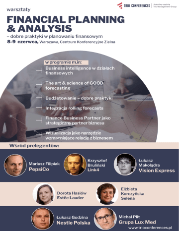 warsztaty FINANCIAL PLANNING & ANALYSIS – dobre praktyki w planowaniu finansowym 8-9 czerwca, Warszawa, Centrum Konferencyjne Zielna w programie m.in: Business intelligence w działach finansowych The art & science of GOOD forecasting Budżetowanie – dobre praktyki Integracja rolling forecasts Finance Business Partner jako strategiczny partner biznesu Wizualizacja jako narzędzie wzmacniające relację z biznesem Wśród prelegentów: Mariusz Filipiak PepsiCo Krzysztof Bruliński Link4 Dorota Hasiów Estee Lauder Łukasz Godzina Nestle Polska GOVERNANCE, CZYLI OD Łukasz Makolądra CZEGO ZACZĄĆ Vision Express Elżbieta Korczyńska Selena Michał Plit Grupa Lux Med www.trioconferences.pl Rozwój narzędzi business intelligence w działach finansowych to nie bez powodu jeden z najbardziej newralgicznych etapów podróży analitycznej organizacji. Transformacja działów finansowych w kierunku strategicznego partnera całego biznesu staje się faktem, a ilość czasu poświęcana na analizy w działach finansów rośnie z roku na rok. Wysiłki skupiają się na zwiększeniu trafności procesu prognozowania i śledzeniu tych elementów biznesu, które mają kluczowy wpływ na wynik finansowy. Warsztaty stanowią niepowtarzalną okazję, by sprawdzić jak wygląda planowanie finansowe w innych organizacjach, jakie są dobre praktyki związane z procesem budżetowania i prognozowania oraz jakie korzyści oferuje biznesowi finance business partnering. Wśród prowadzących ekspertów znajdziecie Państwo przedstawicieli firm: PepsiCo, Link4, Vision Express, Grupa LUX MED, Estee Lauder, Selena, Nestle Polska i inni: Do udziału zapraszamy przedstawicieli działów: financial planning&analysis finansów kontrolingu planowania i prognozowania W programie m.in.: Narzędzia business intelligence w działach finansowych Transformacja działu finansowego i jego nowa strategiczna funkcja Budżetowanie – cykl governance i integracja rolling forecasts Forecasting – jak stworzyć kulturę ciągłego prognozowania i doskonalić proces KPI &Financial performance Raportowanie i wizualizacja danych Serdecznie zapraszam do udziału! Marta Pawlikowska / Project Director kom. 519 047 625 [email protected] Dzień Pierwszy / 8 CZERWCA ŚRODA 9:30 Poranna kawa i rejestracja 10:00 Powitanie uczestników i rozpoczęcie warsztatów 10:00 BI w finansach vs. BI w biznesie – szersze spojrzenie na efektywne Business Intelligence w firmie Paweł Cieśla, Team Lider of Finance Business Intelligence Systems, ABB Group 10:45 Kalendarz budżetowania i planowania – planowanie w macierzowej strukturze grupy Kluczowe etapy procesu budżetowania; metody tworzenia założeń modelu Monitorowanie wyników: częstotliwość, kto i w jakim stopniu jest zaangażowany, kluczowe spotkania i ich agenda Słabe i mocne strony goverance cycle Ryzyka związane z procesem tradycyjnego budżetowania Automatyzacja&analytics - jak zredukować czas przygotowania budżetu, by poświęcić go na analizy Elżbieta Korczyńska, Dyrektor Działu Skarbca, Selena 11:45 The art & science of GOOD forecasting Zasady efektywnego procesu prognozowania - planning cycle Jak wykorzystać BIG Data do wzmocnienia prognozowania ? Prognozowanie długo - i krótkoterminowe Driver based planning – jak to podejście wspiera proces prognozowania Forecast decision support system - jak ustawić proces: standardy, ludzie i narzędzia, by sprzyjał kulturze ciągłego doskonalenia precyzyjności prognozowania Mariusz Filipiak, Headquarter Business Unit Planning Manager Europe&Africa, PepsiCo 12:30 Integracja Rolling Forecasts Kiedy warto rozważyć wykorzystanie RF 5 głównych zasad RF Kultura ciągłego planowania (Continous resource allocation/ relative performance targets) Rolling Forecasting vs. Budgeting Forecasts vs targets – jak wykorzystać prognozy do wyznaczenia konstruktywnych celów Case study Dorota Hasiów, Business Manager, Estee Lauder 14:00 Pricing – klucz do budowy wartości Cena jako kluczowy element budowania wartości Zintegrowane podejście do zarządzania cenami (Dynamika rynkowa->Wartość dlaKlienta->Transakcja) Narzędzia analityczne i wdrożeniowe Łukasz Makolądra, Finance Manager, Vision Express 15:00 Zakończenie I dnia warsztatów Dzień Drugi / 9 CZERWCA CZWARTEK 10:00 Finance Business Partner jako Strategiczny Doradca Biznesu Idea business partneringu – dostarczanie finansowych insightów, wskazywanie kierunków poprawy wyników, optymalizacja okazji biznesowych Analizy finansowe jako baza podejmowania decyzji biznesowych Korzyści i potencjalne zagrożenia Best practices Krzysztof Bruliński, Financial Planning Director & Head of Business Partnering Department, Link4 10:45 Finance transformation 2.0 – strategiczna rola działu finansów Nowy model operacyjny działu finansów - rosnące wymagania względem wiedzy i kompetencji Rola zintegrowanej architektury informacji Planowanie strategiczne w kontekście FP&A Zgodność planów operacyjnych ze strategią Case study 11:45 Key Performance Indicators & Financial Performance Dobór właściwych wskaźników do analiz (znaczący wpływ na biznes, dające się kontrolować i regularnie mierzone) Balansed scorecard, lean six sigma, rozwiązania własne – które podejście wybrać Integracja danych i spójny widok na biznes na wszystkich raportujących poziomach Case study Michał Plit,Dyrektor Departamentu Analiz Strategicznych, LUX-MED 12:30 ‘A co jeśli’ – analiza scenariuszy jako strategiczne narzędzie wspomagające planowanie Co oferuje analiza scenariuszy Przewidywanie jako support procesu prognozowania Wartość dodana z continous foresight Case study 14:00 Raportowanie i wizualizacja danych Od data reporting do data analytics&results Raportowanie finansowe: data governance and control Raportowanie dla top managementu – dobre praktyki Jak wykorzystać wizualizację, by uwypuklić kluczowe dane Storytelling – wartość dodana w prezentacji danych Next 
