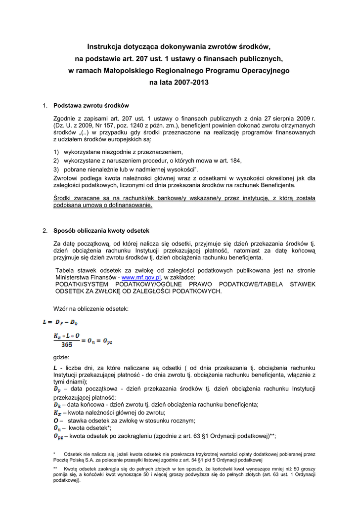 Instrukcja dotycząca dokonywania zwrotów środków, na podstawie art. 207 ust. 1 ustawy o finansach publicznych, w ramach Małopolskiego Regionalnego Programu Operacyjnego na lata 2007-2013 1. Podstawa zwrotu środków Zgodnie z zapisami art. 207 ust. 1 ustawy o finansach publicznych z dnia 27 sierpnia 2009 r. (Dz. U. z 2009, Nr 157, poz. 1240 z późn. zm.), beneficjent powinien dokonać zwrotu otrzymanych środków „(..) w przypadku gdy środki przeznaczone na realizację programów finansowanych z udziałem środków europejskich są: 1) wykorzystane niezgodnie z przeznaczeniem, 2) wykorzystane z naruszeniem procedur, o których mowa w art. 184, 3) pobrane nienaleŜnie lub w nadmiernej wysokości”. Zwrotowi podlega kwota naleŜności głównej wraz z odsetkami w wysokości określonej jak dla zaległości podatkowych, liczonymi od dnia przekazania środków na rachunek Beneficjenta. Środki zwracane są na rachunki/ek bankowe/y wskazane/y przez instytucję, z którą została podpisana umowa o dofinansowanie. 2. Sposób obliczania kwoty odsetek Za datę początkową, od której nalicza się odsetki, przyjmuje się dzień przekazania środków tj. dzień obciąŜenia rachunku Instytucji przekazującej płatność, natomiast za datę końcową przyjmuje się dzień zwrotu środków tj. dzień obciąŜenia rachunku beneficjenta. Tabela stawek odsetek za zwłokę od zaległości podatkowych publikowana jest na stronie Ministerstwa Finansów - www.mf.gov.pl, w zakładce: PODATKI/SYSTEM PODATKOWY/OGÓLNE PRAWO PODATKOWE/TABELA STAWEK ODSETEK ZA ZWŁOKĘ OD ZALEGŁOŚCI PODATKOWYCH. Wzór na obliczenie odsetek: gdzie: L - liczba dni, za które naliczane są odsetki ( od dnia przekazania tj. obciąŜenia rachunku Instytucji przekazującej płatność - do dnia zwrotu tj. obciąŜenia rachunku beneficjenta, włącznie z tymi dniami); – data początkowa - dzień przekazania środków tj. dzień obciąŜenia rachunku Instytucji przekazującej płatność; – data końcowa - dzień zwrotu tj. dzień obciąŜenia rachunku beneficjenta; – kwota naleŜności głównej do zwrotu; O – stawka odsetek za zwłokę w stosunku rocznym; – kwota odsetek*; – kwota odsetek po zaokrągleniu (zgodnie z art. 63 §1 Ordynacji podatkowej)**; * Odsetek nie nalicza się, jeŜeli kwota odsetek nie przekracza trzykrotnej wartości opłaty dodatkowej pobieranej przez Pocztę Polską S.A. za polecenie przesyłki listowej zgodnie z art. 54 §1 pkt 5 Ordynacji podatkowej ** Kwotę odsetek zaokrągla się do pełnych złotych w ten sposób, Ŝe końcówki kwot wynoszące mniej niŜ 50 groszy pomija się, a końcówki kwot wynoszące 50 i więcej groszy podwyŜsza się do pełnych złotych (art. 63 ust. 1 Ordynacji podatkowej). Przykład obliczania odsetek: – 1 000,00 zł – data: 1 marzec 2011 – data: 1 kwiecień 2011 O –12,5% =32 3. Elementy opisu przelewu dokonującego zwrotu środków Opis zwrotu powinien zawierać w szczególności: 1. 2. 3. 4. 5. numer projektu; nr zlecenia otrzymanej z BGK płatności lub datę i kwotę otrzymanej płatności; określenie czy kwota zwrotu to naleŜność główna czy odsetki; jeśli dotyczy - wskazanie rodzaju odsetek (umowne, karne, bankowe itp.); tytuł zwrotu (np. zwrot zaliczki, przychodu z projektu, korekty finansowej itp.), a w przypadku dokonania zwrotu środków na podstawie decyzji, o której mowa w art. 207 ustawy o finansach publicznych, takŜe numer decyzji, 6. klasyfikacja budŜetowa. PowyŜsze informacje powinny być umieszczane na kaŜdym zwrocie, takŜe w przypadku dokonywania zwrotu środków z tytułu współfinansowania. Zastosowanie się do powyŜszych zaleceń umoŜliwi sprawniejsze (szybsze) rozliczenie środków wskazanych we wnioskach o płatność przedkładanych przez beneficjentów, a tym samym skróci czas przekazania na rachunek bankowy beneficjenta kolejnej wypłaty środków (zaliczki/refundacji).