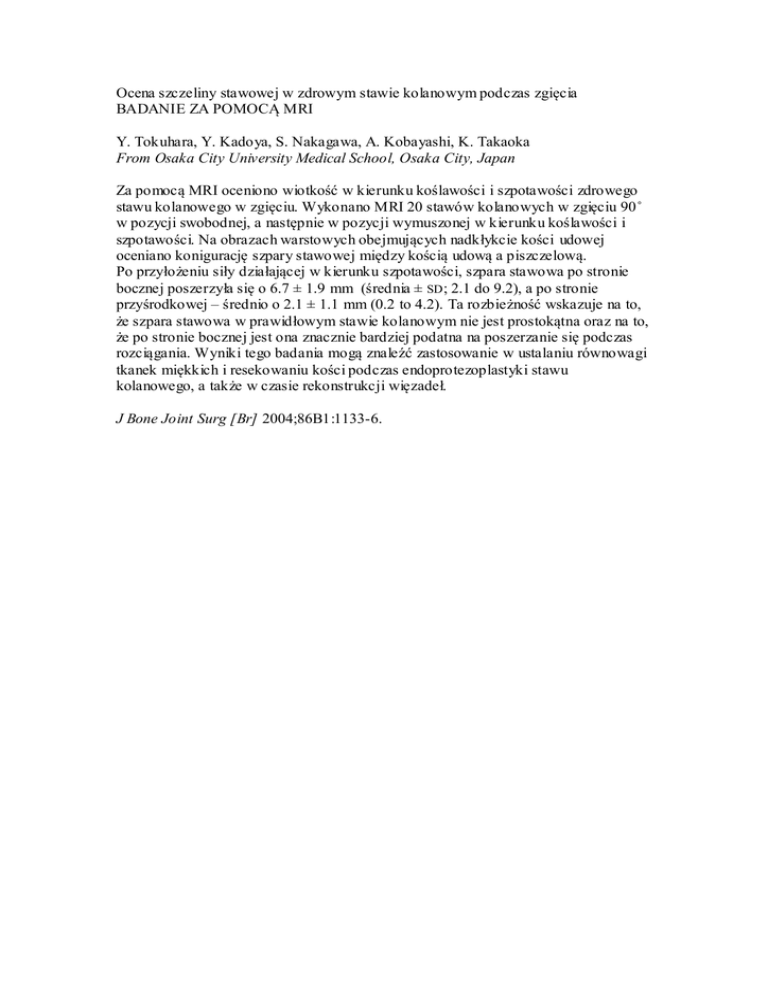 Ocena szczeliny stawowej w zdrowym stawie kolanowym podczas zgięcia BADANIE ZA POMOCĄ MRI Y. Tokuhara, Y. Kadoya, S. Nakagawa, A. Kobayashi, K. Takaoka From Osaka City University Medical School, Osaka City, Japan Za pomocą MRI oceniono wiotkość w kierunku koślawości i szpotawości zdrowego stawu kolanowego w zgięciu. Wykonano MRI 20 stawów kolanowych w zgięciu 90˚ w pozycji swobodnej, a następnie w pozycji wymuszonej w kierunku koślawości i szpotawości. Na obrazach warstowych obejmujących nadkłykcie kości udowej oceniano konigurację szpary stawowej między kością udową a piszczelową. Po przyłożeniu siły działającej w kierunku szpotawości, szpara stawowa po stronie bocznej poszerzyła się o 6.7 ± 1.9 mm (średnia ± SD ; 2.1 do 9.2), a po stronie przyśrodkowej – średnio o 2.1 ± 1.1 mm (0.2 to 4.2). Ta rozbieżność wskazuje na to, że szpara stawowa w prawidłowym stawie kolanowym nie jest prostokątna oraz na to, że po stronie bocznej jest ona znacznie bardziej podatna na poszerzanie się podczas rozciągania. Wyniki tego badania mogą znaleźć zastosowanie w ustalaniu równowagi tkanek miękkich i resekowaniu kości podczas endoprotezoplastyki stawu kolanowego, a także w czasie rekonstrukcji więzadeł. J Bone Joint Surg [Br] 2004;86B1:1133-6.