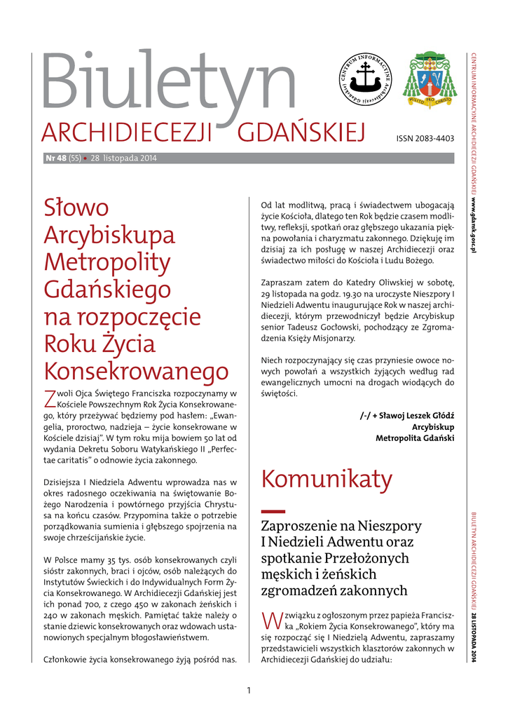 Nr 48 (55) • 28 listopada 2014 Słowo Arcybiskupa Metropolity Gdańskiego na rozpoczęcie Roku Życia Konsekrowanego Z Od lat modlitwą, pracą i świadectwem ubogacają życie Kościoła, dlatego ten Rok będzie czasem modlitwy, refleksji, spotkań oraz głębszego ukazania piękna powołania i charyzmatu zakonnego. Dziękuję im dzisiaj za ich posługę w naszej Archidiecezji oraz świadectwo miłości do Kościoła i Ludu Bożego. Centrum Informacyjne Archidiecezji Gdańskiej www.gdansk.gosc.pl ISSN 2083-4403 Zapraszam zatem do Katedry Oliwskiej w sobotę, 29 listopada na godz. 19.30 na uroczyste Nieszpory I Niedzieli Adwentu inaugurujące Rok w naszej archidiecezji, którym przewodniczył będzie Arcybiskup senior Tadeusz Gocłowski, pochodzący ze Zgromadzenia Księży Misjonarzy. Niech rozpoczynający się czas przyniesie owoce nowych powołań a wszystkich żyjących według rad ewangelicznych umocni na drogach wiodących do świętości. woli Ojca Świętego Franciszka rozpoczynamy w Kościele Powszechnym Rok Życia Konsekrowanego, który przeżywać będziemy pod hasłem: „Ewangelia, proroctwo, nadzieja – życie konsekrowane w Kościele dzisiaj”. W tym roku mija bowiem 50 lat od wydania Dekretu Soboru Watykańskiego II „Perfectae caritatis” o odnowie życia zakonnego. /-/ + Sławoj Leszek Głódź Arcybiskup Metropolita Gdański Komunikaty Zaproszenie na Nieszpory I Niedzieli Adwentu oraz spotkanie Przełożonych męskich i żeńskich zgromadzeń zakonnych W Polsce mamy 35 tys. osób konsekrowanych czyli sióstr zakonnych, braci i ojców, osób należących do Instytutów Świeckich i do Indywidualnych Form Życia Konsekrowanego. W Archidiecezji Gdańskiej jest ich ponad 700, z czego 450 w zakonach żeńskich i 240 w zakonach męskich. Pamiętać także należy o stanie dziewic konsekrowanych oraz wdowach ustanowionych specjalnym błogosławieństwem. W związku z ogłoszonym przez papieża Franciszka „Rokiem Życia Konsekrowanego”, który ma się rozpocząć się I Niedzielą Adwentu, zapraszamy przedstawicieli wszystkich klasztorów zakonnych w Archidiecezji Gdańskiej do udziału: Członkowie życia konsekrowanego żyją pośród nas. 1 Biuletyn Archidiecezji Gdańskiej 28 listopada 2014 Dzisiejsza I Niedziela Adwentu wprowadza nas w okres radosnego oczekiwania na świętowanie Bożego Narodzenia i powtórnego przyjścia Chrystusa na końcu czasów. Przypomina także o potrzebie porządkowania sumienia i głębszego spojrzenia na swoje chrześcijańskie życie. Centrum Informacyjne Archidiecezji Gdańskiej www.gdansk.gosc.pl nr 48 (305) - w Nieszporach I Niedzieli Adwentu w sobotę, 29 listopada 2014 r. o godz. 19.30 w Bazylice Archikatedralnej w Gdańsku Oliwie, gdzie nastąpi inauguracja RŻK w naszej archidieeczji, - w sobotę, 6 grudnia 2014 r. na godz. 10.00 w auli Jana Pawła II obok Gdańskiego Seminarium Duchownego w Oliwie wszystkich przełożonych zakonnych męskich i żeńskich na spotkanie robocze celem omówienia wspólnych działań w rozpoczynającym się roku duszpasterskim. Papież Franciszek daje nam niepowtarzalną szansę dania świadectwa naszej misji w Kościele i prosimy, by ten dar podjąć. /-/ Ks. Stefan Pasternak Kanclerz Kurii w Gdyni rozpocznie się kolejne Studium Przygotowawcze dla kandydatów na Nadzwyczajnych Szafarzy Komunii Świętej, którzy tę niezwykłą posługę pełnić będą w parafiach Archidiecezji Gdańskiej. Kandydaci - mężczyźni w wieku 25–60 lat muszą odznaczać się wysokim poziomem życia moralnego, pobożnością i zaangażowaniem w życiu Kościoła. (por. Wskazania Konferencji Episkopatu Polski odnośnie do nadzwyczajnego szafarza Komunii św. (9 marca 2006). Bardzo proszę, aby zainteresowani zabrali ze sobą dwa zdjęcia legitymacyjne. Dołączam także kartę zgłoszenia, która należy oddać w dniu rozpoczęcia kursu. /-/ Ks. Stefan Pasternak Kanclerz Kurii /-/ O. Janusz Warzocha SJ Wikariusz Biskupi ds. Życia Konsekrowanego w AG /-/ Ks. Edmund Skalski Przewodniczący Archidiecezjalnej Komisji Liturgicznej Rekolekcje dla osób żyjących w powtórnych związkach – małżeństwach niesakramentalnych ►►29 listopada 2014 Adwentowy Dzień Skupienia dla Nadzwyczajnych Szafarzy Komunii Świętej Z Biuletyn Archidiecezji Gdańskiej 28 listopada 2014 apraszamy na doroczne rekolekcje adwentowe dla osób żyjących w powtórnych związkach – małżeństwach niesakramentalnych, , które rozpoczną się Mszą św. w poniedziałek, 08 grudnia o godz. 19.00 w kościele pw. św. Mikołaja w Gdańsku przy ul. Świętojańskiej 72. Ciąg dalszy rekolekcji we wtorek i środę również o godz. 19.00. Nauki rekolekcyjne wygłosi O. Aleksander Koza. /-/ Ks. Stefan Pasternak Kanclerz Kurii W sobotę, dnia 29 listopada br. o godz. 12.00, w kościele Najświętszej Maryi Panny w Gdyni, odbędzie się adwentowy dzień skupienia dla wszystkich Nadzwyczajnych Szafarzy Komunii św., którzy dotąd zostali wprowadzeni do tej posługi. /-/ Ks. Stefan Pasternak Kanclerz Kurii /-/ Ks. Andrzej Pradela Dyrektor Wydziału Duszpasterskiego /-/ Ks. Edmund Skalski Przewodniczący Archidiecezjalnej Komisji Liturgicznej ►►8–10 grudnia 2014 Studium przygotowawcze dla kandydatów na Nadzwyczajnych Szafarzy Komunii Świętej Komunikat Kapituły Nagrody Pro Ecclesia et Populo A Z ►►29 listopada 2014 rchidiecezjalna Komisja Liturgiczna informuje, że w sobotę, 29 listopada 2014 r. o godz. 12.00 w parafii Najświętszej Maryi Panny Królowej Polski bliża się 17 edycja przyznania odznaczeń Pro Ecclesia et Populo (Dla Kościoła i Narodu) osobom świeckim, za szczególnie wyróżniające się, wielolet- 2 nr 48 (305) Apel Pomorskiej Policji U waga na oszustów! W związku z dużą ilością tzw. „przestępstw na wnuczka”, których ofiarami padają głównie osoby starsze, pomorscy policjanci apelują o rozwagę w sytuacji gdy ktoś prosi o pieniądze. Może być to oszust, który udaje kogoś z rodziny: wnuczka, ku