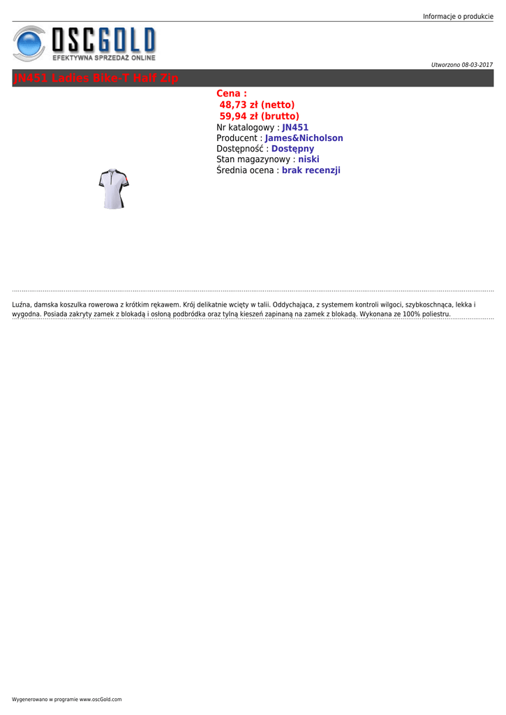 Informacje o produkcie Utworzono 08-03-2017 JN451 Ladies Bike-T Half Zip Cena : 48,73 zł (netto) 59,94 zł (brutto) Nr katalogowy : JN451 Producent : James&Nicholson Dostępność : Dostępny Stan magazynowy : niski Średnia ocena : brak recenzji Luźna, damska koszulka rowerowa z krótkim rękawem. Krój delikatnie wcięty w talii. Oddychająca, z systemem kontroli wilgoci, szybkoschnąca, lekka i wygodna. Posiada zakryty zamek z blokadą i osłoną podbródka oraz tylną kieszeń zapinaną na zamek z blokadą. Wykonana ze 100% poliestru. Wygenerowano w programie www.oscGold.com