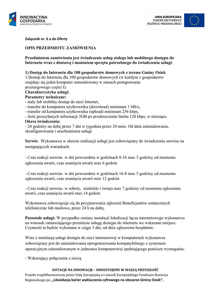 Załącznik nr. 6 a do Oferty OPIS PRZEDMIOTU ZAMÓWIENIA Przedmiotem zamówienia jest świadczenie usług stałego lub mobilnego dostępu do Internetu wraz z dostawą i montażem sprzętu potrzebnego do świadczenia usługi: 1) Dostęp do Internetu dla 100 gospodarstw domowych z terenu Gminy Osiek 1.Dostep do Internetu dla 100 gospodarstw domowych (w każdym z gospodarstw znajduje się jeden komputer zainstalowany w ramach postępowania przetargowego części I). Charakterystyka usługi: Parametry techniczne: - stały lub mobilny dostęp do sieci Internet, - transfer do komputera użytkownika (download) minimum 1 Mb/s, - transfer od komputera użytkownika (upload) minimum 256 kbps, - ilość przesyłanych informacji 5GB po przekroczeniu limitu 128 kbps, w miesiącu Okres świadczenia: - 24 godziny na dobę przez 7 dni w tygodniu przez 24 mies. Od dnia zainstalowania, skonfigurowania i uruchomienia usługi Serwis: Wykonawca w okresie realizacji usługi jest zobowiązany do świadczenia serwisu na następujących warunkach: - Czas reakcji serwisu w dni powszednie w godzinach 8-16 max 3 godziny od momentu zgłoszenia awarii, czas usunięcia awarii max 6 godzin - Czas reakcji serwisu w dni powszednie w godzinach 16-8 max 5 godziny od momentu zgłoszenia awarii, czas usunięcia awarii max 12 godzin - Czas reakcji serwisu w soboty, niedziele i święta max 7 godziny od momentu zgłoszenia awarii, czas usunięcia awarii max 14 godzin Wykonawca zobowiązuje się do przyjmowania zgłoszeń Beneficjentów ostatecznych telefonicznie lub mailowo, przez 24 h na dobę. Pozostałe usługi: W przypadku zmiany instalacji lokalizacji łącza internetowego wykonawca na wniosek zamawiającego przeniesie usługę dostępu do internetu we wskazane miejsce. Czynność ta będzie wykonana w ciągu 3 dni, od dnia zgłoszenia bezpłatnie. Wraz z instalacją usługi dostępu do sieci internetowej w komputerach wykonawca zobowiązany jest do zainstalowania oprogramowania kompatybilnego z systemem operacyjnym zainstalowanym w jednostce komputerowej spełniającego poniższe wymagania: - Wskazujący połączenia z siecią DOTACJE NA INNOWACJE – INWESTUJEMY W WASZĄ PRZYSZŁOŚĆ Projekt współfinansowany przez Unię Europejską w ramach Europejskiego Funduszu Rozwoju Regionalnego pn. „Likwidacja barier wykluczenia cyfrowego na obszarze Gminy Osiek”. - Określający bieżącą wielkość przesyłu danych pobieranych i wysyłanych - Diagnozujący problemy z dostępem do sieci internetowej wraz z komunikatem wyświetlanym na ekranie monitora - Zabezpieczający dostęp do połączenia internetowego hasłem uniemożliwiającym korzystanie z sieci przez osoby trzecie, nie będące uczestnikami projektu DOTACJE NA INNOWACJE – INWESTUJEMY W WASZĄ PRZYSZŁOŚĆ Projekt współfinansowany przez Unię Europejską w ramach Europejskiego Funduszu Rozwoju Regionalnego pn. „Likwidacja barier wykluczenia cyfrowego na obszarze Gminy Osiek”.
