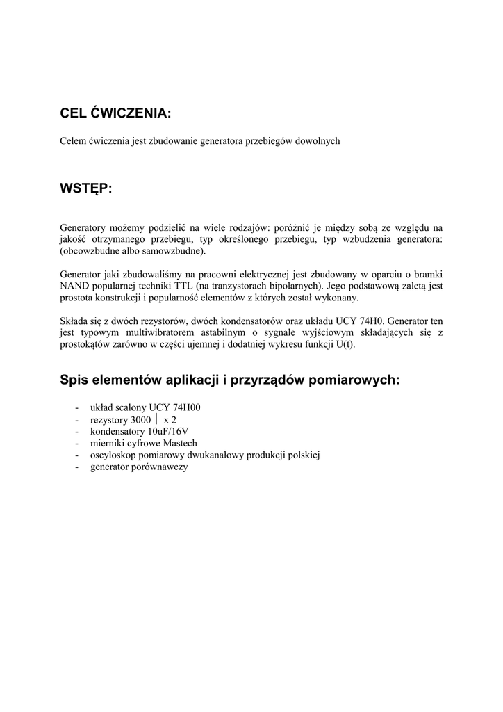 CEL ĆWICZENIA: Celem ćwiczenia jest zbudowanie generatora przebiegów dowolnych WSTĘP: Generatory możemy podzielić na wiele rodzajów: poróżnić je między sobą ze względu na jakość otrzymanego przebiegu, typ określonego przebiegu, typ wzbudzenia generatora: (obcowzbudne albo samowzbudne). Generator jaki zbudowaliśmy na pracowni elektrycznej jest zbudowany w oparciu o bramki NAND popularnej techniki TTL (na tranzystorach bipolarnych). Jego podstawową zaletą jest prostota konstrukcji i popularność elementów z których został wykonany. Składa się z dwóch rezystorów, dwóch kondensatorów oraz układu UCY 74H0. Generator ten jest typowym multiwibratorem astabilnym o sygnale wyjściowym składających się z prostokątów zarówno w części ujemnej i dodatniej wykresu funkcji U(t). Spis elementów aplikacji i przyrządów pomiarowych: - układ scalony UCY 74H00 rezystory 3000 Ω x 2 kondensatory 10uF/16V mierniki cyfrowe Mastech oscyloskop pomiarowy dwukanałowy produkcji polskiej generator porównawczy SCHEMAT MULTIWIBRATORA W OPARCIU O UCY 74H00 * - dodatni biegun zasilania zawiera się wyłącznie dla zasilania 14. nóżki układu NAND Tabele: Tabela przykładowych wartości okresu drgan i częstotliwości dla odpowiednich wartości rezystorów i kondensatorów L.p. 1. 2. 3. 4. 5. 6. 7. 8. 9. 10 R1=R2 Ω 3000 2000 2200 3000 3000 3000 4700 3300 2000 5000 C1=C2 µF 10 100 100 330 100 220 100 330 50 1 T= ms 30 200 220 990 300 660 470 1089 100 5 f= Hz 33,33333 5 4,545455 1,010101 3,333333 1,515152 2,12766 0,918274 10 200 Wykresy: Powyżej przedstawiono typowe przebiegi napięcia U w funkcji czasu t. Zasilanie układu przyjmujemy za 5 V. Wnioski: Przedstawiony powyżej generator jest typowym przedstawicielem multiwibratorów. Cechuje go tak jak każdy tego typu układ zastosowanie dwóch stopni wzmacniających sprzężonych ze sobą pojemnościowo. Tak że wejście jednego jest zwarte z wyjściem drugiego za pomocą pojemności, a wejście drugiego z wyjściem pierwszego. Niczym praktycznie się nie różni od generatorów tego typu w oparciu o lampy elektronowe bądź tranzystory. Elementem wzmacniającym jest tutaj pojedyncza bramka NAND. Pojawienie się sygnału nadanego przez R1 i R2 na bramki B1 i B2 powoduje wystąpienie takich samych sygnałów na ich wyjściach. Nie ma identycznie takich samych bramek NAND więc któraś z nich nada swój sygnał na wyjście z pewnym opóźnieniem w stosunku do bramki drugiej. Tak skonfigurowany praktycznie rzecz biorąc układ ~RS przejdzie wówczas w stan niedozwolony i nieustalony. Układ bramek NAND będzie czekał, aż odpowiednio naładowane kondensatory spowodują przeciwne stany na wejściach na przemian leżących bramek. Wszystko zależy od tego jak szybko będą się ładowały poszczególne kondensatory C1 i C2 by odpowiednio skonfigurowały kolejno wejścia bramek tak aby ich praca była ciągła i powodowała powstawanie sygnału przybliżonego do prostokątnego na wyjściu układu. Na początku działania układu kondensatory są uważane za rozładowane. Więc układ można uznać za układ ~RS który stopniowo zaczyna zamieniać się w układ samowzbudnego multiwibratora. Ciekawą sprawa w wymienionym wzmacniaczu, iż jego parametry wyjściowe sygnału prostokątnego są marne, natomiast dodając wyjście układu na jednym z kondensatorów otrzymujemy sygnał piłokształtny o dobrych parametrach – jest to wynikiem pracy kondensatorów. Widzimy wówczas krzywą kondensatora, która dochodząc do górnej granicy powoduje przejście układu w stan przeciwny. Przebudowa multiwibratora Układ zachowuje się jak w opisie powyżej gdy zewrzemy rezystor R1. Gdy natomiast chcemy, by nasz układ przestał generować sygnały wystarczy zewrzeć na chwile przełącznik Q. Ponowne zwarcie przełącznika P powoduje przejście układu do stanu pierwotnego jaki zaobserwować możemy zaraz po włączeniu układu- generuje sygnał piłokształtny o częstotliwości równej generatorowi prostokątnemu opartego na tym samym układzie. Generowane sygnały sa o tej samej czestotliwości coodpowiadajace im przebiegi prostokątne. Układ ten znalazł zastosowanie we wszelkich dziedzinach elektroniki począwszy od prostych generatorów poprzez bardziej skomplikowane obwody logiczne służące do przetwarzania sygnału taktującego. Przykładem mogą być elektroniczne kostki do gry elektroniczne maszyny losujące... Jakość przebiegu jest związana z jakością elementów. Układy tego typu zbudowane w oparciu o marne kondensatory elektrolityczne charakteryzują się niezbyt dobrym sygnałem prostokątnym na wyjściu. Zbyt małe wartości rezystancji rezystorów prowadzą do zbyt dużego nachylania zbocza opadającego sygnału. Może być to też spowodowane użyciem rezystorów z drutu oporowego o stosunkowo dużej reaktancji indukcyjnościowej, która powoduje wystąpienie sił oporu w układzie.