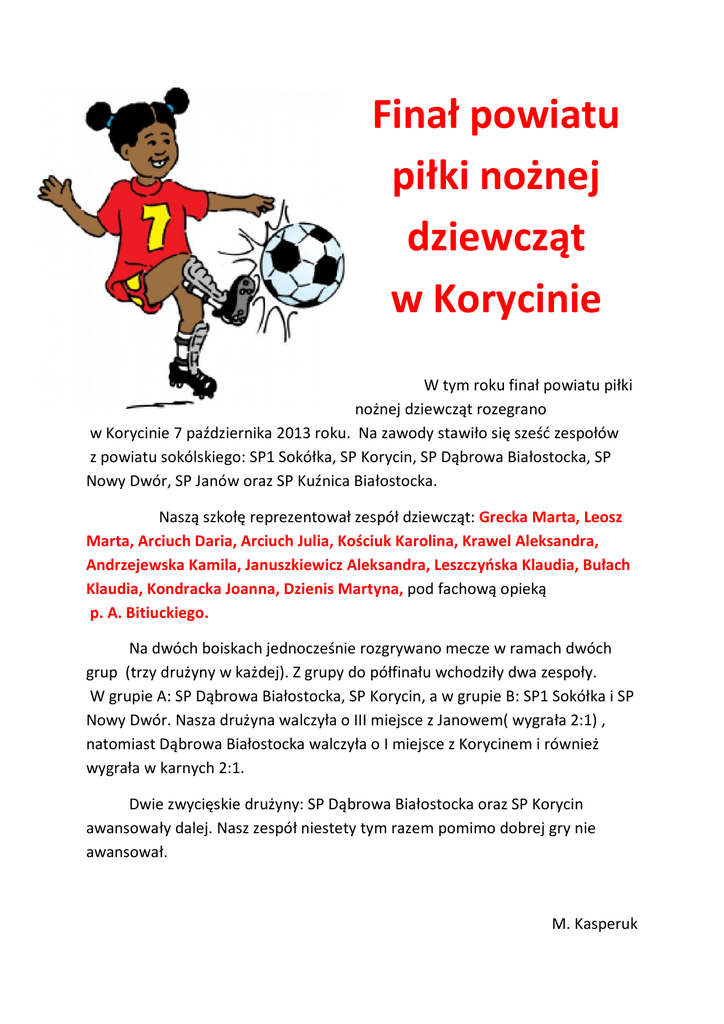 Finał powiatu piłki nożnej dziewcząt w Korycinie W tym roku finał powiatu piłki nożnej dziewcząt rozegrano w Korycinie 7 października 2013 roku. Na zawody stawiło się sześć zespołów z powiatu sokólskiego: SP1 Sokółka, SP Korycin, SP Dąbrowa Białostocka, SP Nowy Dwór, SP Janów oraz SP Kuźnica Białostocka. Naszą szkołę reprezentował zespół dziewcząt: Grecka Marta, Leosz Marta, Arciuch Daria, Arciuch Julia, Kościuk Karolina, Krawel Aleksandra, Andrzejewska Kamila, Januszkiewicz Aleksandra, Leszczyńska Klaudia, Bułach Klaudia, Kondracka Joanna, Dzienis Martyna, pod fachową opieką p. A. Bitiuckiego. Na dwóch boiskach jednocześnie rozgrywano mecze w ramach dwóch grup (trzy drużyny w każdej). Z grupy do półfinału wchodziły dwa zespoły. W grupie A: SP Dąbrowa Białostocka, SP Korycin, a w grupie B: SP1 Sokółka i SP Nowy Dwór. Nasza drużyna walczyła o III miejsce z Janowem( wygrała 2:1) , natomiast Dąbrowa Białostocka walczyła o I miejsce z Korycinem i również wygrała w karnych 2:1. Dwie zwycięskie drużyny: SP Dąbrowa Białostocka oraz SP Korycin awansowały dalej. Nasz zespół niestety tym razem pomimo dobrej gry nie awansował. M. Kasperuk