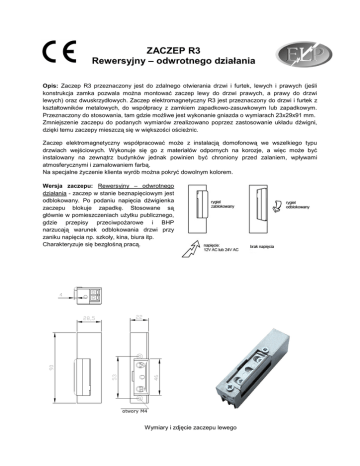 ZACZEP R3 Rewersyjny – odwrotnego działania Opis: Zaczep R3 przeznaczony jest do zdalnego otwierania drzwi i furtek, lewych i prawych (jeśli konstrukcja zamka pozwala można montować zaczep lewy do drzwi prawych, a prawy do drzwi lewych) oraz dwuskrzydłowych. Zaczep elektromagnetyczny R3 jest przeznaczony do drzwi i furtek z kształtowników metalowych, do współpracy z zamkiem zapadkowo-zasuwkowym lub zapadkowym. Przeznaczony do stosowania, tam gdzie możliwe jest wykonanie gniazda o wymiarach 23x29x91 mm. Zmniejszenie zaczepu do podanych wymiarów zrealizowano poprzez zastosowanie układu dźwigni, dzięki temu zaczepy mieszczą się w większości ościeżnic. Zaczep elektromagnetyczny współpracować może z instalacją domofonową we wszelkiego typu drzwiach wejściowych. Wykonuje się go z materiałów odpornych na korozje, a więc może być instalowany na zewnątrz budynków jednak powinien być chroniony przed zalaniem, wpływami atmosferycznymi i zamalowaniem farbą. Na specjalne życzenie klienta wyrób można pokryć dowolnym kolorem. Wersja zaczepu: Rewersyjny – odwrotnego działania - zaczep w stanie beznapięciowym jest odblokowany. Po podaniu napięcia dźwigienka zaczepu blokuje zapadkę. Stosowane są głównie w pomieszczeniach użytku publicznego, gdzie przepisy przeciwpożarowe i BHP narzucają warunek odblokowania drzwi przy zaniku napięcia np. szkoły, kina, biura itp. Charakteryzuje się bezgłośną pracą. otwory M4 Wymiary i zdjęcie zaczepu lewego Dane techniczne: wymiary zewnętrzne obudowy: 20 x 28,5 x 90 mm masa: 0,20 kg maksymalna masa zaczepu z szyldem: szyldem 0,40 kg dopuszczalny nacisk na drzwi podczas zwalniania zapadki: dopuszczalne obciążenie drzwi działające na zaczep: dopuszczalny czas nieprzerwanej pracy: napięcie znamionowe U: zapadka: 30 N (3kG) 3000 N (300 kG) nieograniczony 11 ± 1V * (kod produktu: R3--12.13L; R3-12.13P) 24 ± 2V ** (kod produktu: R3-24.13L; R3 R3-24.13P) regulowana w zakresie 3 mm umożliwia regulację luzu * pozwala zastosować transformator dzwonkowy ** w wykonaniu specjalnym Pobór prądu: Prąd zmienny (AC) Wersja R3-12.13L 2.13L 10V 12V 22V 24V 210 mA 260 mA - - - - 105 mA 110 mA R3-12.13P 12.13P R3-24.13L 24.13L R3-24.13P 24.13P Zaleca się podłączać zaczep tylko do prądu zmiennego. Określanie drzwi lewych i prawych: Drzwi określa się patrząc na nie od strony z której widoczne są zawiasy (PN-B-02100, (PN 02100, PN-B-91000). PN Zaczepy R3 spełniają zasadnicze wymagania Dyrektywy EMC 2004/108/WE. Poznań, 06.09.2012 Elektra Plus Tomasz Połczyński ul. Grudzieniec 66, 60-601 60 Poznań tel/fax: (+48 61) 84-84 84-178 (Biuro Obsługi Klienta) tel: (+48 61) 84-84-177 177 (Dział Techniczny) e-mail: [email protected] internet: www.elektraplus.poznan.pl