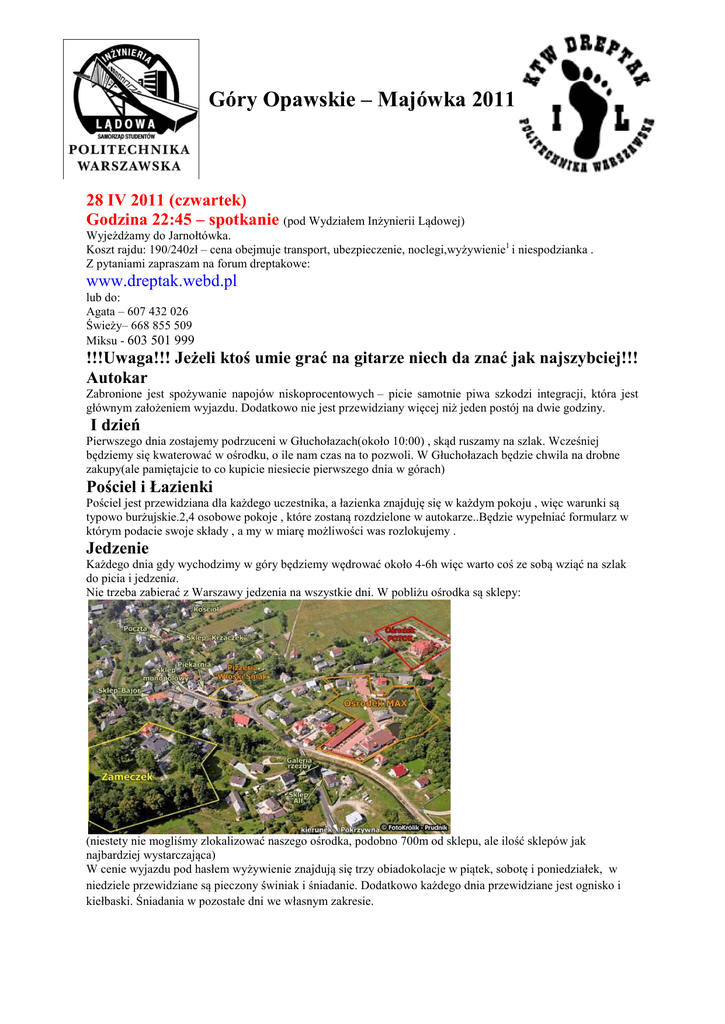 Góry Opawskie – Majówka 2011 28 IV 2011 (czwartek) Godzina 22:45 – spotkanie (pod Wydziałem Inżynierii Lądowej) Wyjeżdżamy do Jarnołtówka. Koszt rajdu: 190/240zł – cena obejmuje transport, ubezpieczenie, noclegi,wyżywienie1 i niespodzianka . Z pytaniami zapraszam na forum dreptakowe: www.dreptak.webd.pl lub do: Agata – 607 432 026 Świeży– 668 855 509 Miksu - 603 501 999 !!!Uwaga!!! Jeżeli ktoś umie grać na gitarze niech da znać jak najszybciej!!! Autokar Zabronione abronione jest spożywanie napojów niskoprocentowych – picie samotnie piwa szkodzi integracji, która jest głównym założeniem wyjazdu.. Dodatkowo nie jest przewidziany więcej niż jeden postój na dwie godziny. godziny I dzień Pierwszego dnia zostajemy podrzuceni w Głuchołazach(około 10:00) :00) , skąd ruszamy na szlak. Wcześniej będziemy się kwaterować w ośrodku, o ile nam czas na to pozwoli.. W Głuchołazach będzie chwila na drobne zakupy(ale pamiętajcie to co kupicie niesiecie pierwszego dnia w górach) Pościel i Łazienki Pościel jest przewidziana dla każdego uczestnika, a łazienka znajduję się w każdym pokoju , więc warunki są typowo burżujskie.2,4 2,4 osobowe pokoje , które zostaną rozdzielone w autokarze..Będzie wypełniać formularz w którym podacie swoje składy , a my w miarę możliwości was rozlokujemy . Jedzenie Każdego dnia gdy wychodzimy w góry będziemy wędrować około 44-6h więc warto coś ze sobą wziąć na szlak do picia i jedzenia. dni. W pobliżu ośrodka są sklepy: Nie trzeba zabierać z Warszawy jedzenia na wszystkie dni (niestety nie mogliśmy zlokalizować naszego ośrodka ośrodka, podobno 700m od sklepu,, ale ilość sklepów jak najbardziej wystarczająca) W cenie wyjazdu pod hasłem wyżyw wyżywienie znajdują się trzy obiadokolacje w piątek, sobotę i poniedziałek, w niedziele przewidziane są pieczony świniak i śniadanie. Dodatkowo każdego dnia przewidziane jest ognisko i kiełbaski. Śniadania ania w pozostałe dni we własnym zakresie. Czechy W poniedziałek planujemy wypad na czeską, stronę więc jeśli chcecie coś zakupić to proponuje wymienić korony w warszawie , gdyż Czesi mają złodziejski przelicznik . Obuwie Pamiętajcie, aby wziąć komfortowe obuwie , w którym będzie chodzić po szlaku, głównie tereny leśne , więc japonki czy inny „kuboty”, czy ostatnio popularne podróbki „kobuty” raczej odpadają. Warto też wziąć jakieś lekkie buty/klapki na zmianę do chodzenia po ośrodku. Pogoda Prognozy nie są dla nas łaskawe, wszystko wskazuję na to, że będziemy musieli wziąć na wszelki wypadek jakąś przeciwdeszczówkę, chociaż góry nie raz już zaskakiwały i może będzie ładnie. Wstępny Regulamin Rajdu. 1.Rajd rozpoczyna się o godzinie 23:00 28.04.2011 przed Wydziałem Inżynierii Lądowej PW. 2.Rajd Trwa do dnia 03.05.2011- do momentu wyjścia z autokaru. 3.Każdy uczestnik ma obowiązek stosować się do Regulaminu Rajdu, a niestosowanie się do niego, może skutkować wykluczeniem z Rajdu i natychmiastowym powrotem do Warszawy. 4.Ilość tras i ich przebieg ustala Kierownictwo Rajdu, a ich wstępny plan jest zawarty w tym dokumencie. 5.Grupę otwiera i zamyka Przewodnik Dreptaka lub organizator wyjazdu. 6.Alkohol ograniczamy do niezbędnego minimum. 7. Uczestnicy wyjazdu ponoszą pełną odpowiedzialność za swoje czyny. Uczestnik odpowiada za wszystkie szkody spowodowane przez Niego w czasie trwania wyjazdu i jest zobowiązany do pokrycia strat materialnych na miejscu z własnych środków. 8. Organizator nie ponosi odpowiedzialności za zachowanie Uczestników wyjazdu oraz następstwa z niego wynikające, w tym chwilowy lub stały uszczerbek na zdrowiu i wypadki śmiertelne. 9. Organizator nie zwraca żadnych kwot za świadczenia niewykorzystane z winy Uczestnika. 10. Organizator nie odpowiada za działanie siły wyższej (m.in. warunki atmosferyczne, klęski żywiołowe itp.) i związane z tym zmiany programu wyjazdu. 11.Uczestnik wyjazdu zobowiązany jest posiadać przy sobie ważne dokumenty potwierdzające jego tożsamość, ważną legitymację studencką. 12.Organizator nie ponosi żadnej odpowiedzialności za rzeczy Uczestnika skradzione, zniszczone lub zagubione. 13.Uczestnik zobowiązany jest do stosowania się do wskazań organizatora dot. realizacji programu, oraz do utrzymania porządku. 14.Zabrania się oddalania od grupy bez uprzedniego powiadomienia organizatora wyjazdu. 15.Jeżeli Uczestnik dojeżdża lub wraca z wyjazdu w innym terminie z przyczyn niezależnych od organizatora lub odłączył się od grupy w trakcie wyjazdu, organizator nie ma obowiązku zapewnienia Uczestnikowi dojazdu w celu dołączenia do grupy lub powrotu. 16.Podczas trwania wyjazdu zabronione jest stosowanie i posiadanie używek i środków zabronionych przez prawo III RP oraz innych krajów, na terenie których się on odbywa. Zabronione jest również palenie tytoniu z wyjątkiem miejsc do tego przeznaczonych. 17.W autokarze mogą przebywać jedynie uczestnicy wyjazdu, obsługa autokaru i organizatorzy. Do domków i pokoi, w których mieszkają uczestnicy mogą wchodzić jedynie organizatorzy i osoby przez nie upoważnione lub uczestnicy. 18.Organizator ma prawo usunąć z wyjazdu Uczestnika, który nie zastosuje się do Regulaminu lub w rażący sposób naruszy zasady współżycia społecznego, bez zwracania kosztów. 19.We wszystkich kwestiach spornych w czasie wyjazdu ostateczną decyzję podejmuje organizator