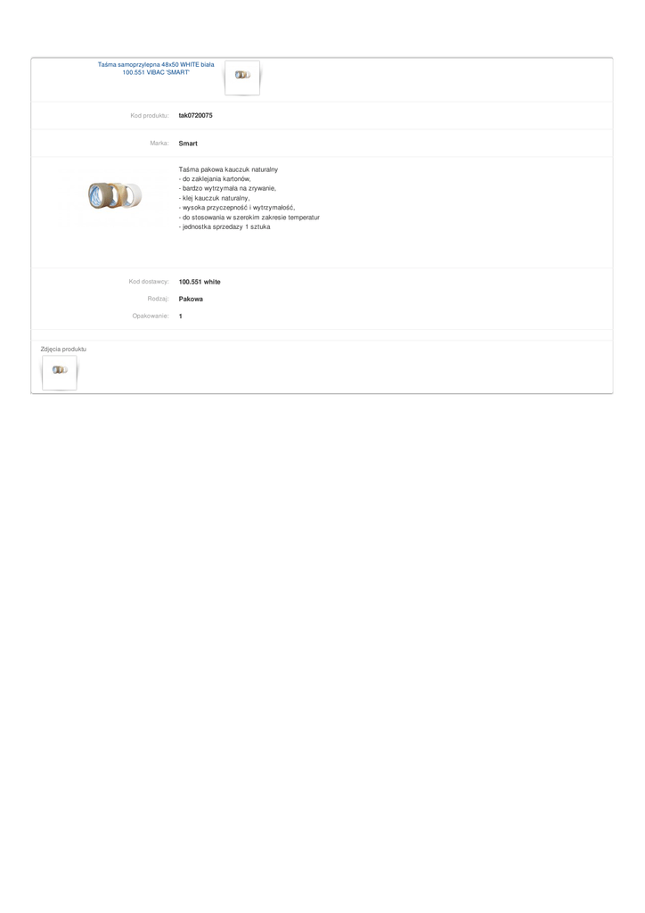 Taśma samoprzylepna 48x50 WHITE biała 100.551 VIBAC 'SMART' Kod produktu: Marka: tak0720075 Smart Taśma pakowa kauczuk naturalny - do zaklejania kartonów, - bardzo wytrzymała na zrywanie, - klej kauczuk naturalny, - wysoka przyczepność i wytrzymałość, - do stosowania w szerokim zakresie temperatur - jednostka sprzedazy 1 sztuka Kod dostawcy: Rodzaj: Opakowanie: Zdjęcia produktu 100.551 white Pakowa 1