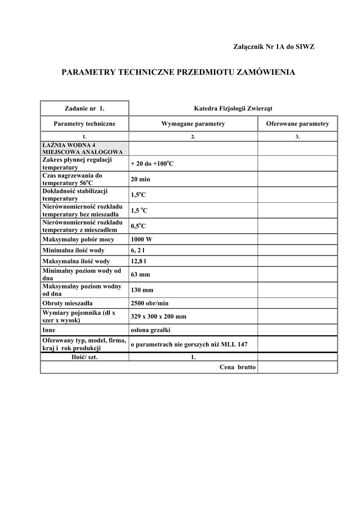 Załącznik Nr 1A do SIWZ PARAMETRY TECHNICZNE PRZEDMIOTU ZAMÓWIENIA Zadanie nr 1. Katedra Fizjologii Zwierząt Parametry techniczne Wymagane parametry Oferowane parametry 1. 2. 3. ŁAŹNIA WODNA 4 MIEJSCOWA ANALOGOWA Zakres płynnej regulacji temperatury Czas nagrzewania do temperatury 56oC Dokładność stabilizacji temperatury Nierównomierność rozkładu temperatury bez mieszadła Nierównomierność rozkładu temperatury z mieszadłem Maksymalny pobór mocy 1000 W Minimalna ilość wody 6, 2 l Maksymalna ilość wody Minimalny poziom wody od dna Maksymalny poziom wodny od dna Obroty mieszadła Wymiary pojemnika (dł x szer x wysok) Inne 12,8 l + 20 do +100oC 20 min 1,5oC 1,5 oC 0,5oC 63 mm 130 mm 2500 obr/min 329 x 300 x 200 mm osłona grzałki Oferowany typ, model, firma, o parametrach nie gorszych niŜ MLL 147 kraj i rok produkcji Ilość/ szt. 1. Cena brutto Zadanie nr 2. Katedra Fizjologii Zwierząt Parametry techniczne Wymagane parametry Oferowane parametry 1. 2. 3. ruch wstrząsający skok przy wytrząsaniu miksowanie małych ilości próbek za pomocą funkcji touch kołowy 4,5 mm stała prędkość obrotowa 2800 obr/min maksymalna ilość mieszania 1 probówka 50 ml WYTRZĄSARKA DO PROBÓWEK moc silnika zasilacz sieciowy a) wejściowa; 1, 2 W b) wyjściowa 0,8 W 12 V Oferowany typ, model, firma, o parametrach nie gorszych niŜ lab dancer kraj i rok produkcji Ilość/ szt. 1. Cena brutto Zadanie nr 3. Katedra Analizy i Oceny Jakości śywności Parametry techniczne Wymagane parametry Oferowane parametry 1. 2. 3. INKUBATOR LABORATORYJNY a) z wymuszoną cyrkulacja powietrza oraz funkcja chłodzenia i sterowania wilgotnosci, b) 6 nastawnych programów, c) interfejs RS 232, d) z moŜliwością opóźnionego włączenia i wyłączenia, e) Alarm dźwiękowy i wizualny, f) Zakres czasu 0 – 16 lat, nastawialny po minucie, g) Cyfrowy termostat ochronny klasy 3 stal nierdzewna komora robocza wymiary komory roboczej ( szer/gł/ wysok) objętość wymiary zewnętrzne łącznie z drzwiami , uchwytem i kołkami ( szer/gł/ wysok) 222 l liczba półek 4 szt. drzwi Zakres temperaturowy dokładność temperatury czas nagrzewania do 37oC od temperatury otoczenia czas chłodzenia od temperatury 22oC do temperatury 10oC wilgotność względna Układ nawilŜania i podsuszania Oferowany typ, model, firma, kraj i rok produkcji Ilość/ szt. 540 / 520 / 760 mm 760 / 790/ 1330 a) b) a) b) jedne zewnętrzne metalowe jedne wewnętrzne szklane bez nawilŜania: 0 – 99,9oC, z nawilŜaniem: 10 – 90,0oC < ± 0, 5 oC 25 min 21 min Regulowana w zakresie 10 – 90 % Sterowany mikroprocesorem o parametrach nie gorszych niŜ BMT Climacell 222 1. Cena brutto Zadanie nr 4. Katedra Fizjologii Roślin Wydział Ogrodniczy Parametry techniczne Wymagane parametry Oferowane parametry 1. 2. 3. SPEKTROFOTOMETR JEDNOWIĄZKOWY VIS źródło światła zakres długości fali dokładność długości fali lampa halogenowa 325 – 1100 nm 1 nm powtarzalność długości fali ± 1 nm szerokość spektralna 5 nm monochromator Seya Namioka z wzorcową siatką dyfrakcyjną (MIG) z 1200 liniami na mm układ optyczny pokryty kwarcem zakres fotometryczny - 0,1 do 3 Abs dokładność fotometryczna przy 1 Abs ± 0,005 Abs stabilność < 0,002 Abs/h poziom światła rozproszonego < 0,1 % T@340 nm&400 nm maksymalny błąd pomiaru 1% maksymalna długość drogi optycznej 50 mm zmieniacz kuwet wbudowany ciekłokrystaliczny ekran VGA pozwalający na wyświetlenie widm, krzywych kalibracji, metod i wyników a) transmisji, b) zdejmowanie i obróbka widm w zakresie 100 nm, c) pomiary przy stałej długości fali, d) analiza ilościowa z krzywymi kalibracji, moŜliwość uŜycia do 20 wzorców kalibracyjnych, e) pomiary kinetyczne, f) liniowa analiza regresji sześciopozycyjny wyjście RS232C kuwety szklane 10 mm – szt. 6 a) pracujące w środowisku Microsoft Windows 98, 2000, XP, Vista b) umoŜliwiające pracę w trybie; wyświetlacz pomiary oprogramowanie komputerowe kabel zestaw komputerowy - FIXED: przy stałej długości fali w trybie Abs, %T, C - QUANT: zdejmowanie krzywych kalibracji (do 10 wzorców), analizę stopnia dopasowania, wyznaczanie współczynników korelacji i równania krzywych. - SCAN: zdejmowanie i obróbkę widm, - RATE: kinetyka do podłączenia spektrofotometru do komputera o konfiguracji: procesor Intel Core 2 Duo, płyta główna chipset P35, RAM 2048 MB, HDD 250 GB, karta graficzna DirectX 10, karta muzyczna i sieciowa wbudowana, obudowa z portami USB w górnej części, klawiatura, mysz optyczna, głośniki, napęd DVD DL Lightscribe, monitor LCD 19” z wbudowanym hubem USB 4-portowym, listwa Acar, system operacyjny Windows XP Prof. Oferowany typ, model, firma, kraj i rok produkcji: a) spektrofotometr z oprogramowaniem b) komputer stacjonarny Ilość a) spektrofotometr z oprogramowaniem zest 1. b) komputer stacjonarny- zest. 1 Cena brutto: a) spektrofotometr z oprogramowaniem b) komputer stacjonarny wartość brutto (a +b) Zadanie nr 5. Katedra Rozrodu i Anatomii Zwierząt Parametry techniczne Wymagane parametry Oferowane parametry 1. 2. 3. HOMOGENIZATOR szybkość obrotowa napęd regulator szybkość obrotowej (skala wskaźnikowa) objętość homogenizowania 11000 – 30000 obr/min 500 W hałas 75 – 85 dB wymagana 0,1 – 2000 ml 1. Rozbieralne noŜe tnące (demontaŜ rotora i statora) ze stali 1.4435/316L. 2. MoŜliwość autoklawowania noŜy oraz moŜliwość dokupienia noŜy jednorazowych. 3. NóŜ tnący do PT 2100 (PT-DA 2105/2EC) noŜe do małych próbek od 0,1 do 5 ml – szt. 1. Wymiary noŜa: średnica statora – 5,5 mm; średnica rotora – 3 mm; długość – 61 mm; prędkość TIP – 4 m/s 4. NóŜ tnący do PT 2100 (PT-DA 2107/2EC) do próbek od 0,3 do 10 ml – szt. 1. Wymiary noŜa: średnica statora – 7,5 mm; średnica rotora – 5 mm; długość – 86 mm; prędkość TIP – 6,5 m/s Oferowany typ, model, o parametrach nie gorszych niŜ PT 2100 firma, kraj i rok produkcji Ilość/ s