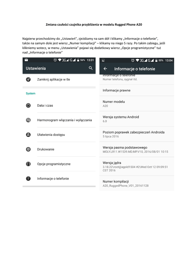 Zmiana czułości czujnika przybliżenia w modelu Rugged Phone A20 Najpierw przechodzimy do „Ustawień”, zjeżdżamy na sam dół i klikamy „Informacje o telefonie”, także na samym dole jest wiersz „Numer kompilacji” – klikamy na niego 5 razy. Po takim zabiegu, jeśli klikniemy wstecz, w menu „Ustawienia” pojawi się dodatkowy wiersz „Opcje programistyczne” tuż nad „Informacje o telefonie” W „Opcjach programistycznych” zjeżdżamy na sam dół i klikamy na wiersz „Kalibracja Czujnika Przybliżenia” Postępujemy zgodnie z instrukcją w aplikacji – w pierwszym etapie nie zasłaniamy czujnika, w drugim etapie zaś ustawiamy przedmiot (np. palec) przed czujnikiem, najlepiej w odległości około centymetra – wtedy czujnik nie włączy ekranu w trakcie rozmowy jeżeli czujnik będzie do centymetra od ucha. Jeżeli przedmiot w drugim etapie będzie tuż przy ekranie/czujniku to wtedy mogą być problemy z przypadkowym klikaniem ekranu w trakcie rozmowy, ponieważ ekran będzie wygaszony tylko i wyłącznie gdy przeszkoda/ucho będzie tuż przy ekranie (ucho nie jest płaskie, ekran może często się włączać i wyłączać) dlatego optymalna odległość to centymetr lub więcej. Czujnik znajduje się po przeciwległej stronie przedniego aparatu, jeśli patrzymy na przód telefonu to jest to górna część ekranu, lewa strona, przy głośniku rozmów (w instrukcji szybkiego startu zaznaczony numerem 4)