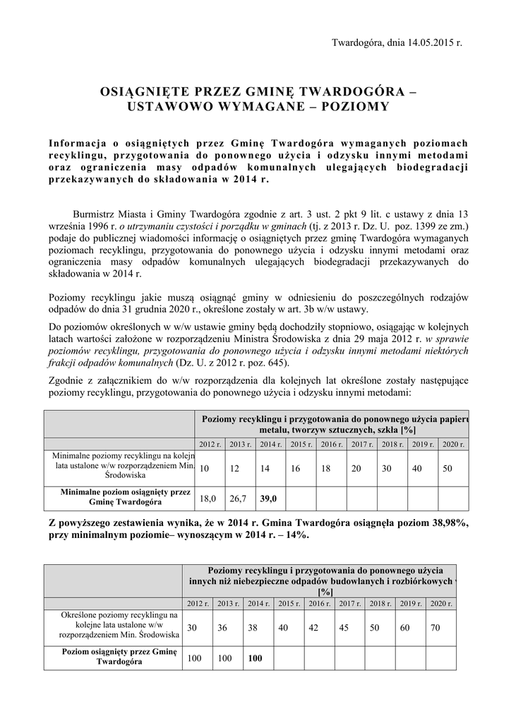 Twardogóra, dnia 14.05.2015 r. OSIĄGNIĘTE PRZEZ GMINĘ TWARDOGÓRA – USTAWOWO WYMAGANE – POZIOMY Informacja o osiągniętych przez Gminę Twardogóra wymaganych poziomach recyklingu, przygotowania do ponownego użycia i odzysku innymi metodami oraz ograniczenia masy odpadów komunalnych ulegających biodegradacji przekazywanych do składowania w 2014 r. Burmistrz Miasta i Gminy Twardogóra zgodnie z art. 3 ust. 2 pkt 9 lit. c ustawy z dnia 13 września 1996 r. o utrzymaniu czystości i porządku w gminach (tj. z 2013 r. Dz. U. poz. 1399 ze zm.) podaje do publicznej wiadomości informację o osiągniętych przez gminę Twardogóra wymaganych poziomach recyklingu, przygotowania do ponownego użycia i odzysku innymi metodami oraz ograniczenia masy odpadów komunalnych ulegających biodegradacji przekazywanych do składowania w 2014 r. Poziomy recyklingu jakie muszą osiągnąć gminy w odniesieniu do poszczególnych rodzajów odpadów do dnia 31 grudnia 2020 r., określone zostały w art. 3b w/w ustawy. Do poziomów określonych w w/w ustawie gminy będą dochodziły stopniowo, osiągając w kolejnych latach wartości założone w rozporządzeniu Ministra Środowiska z dnia 29 maja 2012 r. w sprawie poziomów recyklingu, przygotowania do ponownego użycia i odzysku innymi metodami niektórych frakcji odpadów komunalnych (Dz. U. z 2012 r. poz. 645). Zgodnie z załącznikiem do w/w rozporządzenia dla kolejnych lat określone zostały następujące poziomy recyklingu, przygotowania do ponownego użycia i odzysku innymi metodami: Poziomy recyklingu i przygotowania do ponownego użycia papieru, metalu, tworzyw sztucznych, szkła [%] 2012 r. Minimalne poziomy recyklingu na kolejne lata ustalone w/w rozporządzeniem Min. 10 Środowiska Minimalne poziom osiągnięty przez Gminę Twardogóra 18,0 2013 r. 2014 r. 2015 r. 2016 r. 2017 r. 2018 r. 2019 r. 2020 r. 12 14 16 18 20 30 40 50 26,7 39,0 Z powyższego zestawienia wynika, że w 2014 r. Gmina Twardogóra osiągnęła poziom 38,98%, przy minimalnym poziomie– wynoszącym w 2014 r. – 14%. Poziomy recyklingu i przygotowania do ponownego użycia innych niż niebezpieczne odpadów budowlanych i rozbiórkowych w [%] 2012 r. Określone poziomy recyklingu na kolejne lata ustalone w/w 30 rozporządzeniem Min. Środowiska Poziom osiągnięty przez Gminę Twardogóra 100 2013 r. 2014 r. 2015 r. 2016 r. 2017 r. 2018 r. 2019 r. 2020 r. 36 38 40 42 45 50 60 70 100 100 Z powyższego zestawienia wynika, że w roku 2014 Gmina Twardogóra osiągnęła poziom 100%, przy minimalnym poziomie – wynoszącym w 2014 r. – 38%. Zgodnie z art. 3c w/w ustawy obowiązkiem gmin jest również ograniczanie masy odpadów komunalnych ulegających biodegradacji przekazywanych do składowania: - do dnia 16 lipca 2013 r. – do nie więcej niż 50% wagowo całkowitej masy odpadów komunalnych ulegających biodegradacji przekazywanych do składowania; - do dnia 16 lipca 2020 r. – do nie więcej niż 35% wagowo całkowitej masy odpadów komunalnych ulegających biodegradacji przekazywanych do składowania w stosunku do masy tych odpadów wytworzonych w 1995 r. Poziomy do osiągnięcia w poszczególnych latach, a także sposoby ich obliczenia zostały określone w rozporządzeniu Ministra Środowiska z dnia 25 maja 2012 r. w sprawie poziomów ograniczenia masy odpadów komunalnych ulegających biodegradacji przekazywanych do składowania oraz sposobu obliczania poziomu ograniczenia masy tych odpadów. Zgodnie z załącznikiem do w/w rozporządzenia dla kolejnych lat określone zostały następujące poziomy: Dopuszczalny poziom masy odpadów komunalnych ulegających biodegradacji przekazywanych do składowania w stosunku do masy tych odpadów wytworzonych w 1995 r. [%] Poziom ograniczenia składowania bioodpadów, na kolejne lata ustalone w/w rozporządzeniem Min. Środowiska 2012 r. 2013 r. 2014 r. 2015 r. 2016 r. 2017 r. 2018 r. 2019 r. 2020 r. 75 50 50 50 45 45 40 40 35 8,7 5,4 Osiągnięty przez Gminę Twardogóra poziom przekazanych 85,6 do składowania bioodpadów Z powyższego zestawienia wynika, że w 2014roku Gmina Twardogóra osiągnęła poziom 5,35%, przy dopuszczalnym poziomie – wynoszącym w 2014 r. – 50%. Z uwagi na powyższewyznaczony przez Ministra Środowiska poziom w 2014 r. został- przez Gminę Twardogóra - osiągnięty. Kto odbiera odpady z posesji w gminie Twardogóra? • Nie zlecono przedsiębiorcy zewnętrznemu • Gminasamawykonuje tęusługę, powierzając tozadanie własnemu zakładowi budżetowemu ZGKiM • Dlaczego? Dlatego, że: Posiadamy własny sprzęt specjalistyczny Wyszkoloną załogę Ponad 40-letnie doświadczenie w świadczeniu tego rodzaju usług Mamy pełną kontrolę nad odpadami Mamymożliwość przekazywaniaprzychodów ze sprzedaży odpadów na poczet opłat w zależności od ich odebranych ilości i cen na rynku odpadów Mamy bezpośredni wpływ na jakość świadczonych usług Gdzie dostarczamy nasze odpady? • Odpady zmieszane dostarczane są do RIPOK Chemeko-System sp. z o. o. w miejscowości Rudna Wielka w gminie Wąsosz. • Odpady zielone dostarczane są do RIPOK Merta & Merta Sp. z o.o. we Wrocławiu. • Ceny za przyjęcie odpadów: zmieszanych – 387,72 zł (brutto) za tonę zielonych – 216,00 zł (brutto) za tonę Komu przekazujemy pozostałe odpady? • Odpady wysegregowane odbierane są przez różnych odbiorców najczęściejwłasnym transportem na ich koszt i za odpłatnością lub nieodpłatnie lub za dopłatą w zależności od rodzaju odpadów i koniunktury rynkowej. odpady opakowaniowe ze szkła, metalu oraz odpady z tworzyw sztucznych i papieru oraz budowlane, z których gmina jest rozliczana odpady zużytego sprzętu elektrycznego, zużytych opon i wielkogabarytowe Jak mieszkańcy mogą wpłynąć na zmniejszeniewysokości opłaty za zagospodarowanie odpadów? • Wiemy, że do RIPOK musimy przewieźć na własny koszt wyłącznie odpady zmieszane i odpady zielone i za ich przyjęcie musimy wni