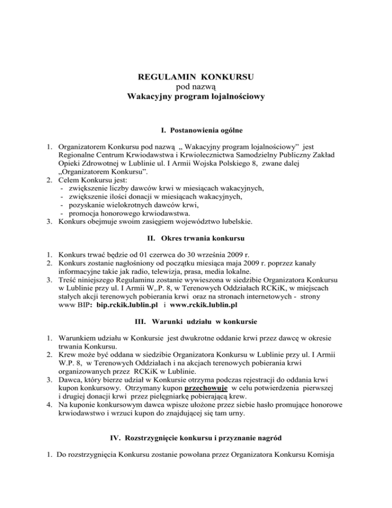 REGULAMIN KONKURSU pod nazwą Wakacyjny program lojalnościowy I. Postanowienia ogólne 1. Organizatorem Konkursu pod nazwą „ Wakacyjny program lojalnościowy” jest Regionalne Centrum Krwiodawstwa i Krwiolecznictwa Samodzielny Publiczny Zakład Opieki Zdrowotnej w Lublinie ul. I Armii Wojska Polskiego 8, zwane dalej „Organizatorem Konkursu”. 2. Celem Konkursu jest: - zwiększenie liczby dawców krwi w miesiącach wakacyjnych, - zwiększenie ilości donacji w miesiącach wakacyjnych, - pozyskanie wielokrotnych dawców krwi, - promocja honorowego krwiodawstwa. 3. Konkurs obejmuje swoim zasięgiem województwo lubelskie. II. Okres trwania konkursu 1. Konkurs trwać będzie od 01 czerwca do 30 września 2009 r. 2. Konkurs zostanie nagłośniony od początku miesiąca maja 2009 r. poprzez kanały informacyjne takie jak radio, telewizja, prasa, media lokalne. 3. Treść niniejszego Regulaminu zostanie wywieszona w siedzibie Organizatora Konkursu w Lublinie przy ul. I Armii W,.P. 8, w Terenowych Oddziałach RCKiK, w miejscach stałych akcji terenowych pobierania krwi oraz na stronach internetowych - strony www BIP: bip.rckik.lublin.pl i www.rckik.lublin.pl III. Warunki udziału w konkursie 1. Warunkiem udziału w Konkursie jest dwukrotne oddanie krwi przez dawcę w okresie trwania Konkursu. 2. Krew moŜe być oddana w siedzibie Organizatora Konkursu w Lublinie przy ul. I Armii W.P. 8, w Terenowych Oddziałach i na akcjach terenowych pobierania krwi organizowanych przez RCKiK w Lublinie. 3. Dawca, który bierze udział w Konkursie otrzyma podczas rejestracji do oddania krwi kupon konkursowy. Otrzymany kupon przechowuje w celu potwierdzenia pierwszej i drugiej donacji krwi przez pielęgniarkę pobierającą krew. 4. Na kuponie konkursowym dawca wpisze ułoŜone przez siebie hasło promujące honorowe krwiodawstwo i wrzuci kupon do znajdującej się tam urny. IV. Rozstrzygnięcie konkursu i przyznanie nagród 1. Do rozstrzygnięcia Konkursu zostanie powołana przez Organizatora Konkursu Komisja w składzie 7 osób, składająca się z Kierowników Działów oraz jednego Krwiodawcy. 2. Nagrodą w Konkursie przyznaną przez Komisję jest QUAD o wartości 25.900 zł. ( słownie: dwadzieścia pięć tysięcy dziewięćset złotych ). Podatek dochodowy od nagrody ureguluje Organizator Konkursu. 3. Rozstrzygnięcie Konkursu nastąpi dnia 30 października 2009 r. 4. Komisja dokona oceny haseł konkursowych zamieszczonych na kuponach i wybierze najlepsze hasło, za które przyzna nagrodę. 5. Z posiedzenia Komisji Konkursowej zostanie sporządzony protokół , który zawierać będzie skład Komisji, przebieg oceny haseł konkursowych, wybrane najlepiej ocenione hasło i nazwisko nagrodzonej osoby. Protokół zostanie podpisany przez wszystkich członków Komisji i będzie przechowywany w siedzibie Organizatora Konkursu. 6. Wybrane przez Komisję najlepsze hasło konkursowe będzie wykorzystywane przez okres 3 lat w materiałach promocyjnych Organizatora Konkursu. 7. Po rozstrzygnięciu konkursu zwycięzca otrzyma nagrodę QUAD - z zamieszczonym na nim nagrodzonym hasłem. 8. Zwycięzca nagrody ma obowiązek uŜytkować QUAD z zamieszczonym na nim nagrodzonym hasłem przez okres 12 miesięcy. 9. Zwycięzca nagrody zostanie powiadomiony o przyznaniu nagrody listownie w terminie 7 dni od daty rozstrzygnięcia Konkursu. 10. JeŜeli dawca nie akceptuje nagrody traci do niej prawo. 11. Wylosowana nagroda nie podlega wymianie na jakikolwiek ekwiwalent. 12. Zwycięzca nagrody powiadomiony listownie przez Organizatora Konkursu o przyznaniu nagrody i przed jej odebraniem zobowiązany jest do udzielenia pisemnej zgody Organizatorowi Konkursu na: 1/ Warunki zawarte w niniejszym Regulaminie. 2/ Korzystanie przez Organizatora Konkursu z hasła przez okres 3 lat. RównieŜ Zwycięzca nagrody złoŜy oświadczenie o tym, Ŝe zrzeka się wszelkich roszczeń wobec Organizatora Konkursu, w tym roszczeń finansowych z tytułu wykorzystywania przez Niego hasła. 3/ na podanie danych osobowych , wizerunku, głosu lub materiału wideo do celów promocyjnych i reklamowych - bez prawa do wynagrodzenia. V. Odbiór nagród 1. Ustala się termin odbioru nagród do dnia 20 listopada 2009 r. w siedzibie Organizatora Konkursu w Lublinie przy ul. I Armii W.P. 8. 2. Nagrodę moŜe odebrać dawca osobiście. Przy odbiorze nagrody zostaną mu przekazane wszystkie dokumenty związane z zakupem QUADA, które są niezbędne do zarejestrowania QUADA, do korzystania z uprawnień gwarancyjnych oraz z tytułu rękojmi. 3. Organizator Konkursu nie ponosi odpowiedzialności za wady fizyczne i prawne nagrody. Wszelkie roszczenia z tytułu gwarancji czy rękojmi naleŜy kierować do producenta lub autoryzowanych dystrybutorów, sprzedawców. 4. Organizator Konkursu nie ponosi odpowiedzialności za jakiekolwiek urazy, ubytki, straty osobiste włączając wypadki śmiertelne oraz straty majątkowe wynikające w całości lub częściowo z akceptacji i posiadania, uŜycia lub niewłaściwego uŜycia nagrody. 5. Organizator Konkursu nie ponosi odpowiedzialności w przypadku jakiejkolwiek awarii QUADA. VI. Ochrona danych osobowych Warunkiem uczestnictwa w Konkursie jest wyraŜenie zgody przez Uczestnika na umieszczenie jego danych osobowych ujawnionych w czasie trwania i w ramach Konkursu w bazie danych Organizatora Konkursu oraz na ich przetwarzanie przez Organizatora konkursu zgodnie z ustawą z dnia 29.08.1997 r. o ochronie danych osobowych ( jedn. tekst Dz.U. z 2002 r. nr 101, poz. 926 ze zm. ), w celu organizacji i przeprowadzenia Konkursu, w tym w związku z wydaniem i rozliczeniem nagrody. Uczestnik Konkursu ma prawo dostępu do treści swoich danych osobowych oraz do ich poprawiania. V. Postanowienia końcowe Przystąpienie uczestnika do Konkursu jest równoznaczne z akceptacją treści niniejszego Regulaminu.