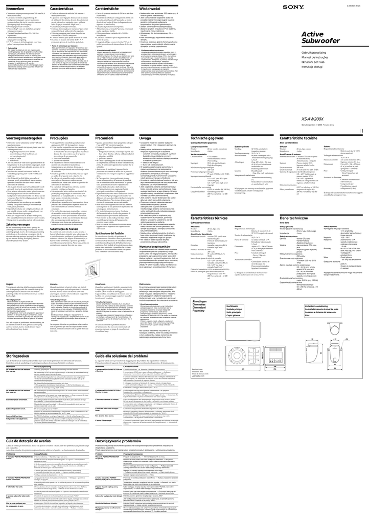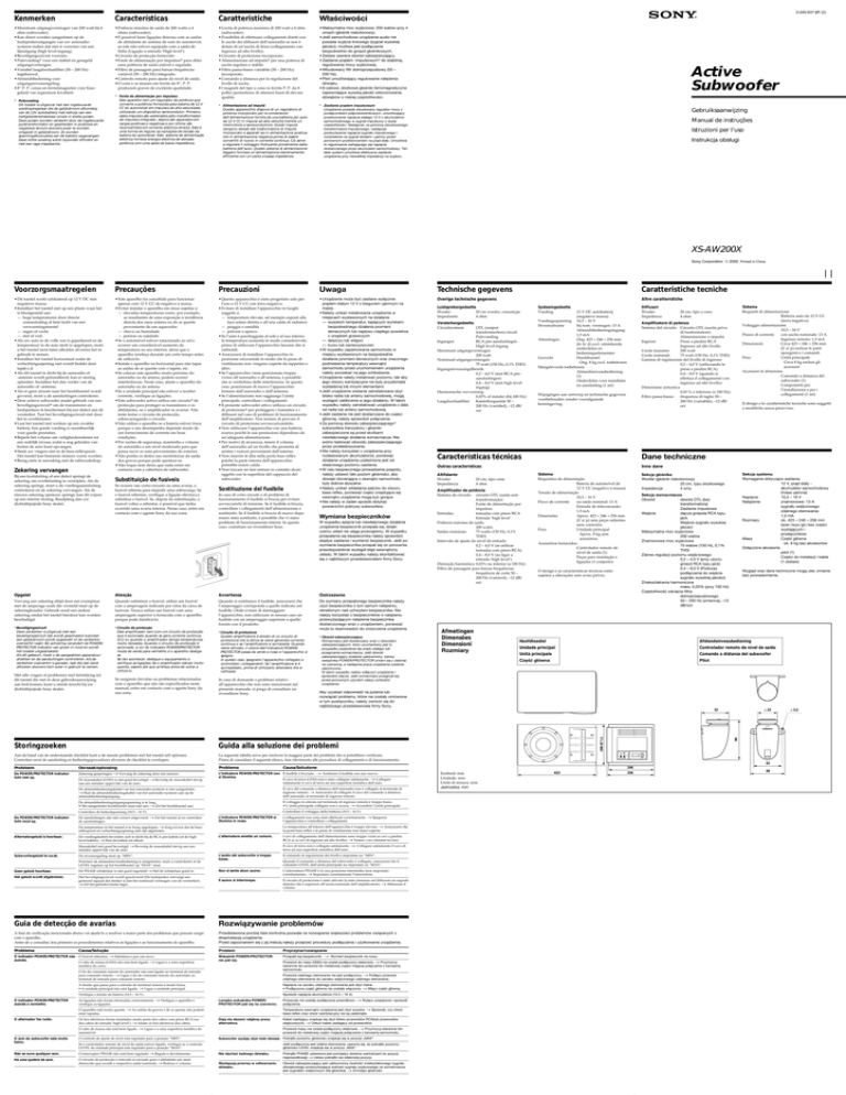3-245-937-21 (2) Kenmerken Características Caratteristiche Właściwości •Maximum uitgangsvermogen van 200 watt bij 4 ohm (subwoofer). •Kan direct worden aangesloten op de luidsprekeruitgangen van uw autoradiosysteem indien dat niet is voorzien van een lijnuitgang (high level-ingang). •Beveiligingscircuit voorzien. •Pulsvoeding* voor een stabiel en geregeld uitgangsvermogen. •Variabel laagdoorlaatfilter (50 – 200 Hz) ingebouwd. •Afstandsbediening voor uitgangsniveauregeling. •8” P. P. conus en ferrietmagneten voor bassgeluid van superieure kwaliteit. •Potência máxima de saída de 200 watts a 4 ohms (subwoofer). •É possível fazer ligações directas com as saídas de altifalante do sistema de som do automóvel, se este não estiver equipado com a saída de linha (Ligação à entrada ‘High level’). •Circuito de protecção fornecido. •Fonte de alimentação por impulsos* para obter uma potência de saída estável e regulada. •Filtro de passagem para baixas frequências variável (50 – 200 Hz) integrado. •Controlo remoto para ajuste do nível de saída. •O cone e os imanes em ferrite de 8”‚ P. P. produzem graves de excelente qualidade. •Uscita di potenza massima di 200 watt a 4 ohm (subwoofer). •Possibilità di effettuare collegamenti diretti con le uscite dei diffusori dell’autoradio se non è dotata di un’uscita di linea (collegamento con ingresso ad alto livello). •Circuito di protezione incorporato. •Alimentazione ad impulsi* per una potenza di uscita regolare e stabile. •Filtro passa-basso variabile (50 – 200 Hz) incorporato. •Comando a distanza per la regolazione del livello di uscita. •I magneti del tipo a cono in ferrite P. P. da 8 pollici permettono di ottenere bassi di elevata qualità. •Maksymalna moc wyjściowa: 200 watów przy 4 omach (głośnik niskotonowy). •Jeśli samochodowe urządzenie audio nie posiada wyjścia liniowego (sygnał wysokiej jakości), możliwe jest podłączenie bezpośrednio do gniazd głośnikowych. •Zestaw zawiera obwód zabezpieczający. •Zasilanie prądem impulsowym* do stabilnej, regulowanej mocy wyjściowej. •Wbudowany filtr dolnoprzepustowy (50 – 200 Hz). •Pilot umożliwiający regulowanie natężenia dźwięku. •8-calowe, stożkowe głośniki ferromagnetyczne zapewniające wysoką jakość odwzorowania dźwięków o niskiej częstotliwości. * Alimentazione ad impulsi Questo apparecchio dispone di un regolatore di potenza incorporato per la conversione dell’alimentazione fornita da una batteria per auto da 12 V CC in impulsi ad alta velocità tramite un interruttore a semiconduttore. Questi impulsi vengono elevati dal trasformatore di impulsi incorporato e separati sia in alimentazione positiva che in alimentazione negativa prima di essere convertiti di nuovo in corrente continua. Ciò serve a regolare il voltaggio fluttuante proveniente dalla batteria dell’auto. Questo sistema di alimentazione leggero fornisce un’alimentazione estremamente efficiente con un’uscita a bassa impedenza. * Zasilanie prądem impulsowym Urządzenie posiada wbudowany regulator mocy z przełącznikiem półprzewodnikowym, umożliwiający przetworzenie napięcia stałego 12 V z akumulatora samochodowego w sygnał impulsowy o dużej częstotliwości. Następnie, za pomocą wbudowanego transformatora impulsowego, następuje podwyższenie napięcia sygnału impulsowego i rozdzielenie na sygnał dodatni i ujemny przed ponownym przetworzeniem na prąd stały. Umożliwia to regulowanie wahającego się napięcia dostarczanego przez akumulator samochodowy. Ten lekki system umożliwia efektywne zasilanie urządzenia przy niewielkiej impedancji na wyjściu. * Pulsvoeding Dit toestel is uitgerust met een ingebouwde voedingsregelaar die de gelijkstroom afkomstig van de 12V autobatterij met behulp van een halfgeleiderschakelaar omzet in snelle pulsen. Deze pulsen worden versterkt door de ingebouwde pulstransformator en gescheiden in positieve en negatieve stroom alvorens weer te worden omgezet in gelijkstroom. Zo worden spanningsfluctuaties van de batterij opgevangen. Deze lichte voeding werkt bijzonder efficiënt en met een lage impedantie. * Fonte de alimentação por impulsos Este aparelho tem um regulador de potência que converte a potência fornecida pela bateria de 12 V CC do automóvel em impulsos de alta velocidade, utilizando um dispositivo semicondutor. Primeiro, estes impulsos são acelerados pelo transformador de impulsos integrado, depois são separados em cargas positivas e negativas e por último são reconvertidos em corrente eléctrica directa. Esta é uma forma de regular as oscilações de tensão da bateria do automóvel. Este sistema de alimentação eléctrica fornece energia eléctrica de elevada potência com uma saída de baixa impedância. Active Subwoofer Gebruiksaanwijzing Manual de instruções Istruzioni per l’uso Instrukcja obsługi XS-AW200X Sony Corporation 2000 Printed in China Voorzorgsmaatregelen Precauções Precauzioni Uwaga Technische gegevens Caratteristiche tecniche •Dit toestel werkt uitsluitend op 12 V DC met negatieve massa. •Installeer het toestel niet op een plaats waar het is blootgesteld aan: — hoge temperaturen door directe zonnestraling of hete lucht van een verwarmingstoestel — regen of vocht — stof of vuil. •Als uw auto in de volle zon is geparkeerd en de temperatuur in de auto sterk is opgelopen, moet u het toestel eerst laten afkoelen alvorens het in gebruik te nemen. •Installeer het toestel horizontaal zodat de verluchtingsopening niet wordt bedekt door tapijt e.d. •Als dit toestel te dicht bij de autoradio of -antenne wordt geïnstalleerd, kan er storing optreden. Installeer het dan verder van de autoradio of -antenne. •Als er geen stroom naar het hoofdtoestel wordt gevoerd, moet u de aansluitingen controleren. •Deze actieve subwoofer maakt gebruik van een beveiligingscircuit* om de transistoren en luidsprekers te b