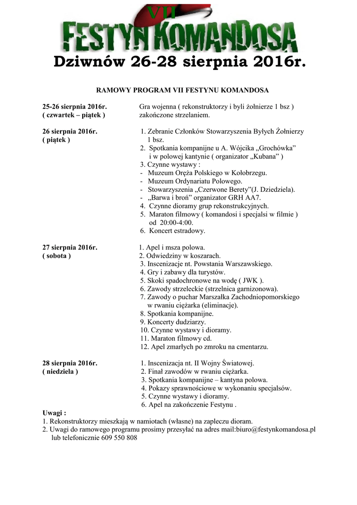 VII Dziwnów 26-28 sierpnia 2016r. RAMOWY PROGRAM VII FESTYNU KOMANDOSA 25-26 sierpnia 2016r. ( czwartek – piątek ) Gra wojenna ( rekonstruktorzy i byli żołnierze 1 bsz ) zakończone strzelaniem. 26 sierpnia 2016r. ( piątek ) 1. Zebranie Członków Stowarzyszenia Byłych Żołnierzy 1 bsz. 2. Spotkania kompanijne u A. Wójcika „Grochówka” i w polowej kantynie ( organizator „Kubana” ) 3. Czynne wystawy : - Muzeum Oręża Polskiego w Kołobrzegu. - Muzeum Ordynariatu Polowego. - Stowarzyszenia „Czerwone Berety”(J. Dziedziela). - „Barwa i broń” organizator GRH AA7. 4. Czynne dioramy grup rekonstrukcyjnych. 5. Maraton filmowy ( komandosi i specjalsi w filmie ) od 20:00-4:00. 6. Koncert estradowy. 27 sierpnia 2016r. ( sobota ) 1. Apel i msza polowa. 2. Odwiedziny w koszarach. 3. Inscenizacje nt. Powstania Warszawskiego. 4. Gry i zabawy dla turystów. 5. Skoki spadochronowe na wodę ( JWK ). 6. Zawody strzeleckie (strzelnica garnizonowa). 7. Zawody o puchar Marszałka Zachodniopomorskiego w rwaniu ciężarka (eliminacje). 8. Spotkania kompanijne. 9. Koncerty dudziarzy. 10. Czynne wystawy i dioramy. 11. Maraton filmowy cd. 12. Apel zmarłych po zmroku na cmentarzu. 28 sierpnia 2016r. ( niedziela ) 1. Inscenizacja nt. II Wojny Światowej. 2. Finał zawodów w rwaniu ciężarka. 3. Spotkania kompanijne – kantyna polowa. 4. Pokazy sprawnościowe w wykonaniu specjalsów. 5. Czynne wystawy i dioramy. 6. Apel na zakończenie Festynu . Uwagi : 1. Rekonstruktorzy mieszkają w namiotach (własne) na zapleczu dioram. 2. Uwagi do ramowego programu prosimy przesyłać na adres mail:[email protected] lub telefonicznie 609 550 808