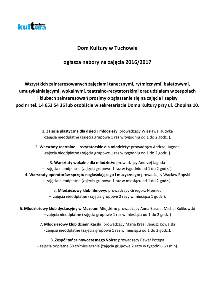 Dom Kultury w Tuchowie ogłasza nabory na zajęcia 2016/2017 Wszystkich zainteresowanych zajęciami tanecznymi, rytmicznymi, baletowymi, umuzykalniającymi, wokalnymi, teatralno-recytatorskimi oraz udziałem w zespołach i klubach zainteresowań prosimy o zgłaszanie się na zajęcia i zapisy pod nr tel. 14 652 54 36 lub osobiście w sekretariacie Domu Kultury przy ul. Chopina 10. 1. Zajęcia plastyczna dla dzieci i młodzieży: prowadzący Wiesława Hudyka -zajęcia nieodpłatne (zajęcia grupowe 1 raz w tygodniu od 1 do 2 godz. ). 2. Warsztaty teatralno – recytatorskie dla młodzieży: prowadzący Andrzej Jagoda -zajęcia nieodpłatne (zajęcia grupowe 1 raz w tygodniu od 1 do 2 godz. ). 3. Warsztaty wokalne dla młodzieży: prowadzący Andrzej Jagoda – zajęcia nieodpłatne (zajęcia grupowe 1 raz w tygodniu od 1 do 2 godz. ). 4. Warsztaty operatorów sprzętu nagłaśniającego i muzycznego: prowadzący Wacław Ropski – zajęcia nieodpłatne (zajęcia grupowe 1 raz w miesiącu od 1 do 2 godz.). 5. Młodzieżowy klub filmowy: prowadzący Grzegorz Niemiec – zajęcia nieodpłatne (zajęcia grupowe 2 razy w miesiącu 1 godz.). 6. Młodzieżowy klub dyskusyjny w Muzeum Miejskim: prowadzący Anna Baran , Michał Kulikowski – zajęcia nieodpłatne (zajęcia grupowe 1 raz w miesiącu od 1 do 2 godz.) 7. Młodzieżowy klub dziennikarski: prowadzący Maria Kras i Janusz Kowalski - zajęcia nieodpłatne (zajęcia grupowe 1 raz w miesiącu od 1 do 2 godz.). 8. Zespół tańca nowoczesnego Voice: prowadzący Paweł Potępa – zajęcia odpłatne 50 zł/miesięcznie (zajęcia grupowe 2 razy w tygodniu 60 min). Dom Kultury w Tuchowie filia w Burzynie ogłasza nabory na zajęcia 2016/2017 Wszystkich zainteresowanych zajęciami: plastycznymi, tanecznymi, rytmicznymi, baletowymi, umuzykalniającymi prosimy o zgłaszanie się na zajęcia i zapisy pod nr tel. 14 652 54 36 lub osobiście w sekretariacie Domu Kultury przy ul. Chopina 10. O szczegółach informować będziemy odrębnymi komunikatami. 1. Zajęcia rytmiczno-baletowe: prowadzący Natalia Pawlak – zajęcia odpłatne 50 zł/miesięcznie (zajęcia grupowe 1 raz w tygodniu 60 min). 2. Zajęcia taneczne – taniec towarzyski: -zajęcia odpłatne 50 zł/miesięcznie (zajęcia grupowe 1 raz w tygodniu 60 min). 3. Zajęcia tańca współczesnego: prowadzący Edyta Jagoda - Kucharzyk, -zajęcia odpłatne 40 zł/miesięcznie (zajęcia grupowe: I gr. 4-6 r.ż, II gr. 7-9 r.ż, 1 raz w tygodniu 60 min). 4. Zajęcia rytmiki dla dzieci: prowadzący Edyta Jagoda- Kucharzyk, - zajęcia odpłatne 40 zł/miesięcznie (zajęcia grupowe: I gr. 4-6 r.ż, II gr. 7-9 r.ż, 1 raz w tygodniu 60 min). 5. Zajęcia umuzykalniające (instrumenty klawiszowe, dęte): zajęcia prowadzić będzie Piotr Kucharzyk oraz inni wykwalifikowani muzycy (zajęcia indywidualne i grupowe 1 raz w tygodniu 35 min. 1 raz w miesiącu zajęcia grupowe 2 godz.), zajęcia odpłatne 40 zł/miesięcznie. Dom Kultury w Tuchowie filia w Siedliskach ogłasza nabory na zajęcia 2016/2017 Wszystkich zainteresowanych zajęciami: plastycznymi, tanecznymi, rytmicznymi, baletowymi, umuzykalniającymi prosimy o zgłaszanie się na zajęcia i zapisy pod nr tel. 14 652 54 36 lub osobiście w sekretariacie Domu Kultury przy ul. Chopina 10. O szczegółach informować będziemy odrębnymi komunikatami. 1. Zajęcia plastyczne dla dzieci i młodzieży: prowadzący Wiesława Hudyka – zajęcia nieodpłatne (zajęcia grupowe 1 raz w tygodniu od 1 do 2 godz.). 2. Zajęcia rytmiki dla dzieci: prowadzący Edyta Jagoda- Kucharzyk – zajęcia odpłatne 40 zł/miesięcznie (zajęcia grupowe: I gr. 4-6 r.ż, II gr. 7-9 r.ż, 1 raz w tygodniu 60 min). 3. Zajęcia tańca współczesnego: prowadzący Edyta Jagoda- Kucharzyk – zajęcia odpłatne 40 zł/miesięcznie (zajęcia grupowe: I gr. 4-6 r.ż, II gr. 7-9 r.ż, 1 raz w tygodniu 60 min). 4. Zajęcia rytmiczno-baletowe: prowadzący Natalia Pawlak – zajęcia odpłatne 50 zł/miesięcznie (zajęcia grupowe 1 raz w tygodniu 60 min). 5. Zajęcia taneczne – taniec towarzyski: - zajęcia odpłatne 50 zł/miesięcznie (zajęcia grupowe 1 raz w tygodniu 60 min). 6. Zajęcia umuzykalniające (instrumenty klawiszowe, dęte): zajęcia prowadzić będzie Piotr Kucharzyk oraz wykwalifikowani muzycy – zajęcia odpłatne 40 zł/miesięcznie (zajęcia indywidualne 1 raz w tygodniu 35 min. 1 raz w miesiącu zajęcia grupowe 2 godz.). Dom Kultury w Tuchowie filia w Jodłówce Tuchowskiej ogłasza nabory na zajęcia 2016/2017 Wszystkich zainteresowanych zajęciami: plastycznymi, tanecznymi, rytmicznymi, baletowymi, umuzykalniającymi prosimy o zgłaszanie się na zajęcia i zapisy pod nr tel. 14 652 54 36 lub osobiście w sekretariacie Domu Kultury przy ul. Chopina 10. O szczegółach informować będziemy odrębnymi komunikatami. 1. Zajęcia plastyczne dla dzieci i młodzieży: prowadzący Wiesława Hudyka – zajęcia nieodpłatne (zajęcia grupowe 1 raz w tygodniu 1 do 2 godz.). 2. Zajęcia rytmiki dla dzieci prowadzący Edyta Jagoda- Kucharzyk – zajęcia odpłatne 40 zł/miesięcznie (zajęcia grupowe: I gr. 4-6 r.ż, II gr. 7-9 r.ż, 1 raz w tygodniu 60 min). 3. Zajęcia tańca współczesnego: prowadzący Edyta Jagoda- Kucharzyk – zajęcia odpłatne 40 zł/miesięcznie (zajęcia grupowe: I gr. 4-6 r.ż, II gr. 7-9 r.ż, 1 raz w tygodniu 60 min). 4. Zajęcia umuzykalniające (instrumenty klawiszowe, dęte): zajęcia prowadzić będzie Piotr Kucharzyk oraz inni wykwalifikowani muzycy – zajęcia odpłatne 40 zł/miesięcznie (zajęcia indywidualne 1 raz w tygodniu 35 min. 1 raz w miesiącu zajęcia grupowe 2 godz.).