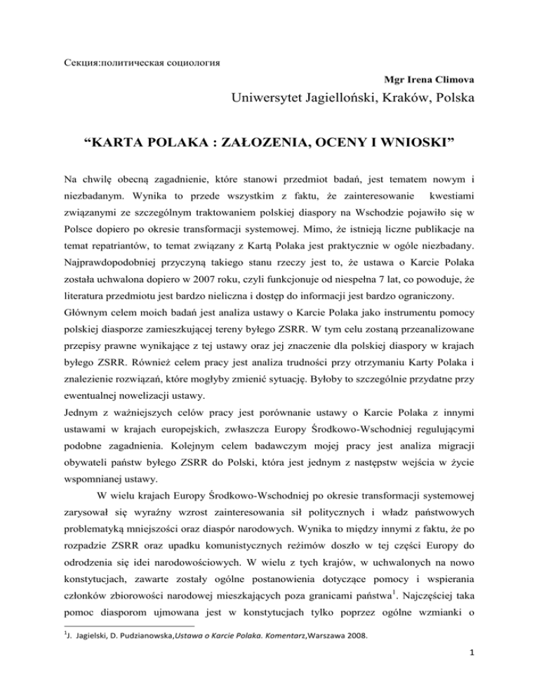 Секция:политическая социология Mgr Irena Climova Uniwersytet Jagielloński, Kraków, Polska “KARTA POLAKA : ZAŁOZENIA, OCENY I WNIOSKI” Na chwilę obecną zagadnienie, które stanowi przedmiot badań, jest tematem nowym i niezbadanym. Wynika to przede wszystkim z faktu, że zainteresowanie kwestiami związanymi ze szczególnym traktowaniem polskiej diaspory na Wschodzie pojawiło się w Polsce dopiero po okresie transformacji systemowej. Mimo, że istnieją liczne publikacje na temat repatriantów, to temat związany z Kartą Polaka jest praktycznie w ogóle niezbadany. Najprawdopodobniej przyczyną takiego stanu rzeczy jest to, że ustawa o Karcie Polaka została uchwalona dopiero w 2007 roku, czyli funkcjonuje od niespełna 7 lat, co powoduje, że literatura przedmiotu jest bardzo nieliczna i dostęp do informacji jest bardzo ograniczony. Głównym celem moich badań jest analiza ustawy o Karcie Polaka jako instrumentu pomocy polskiej diasporze zamieszkującej tereny byłego ZSRR. W tym celu zostaną przeanalizowane przepisy prawne wynikające z tej ustawy oraz jej znaczenie dla polskiej diaspory w krajach byłego ZSRR. Również celem pracy jest analiza trudności przy otrzymaniu Karty Polaka i znalezienie rozwiązań, które mogłyby zmienić sytuację. Byłoby to szczególnie przydatne przy ewentualnej nowelizacji ustawy. Jednym z ważniejszych celów pracy jest porównanie ustawy o Karcie Polaka z innymi ustawami w krajach europejskich, zwłaszcza Europy Środkowo-Wschodniej regulującymi podobne zagadnienia. Kolejnym celem badawczym mojej pracy jest analiza migracji obywateli państw byłego ZSRR do Polski, która jest jednym z następstw wejścia w życie wspomnianej ustawy. W wielu krajach Europy Środkowo-Wschodniej po okresie transformacji systemowej zarysował się wyraźny wzrost zainteresowania sił politycznych i władz państwowych problematyką mniejszości oraz diaspór narodowych. Wynika to między innymi z faktu, że po rozpadzie ZSRR oraz upadku komunistycznych reżimów doszło w tej części Europy do odrodzenia się idei narodowościowych. W wielu z tych krajów, w uchwalonych na nowo konstytucjach, zawarte zostały ogólne postanowienia dotyczące pomocy i wspierania członków zbiorowości narodowej mieszkających poza granicami państwa1. Najczęściej taka pomoc diasporom ujmowana jest w konstytucjach tylko poprzez ogólne wzmianki o 1 J. Jagielski, D. Pudzianowska,Ustawa o Karcie Polaka. Komentarz,Warszawa 2008. 1 obowiązku i potrzebie niesienia pomocy rodakom, natomiast w niektórych krajach istnieją również szczegółowe rozwiązania w ustawodawstwie zwykłym, mające na celu wsparcie i podtrzymywanie kontaktów z diasporą. Pewne klauzule konstytucyjne odnoszące się do pomocy diasporom odnotować można również w niektórych krajach Europy Zachdniej (np we Włoszech, Austrii), natomiast tym co charakteryzuje kraje Europy Środkowo-Wschodniej to regulowanie stosunków z diasporą w drodze specjalnych ustaw2. Ustawy mające na celu wsparcie i podtrzymanie kontaktów z diasporą uchwaliły takie kraje Unii Europejskiej w regionie Europy Środkowo-Wschodniej jak na przykład Węgry (ustawa z 2001 r.), Słowacja (ustawa z 2005 r.), Słowenia (ustawa z 2006 r.), Rumunia (ustawa z 1998 r.), Bułgaria (ustawa z 2000 r.). Tego rodzaju ustawy można przestrzegać jako instrument odbudowywania i umocniania kontaktów z diasporą. Również takiego rodzaju ustawy można postrzegać jako chęć pomocy rodakom w innych krajach, które stanowią tam mniejszość narodową na przykład w wymiarze społeczno-ekonomicznym.Zdaniem wielu badaczy uchwalanie takiego typu dokumentów jest elementem polityki narodowościowej, która dąży do podtrzymywania więzi zagranicznych mniejszości z ojczyzną i niedopuszcza do jej asymilacji3. Takie ustawy specjalne, odnoszące się do problematyki kontaktów państw z diasporami narodowymi i ich wspierania, znacząco się różnią jak pod względem sposobów regulacji, tak i treści ustaw. Z jednej strony można wyróżnić ustawy, które odwołują się do wszystkich członków diaspory w sposób ogólny (np, ustawa rumuńska), natomiast są też ustawy, które tworzą specjalny status dla członków diaspory i przyznają im urzędowe dokumenty poświadczający ich status (np,węgierska”Karta Węgra)4. W Polsce takim dokumentem jest Karta Polaka. Jest to dokument potwierdzający przynależność do narodu polskiego osób pochodzących z krajów byłego ZSRR, które nie posiadają obywatelstwa polskiego oraz zezwolenia na osiedlenie się na terytorium Rzeczypospolitej Polskiej, ale deklarują swoją przynależność do narodu polskiego i spełniają określone warunki. Aby otrzymać Kartę Polaka trzeba udowodnić, że co najmniej jedno z rodziców lub dziadków albo dwoje pradziadków było narodowości polskiej lub posiadało obywatelstwo polskie. Inną możliwością jest przedstawienie zaświadczenie organizacji polonijnej, potwierdzające aktywne zaangażowanie w działalność na rzecz języka i kultury polskiej mniejszości narodowej przez okres co najmniej ostatnich trzech lat5. 2 Tamże Tamże 4 B. Góralczyk,Węgierski pakiet,Warszawa 2000. 5 Ustawa z dnia 7 września 2007 r.o Karcie Polaka (Dz.U.z 2007 r.Nr 180,poz 1280)preambuła 3 2 Uchwalanie ustawy dotyczącej Karty Polaka planowane było od dłuższego czasu, jednak koncepcje zmieniały się w czasie i dotyczyły tak zasadniczych kwestii czy powinna odnosić się do Polaków na całym świecie czy jedynie tych zamieszkujących teren byłego ZSRR. Ustawa o Karcie Polaka pojawiła się po raz pierwszy jako przedmiot debat parlamentarnych w 1999 roku. Pierwotnie projekt ustawy o Karcie Polaka był częścią szerszego projektu legislacyjnego obejmującego także projekty dwóch innnych ustaw: dotyczących repatriacji oraz zmian w obywatelstwie polskim6. Pierwotnie projekt ustawy o Karcie Polaka odnosił się nie tylko do obywatel