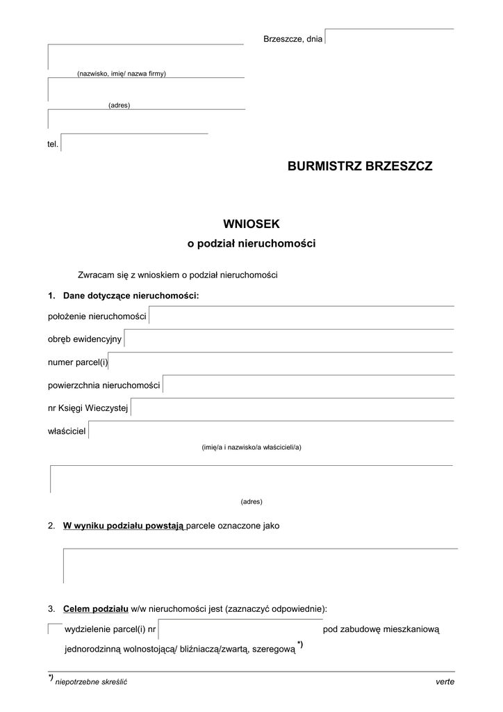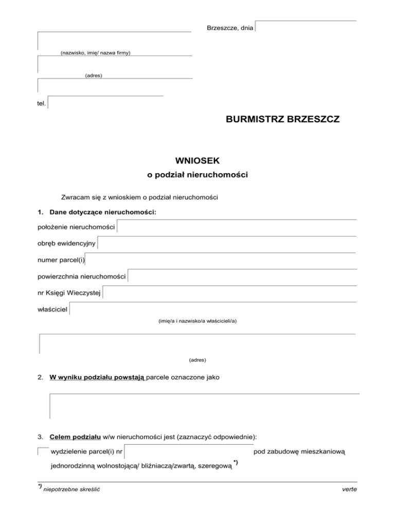 Brzeszcze, dnia (nazwisko, imię/ nazwa firmy) (adres) tel. BURMISTRZ BRZESZCZ WNIOSEK o podział nieruchomości Zwracam się z wnioskiem o podział nieruchomości 1. Dane dotyczące nieruchomości: położenie nieruchomości obręb ewidencyjny numer parcel(i) powierzchnia nieruchomości nr Księgi Wieczystej właściciel (imię/a i nazwisko/a właścicieli/a) (adres) 2. W wyniku podziału powstają parcele oznaczone jako 3. Celem podziału w/w nieruchomości jest (zaznaczyć odpowiednie): wydzielenie parcel(i) nr jednorodzinną wolnostojącą/ bliźniaczą/zwartą, szeregową *) niepotrzebne skreślić pod zabudowę mieszkaniową *) verte wydzielenie parcel(i) nr pod zabudowę usługową (określić rodzaj usług) wydzielenie parcel(i) nr pod drogę stanowiącą dojazd do nieruchomości wydzielenie parcel(i) nr na poprawę zagospodarowania parceli sąsiedniej nr inne podział w oparciu o przepisy art. 95 ust ustawy o gospodarce nieruchomościami w celu 4. Określenie dostępu nowo projektowanych parcel do drogi publicznej: dostęp bezpośredni parcelą wydzieloną z przeznaczeniem pod drogę wewnętrzną ustanowienie służebności dojazdu 1. 2. (podpis wnioskodawcy/ów) ZAŁĄCZNIKI* : ) 1. aktualny dokument stwierdzający tytuł prawny do nieruchomości, 2. wypis i wyrys z katastru nieruchomości 3. wstępny projekt podziału nieruchomości wykonany na kopii mapy zasadniczej z wyjątkiem podziałów o których mowa w art.95, 4. protokół z przyjęcia granic nieruchomości, 5. mapa z projektem podziału, 6. wykaz zmian gruntowych 7. wykaz synchronizacyjny, jeżeli oznaczenie działek gruntów w katastrze nieruchomości jest inne niż w księdze wieczystej, 8. pozwolenie na podział Wojewódzkiego Konserwatora Zabytków (dotyczy nieruchomości wpisanej do rejestru zabytków) 9. inne .................................................................... _________________________________________________________________________________________________ Pouczenie: Zwolnione z opłaty skarbowej na podstawie art. 2 ust.1 pkt 1 ppkt h ustawy z 16 listopada 2006r o opłacie skarbowej (Dz. U z 2006r, Nr 225, poz. 1635) *) niepotrzebne skreślić Wersja 3
