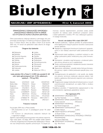 SPRAWOZDANIE Z DZIAŁALNOŚCI SAMORZĄDU ZAWODOWEGO FARMACEUTÓW W OKRESIE OD STYCZNIA DO KOŃCA GRUDNIA 2004 ROKU. Okres sprawozdawczy obejmuje zdarzenia z pierwszego roku prac samorządu zawodowego w IV kadencji po Krajowym Zjeździe Aptekarzy w Licheniu Starym, który się odbył w dniach 22-24 stycznia 2004 roku. W ramach izb aptekarskich działa obecnie 20 okręgowych struktur. Okręgowe Izby Aptekarskie l l l l l l l l l l Białostocka Beskidzka Pomorsko-Kujawska Częstochowska Gdańska Katowicka Kielecka Środkowopomorska Krakowska Lubelska l l l l l l l l l l Łódzka Olsztyńska Opolska Wielkopolska Podkarpacka Zachodniopomorska Warszawska Dolnośląska Lubuska Kaliska (od 1995 r.). Liczba członków OIA w Polsce 31.12.2003 roku wynosiła 23.168 osób. Aptek ogólnodostępnych było 10.406, zakładowych, szpitalnych – 790 (wg NRA) Białystok Bielsko-Biała Bydgoszcz Częstochowa Gdańsk Katowice Kielce Koszalin Kraków Lublin 643/435/24 478/222/15 1021/532/42 376/238/15 1848/647/37 2104/898/79 589/347/23 397/195/14 2198/864/ 49 1810/735/ 42 Łódź 2033/875/55 Olsztyn 438/256/37 Opole 426/241/26 Poznań 1590/739/56 Rzeszów 980/505/32 Szczecin 487/271/29 Wrocław 1924/831/68 Zielona Góra 441/272/25 Warszawa 3087/1230/111 Kalisz 298/163/11 Producenci i hurtownie Na początku 2004 roku w Polsce działało: – 328 producentów (w tym 15 posiadających ponad 1% udział w rynku). – 543 hurtowni (w zdecydowanej większości lokalnych lub o regionalnym zasięgu) Zgodnie z zapowiedzią poczynioną przeze mnie podczas wspomnianego wyżej zjazdu, od lutego 2004 roku podjęte zostały działania w kierunku reorganizacji biura Naczelnej Izby Aptekarskiej w Warszawie oraz funkcjonowania zespołów pomocniczych. Te zespoły po- mocnicze, nazwane departamentami, powołane zostały przede wszystkim do realizacji zadań określonych przepisami ustawy o izbach aptekarskich z kwietnia 1991 roku i deklaracjami zjazdowymi naszego środowiska. Kierunki i cele działania NRA w latach 2004-2007 n Uzyskanie społecznej i rządowej aprobaty do przeprowadzania zmian legislacyjnych służących poprawie warunków wykonywania zawodu aptekarza. n Współpraca z organizacjami branżowymi (naukowymi i gospodarczymi) w celu realizacji ustawowych zadań postawionych przed izbą. n Wypracowanie zasad współpracy z uczelniami wyższymi w celu stałego podnoszenia jakości świadczonej pracy przez farmaceutów. n Podnoszenie i utrwalenie rangi farmaceuty w strukturach jednostek ochrony zdrowia (w tym w szpitalnictwie). n Troska o zachowanie godności i niezależności zawodu, krzewienie zasad i deontologii zawodu. n Zapewnienie najmłodszej i przyszłej kadrze fachowej farmaceutów pomocy i opieki w trakcie poznawania specyfiki pracy w zawodzie. n Przeorganizowanie izb aptekarskich w taki sposób, aby działały one sprawnie, terminowo realizowały ustawowe zadania i były każdemu aptekarzowi (farmaceucie) wsparciem przy wykonywaniu zawodu. n Przygotowanie naszego środowiska do funkcjonowania w nowych uwarunkowaniach zewnętrznych, po wejściu Polski w struktury Unii Europejskiej. Początkowo powołano 17 departamentów pogrupowanych w trzy piony tematyczne: organizacyjny, gospodarczy i prawny. Pion organizacyjny (PO) n DEPARTAMENT ORGANIZACYJNY mgr Piotr Pasierbiak (Łódź) n DEPARTAMENT SPRAW ZAGRANICZNYCH dr Jerzy Łazowski (Warszawa) n DEPARTAMENT INFORMACJI mgr Michał Grzegorczyk (Lublin) n DEPARTAMENT ODWOŁAWCZY dr Stefan Kaliszuk (Lublin) n FORUM MŁODYCH APTEKARZY dr Paweł Chrzan (Gdańsk) n DEPARTAMENT KONSOLIDACJI, INTEGRACJI I STRATEGII PROGRAMOWEJ mgr Joanna Piątkowska (Wrocław) n DEPARTAMENT INTERWENCJI mgr Alina Fornal (Warszawa) Pion prawny (PP) n DEPARTAMENT PRAWNY dr Wojciech Giermaziak (Łódź) n DEPARTAMENT ETYKI I DEONTOLOGII ZAWODU mgr Marian Mikulski (Lublin) n DEPARTAMENT PRAWA WYKONYWANIA ZAWODU I REJESTRU FARMACEUTÓW dr Stanisław Vogel (Gdańsk) n DEPARTAMENT UZNAWANIA DYPLOMÓW mgr Barbara Kozicka (Warszawa) n DEPARTAMENT NAUKI I SZKOLENIA dr Elwira Telejko (Białystok) Pion gospodarczy (PG) n DEPARTAMENT SKARBU mgr Marek Płuska (Częstochowa) n DEPARTAMENT EKONOMIKI I ZARZĄDZANIA mgr Jolanta Dahlke-Miś (Koszalin) n DEPARTAMENT INICJATYW GOSPODARCZYCH mgr Piotr Chwiałkowski (Bydgoszcz) n DEPARTAMENT APTEK SZPITALNYCH I ZAKŁADOWYCH mgr Janina Pawłowska (Kraków) n DEPARTAMENT HURTOWNI FARMACEUTYCZNYCH mgr Henrietta Kania (Kielce) Z czasem okazało się, że nie zawsze udaje się z powodzeniem wykonywać postawione przed nimi tematyczne przedsięwzięcia. Dlatego dwukrotnie w ciągu 11 miesięcy Naczelna Rada Aptekarska dokonała korekt liczby i treści zadań do wykonania przez poszczególne departamenty. Zdaję sobie sprawę, iż proces dostosowania powyższych struktur do potrzeb izby jeszcze się nie zakończył, choć widać już znaczną poprawę w ich pracy. W październiku ubiegłego roku dokonano najliczniejszych korekt i do dzisiaj nasze departamenty działają w nie zmienionym kształcie. Zestawienie zmian organizacyjnych departamentów l Likwidacja departamentu organizacyjnego. l Powołanie departamentu obrony i konsolidacji aptek. l Likwidacja departamentu prawa wykonywania zawodu i rejestru farmaceutów. l Połączenie departamentu odwoławczego z departamentem interwencji – powstaje departament odwoławczy, skarg i zażaleń. l Połączenie departamentu inicjatyw gospodarczych z departamentem ekonomiki i zarządzania – powstaje departament ekonomiki, zarządzania i inicjatyw gospodarczych. l Połączenie departamentu spraw zagranicznych z departamentem uznawania dyplomów + sprawy dotyczące prawa wykonywania zawodu – powstaje departament spraw zagranicznych, prawa wykonywania zawodu i uznawania dyplomów. l Połączenie departamentu informacji ze sprawami rejestru farmaceutów – powstaje departament informacji i rejestru farmaceutów. W tym okresie powstaje również stosunkowo dynamicznie działający departament obrony i konsolidacji aptek po