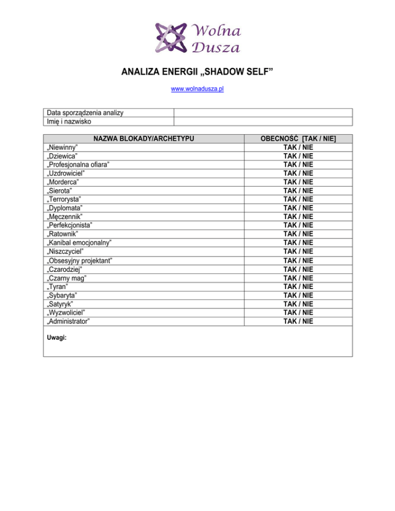 ANALIZA ENERGII „SHADOW SELF” www.wolnadusza.pl Data sporządzenia analizy Imię i nazwisko NAZWA BLOKADY/ARCHETYPU „Niewinny” „Dziewica” „Profesjonalna ofiara” „Uzdrowiciel” „Morderca” „Sierota” „Terrorysta” „Dyplomata” „Męczennik” „Perfekcjonista” „Ratownik” „Kanibal emocjonalny” „Niszczyciel” „Obsesyjny projektant” „Czarodziej” „Czarny mag” „Tyran” „Sybaryta” „Satyryk” „Wyzwoliciel” „Administrator” Uwagi: OBECNOŚĆ [TAK / NIE] TAK / NIE TAK / NIE TAK / NIE TAK / NIE TAK / NIE TAK / NIE TAK / NIE TAK / NIE TAK / NIE TAK / NIE TAK / NIE TAK / NIE TAK / NIE TAK / NIE TAK / NIE TAK / NIE TAK / NIE TAK / NIE TAK / NIE TAK / NIE TAK / NIE
