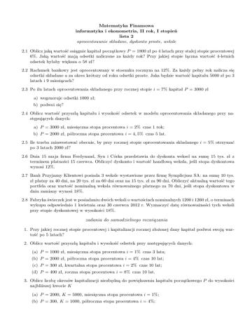 Matematyka Finansowa informatyka i ekonometria, II rok, I stopień lista 2 oprocentowanie składane, dyskonto proste, weksle 2.1 Oblicz jaką wartość osiągnie kapitał początkowy P = 1800 zł po 4 latach przy stałej stopie procentowej 6%. Jaką wartość mają odsetki naliczone za każdy rok? Przy jakiej stopie łączna wartość 4-letnich odsetek byłaby większa o 58 zł? 2.2 Rachunek bankowy jest oprocentowany w stosunku rocznym na 12%. Za każdy pełny rok nalicza się odsetki składane a za okres krótszy od roku odsetki proste. Jaka będzie wartość kapitału 5000 zł po 3 latach i 9 miesiącach? 2.3 Po ilu latach oprocentowania składanego przy rocznej stopie i = 7% kapitał P = 3000 zł a) wegeneruje odsetki 1000 zł; b) podwoi się? 2.4 Oblicz wartość przyszłą kapitału i wysokość odsetek w modelu oprocentowania składanego przy następujących danych: a) P = 3000 zł, miesięczna stopa procentowa i = 2% czas 1 rok; b) P = 2000 zł, półroczna stopa procentowa i = 4, 5% czas 5 lat. 2.5 Ile trzeba zainwestować obecnie, by przy rocznej stopie oprocentowania składanego i = 5% otrzymać po 3 latach 2000 zł? 2.6 Dnia 15 maja firma Ferdynand, Syn i Córka przedstawia do dyskonta weksel na sumę 15 tys. zł z terminem płatności 15 czerwca. Obliczyć dyskonto i wartość handlową weksla, jeśli stopa dyskontowa wynosi 12%. 2.7 Bank Przyjazny Klientowi posiada 3 weksle wystawione przez firmę Symplicjusz SA: na sumę 10 tys. zł płatny za 40 dni, na 20 tys. zł za 60 dni oraz na 15 tys. zł za 90 dni. Obliczyć aktualną wartość tego portfela oraz wartość nominalną weksla równoważnego płatnego za 70 dni, jeśli stopa dyskontowa w dniu zamiany wynosi 18%. 2.8 Fabryka świeczek jest w posiadaniu dwóch weksli o wartościach nominalnych 1200 i 1260 zł, o terminach wykupu odpowiednio 1 kwietnia oraz 30 czerwca 2012 r. Wyznaczyć datę równoważności tych weksli przy stopie dyskontowej w wysokości 18%. zadania do samodzielnego rozwiązania 1. Przy jakiej rocznej stopie procentowej i kapitalizacji rocznej złożonej dany kapitał podwoi swoją wartość po 5 latach? 2. Oblicz wartość przyszłą kapitału i wysokość odsetek przy następujących danych: (a) P = 1000 zł, miesięczna stopa procentowa i = 1% czas 3 lata; (b) P = 2000 zł, półroczna stopa procentowa i = 4% czas 10 lat; (c) P = 300 zł, kwartalna stopa procentowa i = 2% czas 10 lat; (d) P = 400 zł, roczna stopa procentowa i = 8% czas 10 lat. 3. Oblicz liczbę okresów kapitalizacji niezbędną do powiększenia kapitału początkowego P do wysokości najbliższej kwocie K (a) P = 2000, K = 5000, miesięczna stopa procentowa i = 1%; (b) P = 300, K = 1000, półroczna stopa procentowa i = 4%; (c) P = 1000, K = 2000, kwartalna stopa procentowa i = 2%; (d) P = 400, K = 5000, roczna stopa procentowa i = 8%. 4. Z kapitału 100 zł po czterech latach chcemy uzyskać 250 zł. Na jaki procent musimy złożyć kapitał do banku, aby przy rocznej kapitalizacji odsetek osiągnąć zamierzony cel? 5. Ustalić stan książeczki po 10 latach, jeżeli dokonano w niej następujących operacji: na początku wpłacono 10 jp, po 5 latach wypłacono 20 jp, a po następnym roku wpłacono 40 jp. Bank stosuje kapitalizację złożoną roczną przy stopie i = 7%. 6. Przy jakiej stopie procentowej kapitał podwoi się w ciągu 7 lat, jeśli odsetki kapitalizuje się rocznie? Porównaj wynik dokładny i otrzymany zgodnie z ”regułą 70”. 7. Przesledź proces narastania kapitału w zależności od wielkości stopy procentowej zgodnie z ideą procentu złożonego, numerycznie i graficznie. P = 10 zł, i = 2%, 4%, 6%, 8%, 10% przez okres 10 lat, kapitalizacja roczna. 8. Jaką kwotę otrzyma firma za weksel o wartości nominalnej 9 tys. zł z terminem płatności za 3 miesiące, jeżeli roczna stopa dyskontowa w wybranym przez nią banku wynosi 14%? 9. Na 72 dni przed terminem spłaty zdyskontowano weksel wystawiony na 12 tys. zł. Dyskonto wyniosło 540 zł. Jaką zastosowano stopę procentową? 10. Jaki powiniem być termin wykupu weksla o wartości nominalnej 4 tys. zł, jeśli pan Skarbimir chce uzyskać zań 21 lutego 1996 roku co najmniej 3800 zł, a stopa dyskontowa wynosi 16%?