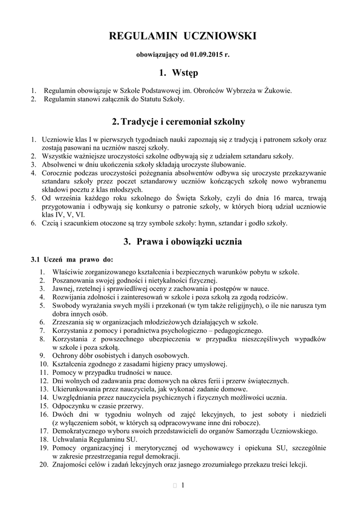 REGULAMIN UCZNIOWSKI obowiązujący od 01.09.2015 r. 1. Wstęp 1. 2. Regulamin obowiązuje w Szkole Podstawowej im. Obrońców Wybrzeża w Żukowie. Regulamin stanowi załącznik do Statutu Szkoły. 2. Tradycje i ceremoniał szkolny 1. Uczniowie klas I w pierwszych tygodniach nauki zapoznają się z tradycją i patronem szkoły oraz zostają pasowani na uczniów naszej szkoły. 2. Wszystkie ważniejsze uroczystości szkolne odbywają się z udziałem sztandaru szkoły. 3. Absolwenci w dniu ukończenia szkoły składają uroczyste ślubowanie. 4. Corocznie podczas uroczystości pożegnania absolwentów odbywa się uroczyste przekazywanie sztandaru szkoły przez poczet sztandarowy uczniów kończących szkołę nowo wybranemu składowi pocztu z klas młodszych. 5. Od września każdego roku szkolnego do Święta Szkoły, czyli do dnia 16 marca, trwają przygotowania i odbywają się konkursy o patronie szkoły, w których biorą udział uczniowie klas IV, V, VI. 6. Czcią i szacunkiem otoczone są trzy symbole szkoły: hymn, sztandar i godło szkoły. 3. Prawa i obowiązki ucznia 3.1 Uczeń ma prawo do: 1. 2. 3. 4. 5. 6. 7. 8. 9. 10. 11. 12. 13. 14. 15. 16. 17. 18. 19. 20. Właściwie zorganizowanego kształcenia i bezpiecznych warunków pobytu w szkole. Poszanowania swojej godności i nietykalności fizycznej. Jawnej, rzetelnej i sprawiedliwej oceny z zachowania i postępów w nauce. Rozwijania zdolności i zainteresowań w szkole i poza szkołą za zgodą rodziców. Swobody wyrażania swych myśli i przekonań (w tym także religijnych), o ile nie narusza tym dobra innych osób. Zrzeszania się w organizacjach młodzieżowych działających w szkole. Korzystania z pomocy i poradnictwa psychologiczno – pedagogicznego. Korzystania z powszechnego ubezpieczenia w przypadku nieszczęśliwych wypadków w szkole i poza szkołą. Ochrony dóbr osobistych i danych osobowych. Kształcenia zgodnego z zasadami higieny pracy umysłowej. Pomocy w przypadku trudności w nauce. Dni wolnych od zadawania prac domowych na okres ferii i przerw świątecznych. Ukierunkowania przez nauczyciela, jak wykonać zadanie domowe. Uwzględniania przez nauczyciela psychicznych i fizycznych możliwości ucznia. Odpoczynku w czasie przerwy. Dwóch dni w tygodniu wolnych od zajęć lekcyjnych, to jest soboty i niedzieli (z wyłączeniem sobót, w których są odpracowywane inne dni robocze). Demokratycznego wyboru swoich przedstawicieli do organów Samorządu Uczniowskiego. Uchwalania Regulaminu SU. Pomocy organizacyjnej i merytorycznej od wychowawcy i opiekuna SU, szczególnie w zakresie przestrzegania reguł demokracji. Znajomości celów i zadań lekcyjnych oraz jasnego zrozumiałego przekazu treści lekcji. 1 3.2 Uczeń ma obowiązek: 1. 2. 3. 4. 5. 6. 7. 8. 9. 10. 11. 12. 13. 14. 15. 16. 17. 18. 19. 20. 21. 22. 23. 24. 25. 26. 27. Przestrzegania formalnych reguł współżycia w szkole (przepisy szkolne) – punkt 4. Przestrzegania norm etycznych: poszanowania godności własnej i innych tolerancji wobec inności nietykalności fizycznej w stosunku do innych osób czystości języka – bez wulgaryzmów przestrzegania zasad kultury i higieny osobistej Chronienia własnego życia i zdrowia. Bezwzględnego przestrzegania zakazu posiadania i używania środków psychotropowych, nikotyny (papierosów, tabaki) i alkoholu. Przestrzegania zakazu posiadania i używania środków pirotechnicznych oraz innych przedmiotów niebezpiecznych. Przeciwdziałania zagrożeniom życia i zdrowia swojego i innych – powiadamiania pracownika szkoły o każdym zagrożeniu bezpieczeństwa, szczególnie zagrożeniu pożarowym i wypadkowym. Zawiadamiania nauczyciela dyżurnego podczas przerwy lub nauczyciela przedmiotu o każdym wypadku, jaki zdarzył się uczniowi lub pracownikowi szkoły oraz o uszkodzeniu sprzętu lub urządzeń zagrażającym zdrowiu lub życiu. Dbania o ład i porządek oraz wspólne dobro szkoły i jej estetyczny wygląd. Zawiadamiania o każdej zauważonej kradzieży. Nie powodowania swym postępowaniem zagrożeń wypadkowych wobec siebie i innych osób: przestrzegania ruchu prawostronnego wewnątrz budynku szkoły przestrzegania zakazu biegania, popychania innych, ślizgania się wchodzenia i wychodzenia z sal lekcyjnych według porządku ustalonego prze nauczycieli (nie wolno wybiegać) przestrzegania zakazu krzyczenia bez uzasadnienia bezpiecznego korzystania z urządzeń na „zielonej sali” Szanowania sprzętu szkolnego, pomocy naukowych, rzeczy osobistych i naprawiania wyrządzonych szkód. za świadomie wyrządzone przez ucznia szkody materialną odpowiedzialność ponoszą rodzice ucznia Pozostawiania sal lekcyjnych w nienagannym porządku. Bezwzględnego przestrzegania regulaminów w pracowni przyrodniczej, technicznej, informatycznej oraz w salach gimnastycznych, świetlicy i bibliotece szkolnej. Starannego i sumiennego odrabiania prac domowych. Starannego prowadzenia zeszytów i ćwiczeń, zgodnie z wymaganiami nauczycieli. Przynoszenia na zajęcia edukacyjne przyborów szkolnych, według wymagań nauczycieli. Codziennego posiadania dzienniczka ucznia – do wglądu nauczycieli. Wykonywania poleceń wszystkich pracowników szkoły. Przestrzegania poleceń uczniów pełniących dyżur na terenie szkoły. Okazywania szacunku rodzicom, nauczycielom i pracownikom szkoły. Punktualnego i systematycznego przychodzenia na zajęcia. Aktywnego udziału w lekcjach i przestrzegania zasad porządkowych. Uzupełnienia braków wynikających z absencji (nieobecności). Zgłaszania nieprzygotowania do zajęć na początku lekcji. Traktowania wyborów do władz SU z całą powagą, aby funkcje w nich objęły osoby godne zaufania i odpowiedzialne. Respektowania uchwał władz SU lub odwoływania go, jeżeli nie spełnia swoich funkcji. Uczestnictwa co najmniej jednego przedstawiciela zarządu klasowego w zebraniu ogólnym samorządu. 2 28. Reprezentowania szkoły i dbania o jej dobre imię (znać patrona, hymn, symbole