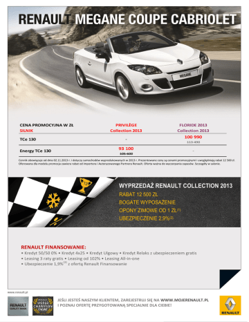 CENA PROMOCYJNA W ZŁ SILNIK PRIVILÈGE Collection 2013 FLORIDE 2013 Collection 2013 - TCe 130 93 100 Energy TCe 130 105 600 100 990 113 490 - Cennik obowiązuje od dnia 02.11.2013 r. i dotyczy samochodów wyprodukowanych w 2013 r. Prezentowane ceny są cenami promocyjnymi i uwzględniają rabat 12 500 zł. Oferowana dla modelu promocja zawiera rabat od importera i Autoryzowanego Partnera Renault. Oferta ważna do wyczerpania zapasów. Szczegóły w salonie. WYPRZEDAŻ RENAULT COLLECTION 2013 RABAT 12 500 ZŁ BOGATE WYPOSAŻENIE OPONY ZIMOWE OD 1 ZŁ(1) UBEZPIECZENIE 2,9%(2) RENAULT FINANSOWANIE: • Kredyt 50/50 0% • Kredyt 4x25 • Kredyt Ulgowy • Kredyt Relaks z ubezpieczeniem gratis • Leasing 3 raty gratis • Leasing od 102% • Leasing All-in-one • Ubezpieczenie 1,9%(3) z ofertą Renault Finansowanie JEŚLI JESTEŚ NASZYM KLIENTEM, ZAREJESTRUJ SIĘ NA WWW.MOJERENAULT.PL I POZNAJ OFERTĘ PRZYGOTOWANĄ SPECJALNIE DLA CIEBIE! Privilège Collection 2013 SL Floride 2013 Collection 2013 ABS z s ys temem ws poma ga ni a na głego ha mowa ni a (AFU) Sys tem dyna mi cznej kontrol i toru ja zdy (ESC) Regul a tor-ogra ni czni k prędkoś ci Czołowa podus zka powi etrzna ki erowcy i pa s a żera dos tos owujące s i ę do s i ły Możl i woś ć ręcznej deza ktywa cji podus zki powi etrznej pa s a żera z przodu Podus zki powi etrzne za pobi ega jące nurkowa ni u wbudowa ne w fotel e przedni e ● ● ● ● ● ● ● ● ● ● ● ● Boczne podus zki powi etrzne chroni ące głowę, kl a tkę pi ers i ową i mi edni cę os ób s i edzących na przedni ch mi ejs ca ch ● ● ● ● ● ● ● ● 3-punktowe pa s y bezpi eczeńs twa , z na pi na cza mi dos tos owującymi s i ę do s i ły zderzeni a i ogra ni czni ka mi na pi ęci a , na przedni ch mi ejs ca ch ● ● 3-punktowe pa s y bezpi eczeńs twa z ogra ni czni ka mi na pi ęci a na tyl nych mi ejs ca ch Sygna l i za cja ni eza pi ęci a pa s a bezpi eczeńs twa ki erowcy i pa s a żera z przodu 2-punktowy s ys tem mocowa ni a fotel i ka dl a dzi ecka ISOFIX na tyl nych mi ejs ca ch ● ● ● ● ● ● ● ● ● ● ● ● ● ● ● ● ● ● ● ● ● ● ● P P ● ● ● ● ● ● ● ● ● ● ● ● ● ● ● ● ● P ● ● ● ● ● ● ● ● ● BEZPIECZEŃSTWO CZYNNE I BIERNE Pa łąki przeci wka pota żowe Automa tyczni e włącza ne ś wi a tła a wa ryjne w ra zi e na głego ha mowa ni a Za główki za pobi ega jące ura zom kręgów s zyjnych, z regul a cją wys okoś ci na przedni ch mi ejs ca ch Dwa za główki z tyłu ZABEZPIECZENIE SAMOCHODU El ektroni czni e kodowa ny s ys tem bl oka dy za płonu Automa tyczna bl oka da drzwi podcza s ja zdy Ins ta l a cja do monta żu a l a rmu SYSTEMY UŁATWIAJĄCE PROWADZENIE El ektryczne, zmi enne ws poma ga ni e ukła du ki erowni czego Ręczny ha mul ec pos tojowy Komputer pokła dowy Ka rta Rena ul t Ha nds Free Ki erowni ca z regul a cją wys okoś ci i głębokoś ci , pokryta s kórą WIDOCZNOŚĆ – OŚWIETLENIE Świ a tła przeci wmgłowe Refl ektory bi -ks enonowe Sprys ki wa cze refl ektorów Funcja oś wi etl a ni a drogi do domu Wyci era czki przedni ej s zyby o zmi ennej częs totl i woś ci pra cy, z czujni ki em des zczu Oś wi etl eni e s chowka w des ce rozdzi el czej Oś wi etl eni e ba ga żni ka OGRZEWANIE - KLIMATYZACJA Kl i ma tyza cja a utoma tyczna , dwus trefowa KOMFORT El ektryczni e s terowa ne i s kła da ne ora z podgrzewa ne l us terka boczne El ektryczni e podnos zone s zyby boczne przedni e i tyl ne, s terowa ne i mpul s owo (z przodu), z za bezpi eczeni em przyci ęci em pa l ców (z przodu) Sys tem «Short Drop» regul ujący wys okoś ć us ta wi eni a s zyb przy za myka ni u i El ektrochroma tyczne l us terko wewnętrzne Si a tka za pobi ega jąca za wi rowa ni om powi etrza Szyba przeci wwi a trowa Podś wi etl a ne l us terka w os łona ch przeci ws łonecznych Sys tem ws poma ga ni a pa rkowa ni a tyłem Privilège Collection 2013 SL Floride 2013 Collection 2013 ● ● ● P ● 5 300 ● ● ● ● ● ● ● ● ● ● - ● 1 990 ● 430 ● Obręcze kół ze s topu meta l i l ekki ch 17" Obręcze kół ze s topu meta l i l ekki ch 18" ● 1 990 ● - Zes ta w do na pra wy opon Koło za pa s owe doja zdowe (wykl ucza zes ta w do na pra wy opon) ●/- -/● 310 / ● ●/0 2 100 - 2 800 - Ozdobna l i s twa wokół przedni ej s zyby i boków na dwozi a ora z zewnętrzne kl a mki drzwi w kol orze ma towego chromu Obudowy l us terek bocznych w kol orze cza rny, błys zczący La ki er meta l i zowa ny (GNE) + el ementy des i gn zewnętrznego w kol orze koś ci s łoni owej (ozdobna l i s twa wokół przedni ej s zyby i boków na dwozi a , obudowy ● - ● - - ● Da ch z cza rnego, błys zczącego s zkła ● ● Pa ki et Komfort: fotel e przedni e podgrzewa ne + s i a tka za pobi ega jąca za wi rowa ni om powi etrza 1 800 - Pa ki et Xenon: refl ektory bi -ks enonowe + s prys ki wa cze refl ektorów + funkcja doś wi etl a ni a za krętów 4 780 - FOTELE – SCHOWKI Fotel ki erowcy z regul a cją wys okoś ci i podpa rci a l ędźwi owego Fotel pa s a żera z przodu z regul a cją wys okoś ci Sys tem «Ea s y Entry» uła twi a jący dos tęp do tyl nych mi ejs c Fotel e przedni e podgrzewa ne Ta pi cerka ma teri a łowa łączona z el ementa mi s kóry ekol ogi cznej Ta pi cerka s kórza na łączona z el ementa mi s kóry ekol ogi cznej Środkowa kons ol a z podłoki etni ki em i s chowki em Za myka ny s chowek w des ce rozdzi el czej RADIO – NAWIGACJA – TELEFON – MULTIMEDIA Ra di oodtwa rza cz R-Pl ug&Ra di o+ Ra di oodtwa rza cz R-Pl ug&Ra di o+ 3D Sound by Arka mys ® Sys tem na wi ga cji Ca rmi na t TomTom® Li ve Ma pa Europy - wers ja rozs zerzona KOŁA INNE La ki er meta l i zowa ny La ki er meta l i zowa ny s pecja l ny (QNC) PAKIETY WYPOSAŻENIA ● = s eryjne = w opcji zamówienia P = el ement pa ki etu -= ni edos tępneopcjonalnego lub wykluczają się wzajemnie. Niektór