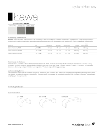 system Harmony Ława powierzchnia natural white (0-01) steel (0-02) carbon (0-03) Parametry powierzchni Natural - beton wysokiej wytrzymałości GRC barwiony w masie. Występuje naturalna zmienność i niejednolitość koloru oraz porowatość powierzchni. Powierzchnia licowa zabezpieczona systemem anty-graffiti. Wodoodporność powierzchni. Technologia Bruk Color Quality. szerokość długość wysokość waga max obciążenie LH 79M 39 cm 79 cm 45 cm 105 kg 180 kg Ława Harmony 119M LH 119M 39 cm 119 cm 45 cm 140 kg 350 kg Ława Harmony 159M LH 159M 39 cm 159 cm 45 cm 170 kg 550 kg produkt kod Ława Harmony 79M Informacje techniczne Grubość ścian produktów: 8cm. Minimalna klasa betonu: C 40/50. Produkty zawierają wbudowane dyble montażowe w okolicy naroży podstawy. Wymiary poziome dostosowane do modułu płyt Cube, Solid oraz Style. Produkty zgodne z PN-EN 13198:2005 "Prefabrykaty betonowe. Elementy małej architektury ulic i ogrodów." Produkty objęte 5 letnią gwarancją. Zalecenia użytkowe Do stosowania wewnątrz i na zewnątrz budynków. Stosować jako siedzisko. Nie przeciążać powyżej podanego maksymalnego obciążenia, nie skakać, nie uderzać ostrymi przedmiotami. Element należy zamocować do podłoża za pomocą śrub wkręcanych do dybli montażowych znajdujących się w produkcie. Formaty produktów Szerokość 39cm LH 79M www.modernline.info.pl LH 119M LH 159M