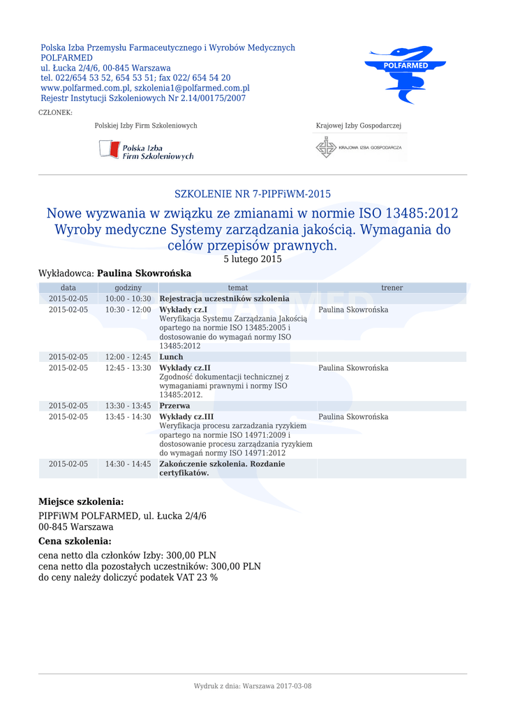 Polska Izba Przemysłu Farmaceutycznego i Wyrobów Medycznych POLFARMED ul. Łucka 2/4/6, 00-845 Warszawa tel. 022/654 53 52, 654 53 51; fax 022/ 654 54 20 www.polfarmed.com.pl, [email protected] Rejestr Instytucji Szkoleniowych Nr 2.14/00175/2007 CZŁONEK: Polskiej Izby Firm Szkoleniowych Krajowej Izby Gospodarczej SZKOLENIE NR 7-PIPFiWM-2015 Nowe wyzwania w związku ze zmianami w normie ISO 13485:2012 Wyroby medyczne Systemy zarządzania jakością. Wymagania do celów przepisów prawnych. 5 lutego 2015 Wykładowca: Paulina Skowrońska data 2015-02-05 2015-02-05 godziny 10:00 - 10:30 10:30 - 12:00 2015-02-05 2015-02-05 12:00 - 12:45 12:45 - 13:30 2015-02-05 2015-02-05 13:30 - 13:45 13:45 - 14:30 2015-02-05 14:30 - 14:45 temat trener Rejestracja uczestników szkolenia Wykłady cz.I Paulina Skowrońska Weryfikacja Systemu Zarządzania Jakością opartego na normie ISO 13485:2005 i dostosowanie do wymagań normy ISO 13485:2012 Lunch Wykłady cz.II Paulina Skowrońska Zgodność dokumentacji technicznej z wymaganiami prawnymi i normy ISO 13485:2012. Przerwa Wykłady cz.III Paulina Skowrońska Weryfikacja procesu zarzadzania ryzykiem opartego na normie ISO 14971:2009 i dostosowanie procesu zarządzania ryzykiem do wymagań normy ISO 14971:2012 Zakończenie szkolenia. Rozdanie certyfikatów. Miejsce szkolenia: PIPFiWM POLFARMED, ul. Łucka 2/4/6 00-845 Warszawa Cena szkolenia: cena netto dla członków Izby: 300,00 PLN cena netto dla pozostałych uczestników: 300,00 PLN do ceny należy doliczyć podatek VAT 23 % Wydruk z dnia: Warszawa 2017-03-08