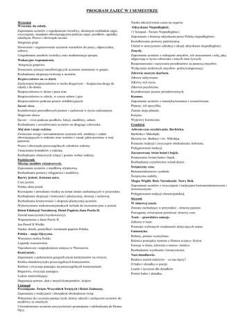 PROGRAM ZAJĘĆ W I SEMESTRZE Wrzesień Wracamy do szkoły. Nauka odczytywania czasu na zegarze. Zapoznanie uczniów z regulaminem świetlicy, dziennym rozkładem zajęć, zwyczajami, zasadami obowiązującymi podczas zajęć, posiłków, ogródku szkolnym. Prawa i obowiązki ucznia. 11 listopad - Święto Niepodległości. Integracja grup. Kształtowanie postawy patriotyzmu. Stworzenie i organizowanie uczniom warunków do pracy, odpoczynku, zabawy. Uzupełnianie zasobów świetlicy oraz modernizacja sprzętu. Wakacyjne wspomnienia. Integracja grupowa. Odzyskana Niepodległość. Zapoznanie z historią odzyskania przez Polskę niepodległości. Udział w uroczystości szkolnej z okazji odzyskania niepodległości. Zmysły. Zapoznanie uczniów z rodzajami zmysłów, ich znaczeniem i rolą, jaką odgrywają w życiu człowieka i innych istot żywych; Rozpoznawanie i nazywanie przedmiotów za pomocą zmysłów; Stwarzanie sytuacji umożliwiających uczniom zaistnienie w grupie. Wyłączanie niektórych zmysłów- próba kompensacji; Rozbudzanie ekspresja twórczej u uczniów. Zdrowie naszym skarbem. Bezpieczeństwo na co dzień. Zachowanie bezpieczeństwa w ruchu drogowym – bezpieczna droga do szkoły i do domu. Zdrowe odżywianie. Bezpieczeństwo w domu i poza nim. Kształtowanie postaw prozdrowotnych. Bezpieczeństwo w szkole, w czasie zabaw i gier. Kosmos. Bezpieczeństwo podczas przerw śródlekcyjnych. Zapoznanie uczniów z tematyką kosmosu i wszechświata. Savoir vivre. Kształtowanie prawidłowych postaw i zachowań w życiu codziennym. Planety, ich specyfika. Zdrowy styl życia. Zdrowie psychiczne. Ziemia moja planeta. Magiczne słowa. Księżyc. Savoir – vivre podczas posiłków, lekcji, modlitwy, zabaw. Wyprawy kosmiczne. Rozbudzanie i uwrażliwianie uczniów na drugiego człowieka. Grudzień Mój dom i moja rodzina. Zwrócenie uwagi i uświadomienie uczniom roli, struktury i zadań obowiązujących w rodzinie oraz wartości i zasad, jakie powinny w niej panować. Adwent-czas oczekiwania. Barbórka. Barbórka i Mikołajki. Prawa i obowiązki poszczególnych członków rodziny. Umacnianie kontaktów z rodziną. Rozbudzanie właściwych relacji i postaw wobec rodziny. Październik Miesiąc modlitw różańcowych. Zapoznanie uczniów z modlitwą różańcową. Historia św. Barbary i św. Mikołaja. Poznanie tradycji i zwyczajów obchodzenia Adwentu. Pielęgnowanie tradycji. Zaczarowany świat baśni i bajek. Poznawanie świata baśni i bajek. Rozbudzanie czytelnictwa wśród dzieci. Świąteczny czas. Rozbudzanie postawy religijności i modlitwy. Bożonarodzeniowe symbole. Barwy jesieni. Jesienna aura. Czas jesieni. Świąteczne ozdoby. Polska złota jesień. Zapoznanie uczniów z zwyczajami i tradycjami bożonarodzeniowymi i noworocznymi. Rozwijanie i utrwalanie wiedzy na temat zmian zachodzących w przyrodzie. Rozbudzanie ekspresji i twórczości: plastycznej, słownej i ruchowej. Rozbudzanie kreatywności i ekspresji plastycznej uczniów. Wykorzystanie niekonwencjonalnych technik do tworzenia prac o jesieni. Dzień Edukacji Narodowej. Dzień Papieża Jana Pawła II. Zawód nauczyciela (wychowawcy). Wspomnienia o Janie Pawle II. Jan Paweł II Wielki. Nauka, dzieła, pontyfikat i testament papieża Polaka. Polska – moja Ojczyzna. Warszawa stolicą Polski. Legendy warszawskie. Najciekawsze i najpiękniejsze miejsca w Warszawie. Kontynenty. Zapoznanie z położeniem geograficznym kontynentów na świecie. Krótka charakterystyka poszczególnych kontynentów. Kultura i zwyczaje panujące na poszczególnych kontynentach. Bogactwa, zwyczaje panujące. Ludzie zamieszkujący. Degustacje potraw, dań z innych kontynentów, krajów. Listopad Przemijanie. Święto Wszystkich Świętych i Dzień Zaduszny. Zapoznanie z tradycjami i obrzędami obchodzenia świąt. Wdrażanie do czczenia pamięci tych, którzy odeszli i zachęcenie uczniów do modlitwy za zmarłych. Uświadomienie uczniom rzeczywistości przemijania i odchodzenia do Domu Ojca. Magia Wigilii. Boże Narodzenie. Nowy Rok. Pielęgnowanie tradycji chrześcijańskiej. Styczeń W zimowej szacie. Zmiany zachodzące w przyrodzie - zimowe pejzaże. Pomagamy zwierzętom przetrwać zimowy czas. Teatr – prawdziwe emocje. Zabawa w teatr. Poznanie wybranych wiadomości dotyczących teatru. Fantastyka. Roboty, postaci wymyślone. Różnice pomiędzy teatrem a filmem science- fiction. Emocje w kinie, telewizji a teatrze- różnice. Rozbudzanie wyobraźni i kreatywności. Nasi dziadkowie. Rodzice moich rodziców – co nas łączy? O babci i dziadku w poezji. Laurki i życzenia dla dziadków. Portret babci i dziadka.