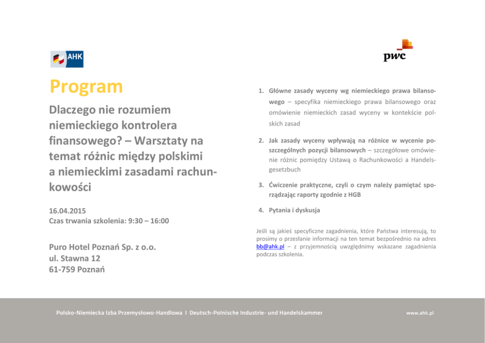 Program Dlaczego nie rozumiem niemieckiego kontrolera finansowego? – Warsztaty na temat różnic między polskimi a niemieckimi zasadami rachunkowości 16.04.2015 Czas trwania szkolenia: 9:30 – 16:00 Puro Hotel Poznań Sp. z o.o. ul. Stawna 12 61-759 Poznań 1. Główne zasady wyceny wg niemieckiego prawa bilansowego – specyfika niemieckiego prawa bilansowego oraz omówienie niemieckich zasad wyceny w kontekście polskich zasad 2. Jak zasady wyceny wpływają na różnice w wycenie poszczególnych pozycji bilansowych – szczegółowe omówienie różnic pomiędzy Ustawą o Rachunkowości a Handelsgesetzbuch 3. Ćwiczenie praktyczne, czyli o czym należy pamiętać sporządzając raporty zgodnie z HGB 4. Pytania i dyskusja Jeśli są jakieś specyficzne zagadnienia, które Państwa interesują, to prosimy o przesłanie informacji na ten temat bezpośrednio na adres [email protected] – z przyjemnością uwzględnimy wskazane zagadnienia podczas szkolenia. Trenerzy Witold Rogacki Julita Włoszczyna Witold Rogacki jest Dyrektorem w dziale audytu i usług doradczych w PwC w Warszawie, odpowiedzialnym za zespół ekspertów German Business Group. Witold jest polskim biegłym rewidentem, a także członkiem Association of Chartered Certified Accountants (FCCA). Brał udział w wielu projektach związanych z badaniem i przeglądem sprawozdań finansowych sporządzonych według polskich zasad rachunkowości, niemieckich zasad rachunkowości (HGB/BilMoG) oraz Międzynarodowych Standardów Sprawozdawczości Finansowej (MSSF). Jest również trenerem prowadzącym szkolenia i warsztaty z zakresu rachunkowości i sprawozdawczości finansowej. Julita Włoszczyna jest Konsultantem w dziale audytu i usług doradczych w PwC w Poznaniu. Julita jest absolwentką Uniwersytetu Humboldta w Berlinie. Swoją ścieżkę zawodową rozpoczynała w PwC w Berlinie w dziale audytu. W Poznaniu Julita zajmuje się badaniem sprawozdań finansowych głownie spółek córek niemieckich koncernów i niemieckich firm rodzinnych. Jest członkiem zespołu German Business Group.