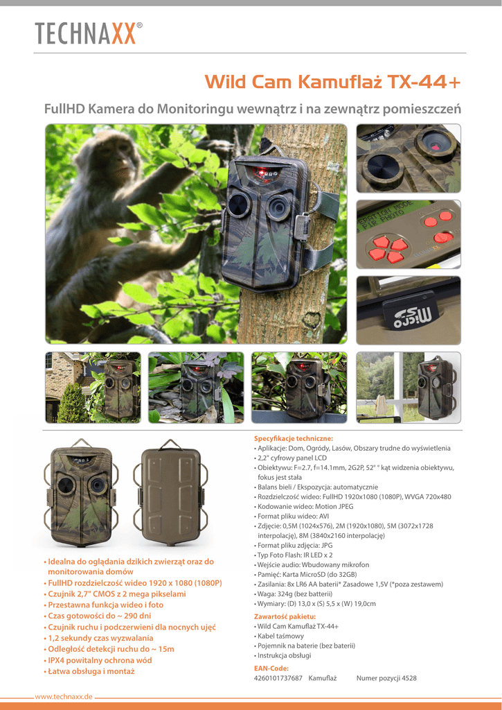 Wild Cam Kamuflaż TX-44+ FullHD Kamera do Monitoringu wewnątrz i na zewnątrz pomieszczeń • Idealna do oglądania dzikich zwierząt oraz do monitorowania domów • FullHD rozdzielczość wideo 1920 x 1080 (1080P) • Czujnik 2,7" CMOS z 2 mega pikselami • Przestawna funkcja wideo i foto • Czas gotowości do ~ 290 dni • Czujnik ruchu i podczerwieni dla nocnych ujęć • 1,2 sekundy czas wyzwalania • Odległość detekcji ruchu do ~ 15m • IPX4 powitalny ochrona wód • Łatwa obsługa i montaż www.technaxx.de Specyfikacje techniczne: • Aplikacje: Dom, Ogródy, Lasów, Obszary trudne do wyświetlenia • 2,2" cyfrowy panel LCD • Obiektywu: F=2.7, f=14.1mm, 2G2P, 52° ° kąt widzenia obiektywu, fokus jest stała • Balans bieli / Ekspozycja: automatycznie • Rozdzielczość wideo: FullHD 1920x1080 (1080P), WVGA 720x480 • Kodowanie wideo: Motion JPEG • Format pliku wideo: AVI • Zdjęcie: 0,5M (1024x576), 2M (1920x1080), 5M (3072x1728 interpolację), 8M (3840x2160 interpolację) • Format pliku zdjęcia: JPG • Typ Foto Flash: IR LED x 2 • Wejście audio: Wbudowany mikrofon • Pamięć: Karta MicroSD (do 32GB) • Zasilania: 8x LR6 AA baterii* Zasadowe 1,5V (*poza zestawem) • Waga: 324g (bez batterii) • Wymiary: (D) 13,0 x (S) 5,5 x (W) 19,0cm Zawartość pakietu: • Wild Cam Kamuflaż TX-44+ • Kabel taśmowy • Pojemnik na baterie (bez baterii) • Instrukcja obsługi EAN-Code: 4260101737687 Kamuflaż Numer pozycji 4528