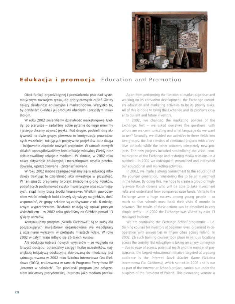 Edukacja i promocja Education and Promotion Obok funkcji organizacyjnej i prowadzenia prac nad systematycznym rozwojem rynku, do priorytetowych zadaƒ Gie∏dy nale˝y dzia∏alnoÊç edukacyjna i marketingowa. Wszystko to, by przybli˝yç Gie∏d´ i jej produkty obecnym i przysz∏ym inwestorom. W roku 2002 zmieniliÊmy dzia∏alnoÊç marketingowà Gie∏dy: po pierwsze – zadaliÊmy sobie pytanie do kogo mówimy i jakiego chcemy u˝ywaç j´zyka. Pod drugie, podzieliliÊmy aktywnoÊç na dwie grupy: pierwsza to kontynuacja prowadzonych wczeÊniej, rokujàcych pozytywnie projektów oraz druga – inicjowanie zupe∏nie nowych projektów. W ramach nowych dzia∏aƒ uporzàdkowaliÊmy komunikacj´ wizualnà Gie∏dy oraz odbudowaliÊmy relacje z mediami. W skrócie, w 2002 roku nasza aktywnoÊç edukacyjna i marketingowa zosta∏a przebudowana, uporzàdkowana i zintensyfikowana. W roku 2002 mocno zaanga˝owaliÊmy si´ w edukacj´ m∏odzie˝y traktujàc t´ dzia∏alnoÊç jako inwestycj´ w przysz∏oÊç. W ten sposób pragniemy tworzyç Êwiadome grono Polaków, potrafiàcych podejmowaç ryzyko inwestycyjne oraz rozumiejàcych, skàd firmy biorà Êrodki finansowe. Wielkim powodzeniem wÊród m∏odych ludzi cieszy∏y si´ wizyty na gie∏dzie, doÊç wspomnieç, ˝e grupy szkolne sà zapisywane z ok. 6-miesi´cznym wyprzedzeniem. Dzia∏ania te dajà si´ opisaç prostym wskaênikiem – w 2002 roku goÊciliÊmy na Gie∏dzie ponad 13 tysi´cy uczniów. Kontynuujemy program „Szko∏a Gie∏dowa”; sà to kursy dla poczàtkujàcych inwestorów organizowane we wspó∏pracy z uczelniami wy˝szymi w pi´tnastu miastach Polski. W roku 2002 w ca∏ym kraju odby∏o si´ 26 takich kursów. Ale edukacja nabiera nowych wymiarów – ze wzgl´du na ∏atwoÊç dost´pu, potencjalny zasi´g i liczb´ uczestników, najwi´kszà inicjatywà edukacyjnà skierowanà do m∏odzie˝y jest zainaugurowana w 2002 roku Szkolna Internetowa Gra Gie∏dowa (SIGG), realizowana w ramach Programu Prezydenta RP „Internet w szko∏ach”. Ten pionierski program jest po∏àczeniem inicjatywy prezydenckiej, internetu jako medium przeka- 28 Apart from performing the function of market organiser and working on its consistent development, the Exchange considers education and marketing activities to be its priority tasks. All of this is done to bring the Exchange and its products closer to current and future investors. In 2002, we changed the marketing policies of the Exchange: first – we asked ourselves the questions: with whom are we communicating and what language do we want to use? Secondly, we divided our activities in these fields into two groups: the first consists of continued projects with a positive outlook, while the other concerns completely new projects. The new projects included streamlining the visual communication of the Exchange and restoring media relations. In a nutshell – in 2002 we redesigned, streamlined and intensified our educational and marketing activities. In 2002, we made a strong commitment to the education of the younger generation, considering this to be an investment in the future. By doing this, we hope to create a group of highly-aware Polish citizens who will be able to take investment risks and understand how companies raise funds. Visits to the Exchange were a huge success among young people – so much so that schools must book their visits 6 months in advance. The results of these actions can be described in very simple terms – in 2002 the Exchange was visited by over 13 thousand students. We are continuing the Exchange School programme – i.e. training courses for investors at beginner level, organised in cooperation with universities in fifteen cities across Poland. In 2002, 26 such training courses took place in various locations across the country. But education is taking on a new dimension – due to ease of access, potential reach and the number of participants, the largest educational initiative targeted at a young audience is the Internet Stock Market Game (Szkolna Internetowa Gra Gie∏dowa), which started in 2002 and is run as part of the Internet at Schools project, carried out under the auspices of the President of Poland. This pioneering venture is zu oraz technologii e-learning, która powoduje, ˝e wiedza mo˝e byç dost´pna wsz´dzie tam, gdzie mo˝na si´ pod∏àczyç do telefonu. Uczestnicy Gry uczà si´ o tym, jak dzia∏ajà firmy i sama gie∏da, a nast´pnie inwestujà wirtualne 100.000 z∏. Gra cieszy∏a si´ du˝ym zainteresowaniem m∏odzie˝y i nauczycieli z prostego powodu – w interaktywny i atrakcyjny dla m∏odzie˝y sposób opowiadamy o z∏o˝onej materii rynku kapita∏owego. Sukces SIGG przerós∏ nasze wyobra˝enia, ju˝ w pierwszej, pilota˝owej edycji gry wzi´∏y udzia∏ 122 zespo∏y z 77 szkó∏ ponadgimnazjalnych z ca∏ej Polski. Wzbudzeniu zainteresowania rynkiem gie∏dowym s∏u˝y∏y og∏oszone przez Gie∏d´ konkursy. WÊród nich by∏ konkurs na najlepszà prac´ magisterskà nt. instrumentów pochodnych, konkurs dla dziennikarzy regionalnych, konkurs dla nauczycieli na scenariusz lekcji o gie∏dzie oraz konkurs dla m∏odzie˝y na scenariusz filmu o gie∏dzie. Zwyci´ska grupa licealistów ze Szczecina dosta∏a od nas pieniàdze na realizacj´ prawdziwego, profesjonalnego filmu. W ten sposób zrealizowaliÊmy materia∏ prezentowany obecnie m∏odzie˝y odwiedzajàcej gie∏d´. Upowszechnianiu wiedzy o kapitale i gie∏dzie s∏u˝y∏y zorganizowane ju˝ po raz ósmy targi „Twoje pieniàdze”. Wystawy, prezentacje, debaty publiczne oraz oferty wystawców przyciàgn´∏y du˝à liczb´ zainteresowanych. a combination of the President’s initiative, the Internet as a medium, and e-learning technology, which make access to knowledge possible from any place where there is a telephone connection. Game participants learn about companies’ operations and the stock market itself and then invest a 