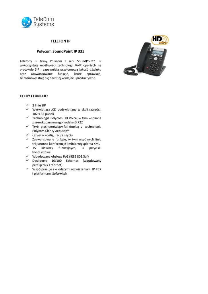 TELEFON IP Polycom SoundPoint IP 335 Telefony IP firmy Polycom z serii SoundPoint® IP wykorzystują możliwości technologii VoIP opartych na protokole SIP i zapewniają przełomową jakość dźwięku oraz zaawansowane funkcje, które sprawiają, że rozmowy stają się bardziej wydajne i produktywne. CECHY I FUNKCJE: 2 linie SIP Wyświetlacz LCD podświetlany w skali szarości, 102 x 33 pikseli Technologia Polycom HD Voice, w tym wsparcie z szerokopasmowego kodeka G.722 Tryb głośnomówiący full-duplex z technologią Polycom Clarity Acoustic™ Łatwy w konfiguracji i użyciu Zaawansowane funkcje, w tym wspólnych linii, trójstronne konferencje i miniprzeglądarka XML 15 klawiszy funkcyjnych, 3 przyciski kontekstowe Wbudowana obsługa PoE (IEEE 802.3af) Dwa porty 10/100 Ethernet (wbudowany przełącznik Ethernet) Współpracuje z wiodącymi rozwiązaniami IP PBX i platformami Softswitch