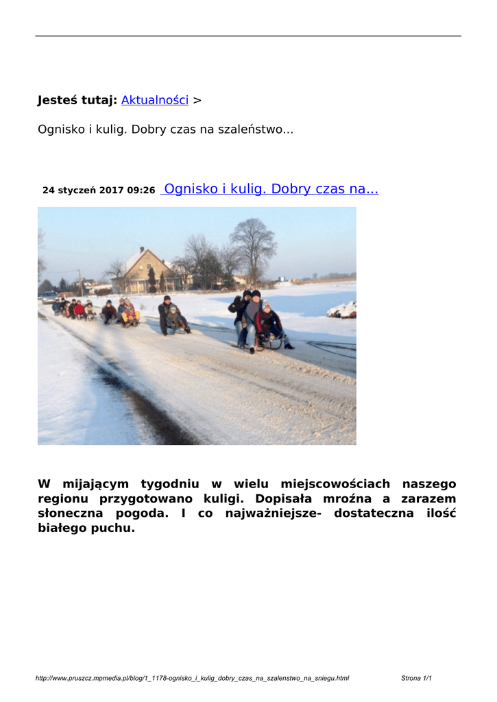 Jesteś tutaj: Aktualności > Ognisko i kulig. Dobry czas na szaleństwo... 24 styczeń 2017 09:26 Ognisko i kulig. Dobry czas na... W mijającym tygodniu w wielu miejscowościach naszego regionu przygotowano kuligi. Dopisała mroźna a zarazem słoneczna pogoda. I co najważniejsze- dostateczna ilość białego puchu. http://www.pruszcz.mpmedia.pl/blog/1_1178-ognisko_i_kulig_dobry_czas_na_szalenstwo_na_sniegu.html Powered by TCPDF (www.tcpdf.org) Strona 1/1