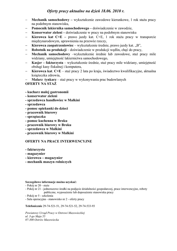 Oferty pracy aktualne na dzień 18.06. 2010 r. − Mechanik samochodowy – wykształcenie zawodowe kierunkowe, 1 rok stażu pracy na podobnym stanowisku, − Pomocnik lakiernika samochodowego – doświadczenie w zawodzie, − Konserwator zieleni – doświadczenie w pracy na podobnym stanowisku − Kierowca kat C+E – prawo jazdy kat. C+E, 1 rok stażu pracy w transporcie międzynarodowym, uprawnienia na przewóz rzeczy, − Kierowca zaopatrzeniowiec – wykształcenie średnie, prawo jazdy kat. „B”, − Robotnik na produkcji – doświadczenie w produkcji wędlin, chęć do pracy, − Mechanik samochodowy –wykształcenie średnie lub zawodowe, staż pracy mile widziany, umiejętność lakiernictwa samochodowego, − Kasjer – fakturzysta – wykształcenie średnie, staż pracy mile widziany, umiejętność obsługi kasy fiskalnej i komputera, − Kierowca kat. C+E – staż pracy 2 lata po kraju, świadectwo kwalifikacyjne, aktualna książeczka zdrowia, − Malarz tynkarz – staż pracy w wykonywaniu prac budowlanych OFERTY NA STAŻ - kucharz małej gastronomii - konserwator zieleni - sprzedawca handlowiec w Małkini - sprzedawca - pomoc opiekunki do dzieci - pracownik biurowy - sprzątaczka - pomoc kuchenna w Broku - pracownik biurowy w Broku - sprzedawca w Małkini - pracownik biurowy w Małkini OFERTY NA PRACE INTERWENCYJNE - fakturzysta - magazynier - kierowca – magazynier - mechanik maszyn rolniczych Szczegółowe informacje można uzyskać: - Pokój nr 20 - staże - Pokój nr 21 - jednorazowe środki na podjęcie działalności gospodarczej, prace interwencyjne, roboty publiczne, wyposażenie lub doposażenie stanowiska pracy - Pokój nr 5 - szkolenia - Sala operacyjna - stanowisko nr 2 - oferty pracy Telefonicznie 29-74-521-51, 29-74-521-52, 29-74-533-93 Powiatowy Urząd Pracy w Ostrowi Mazowieckiej ul. 3-go Maja 55 07-300 Ostrów Mazowiecka