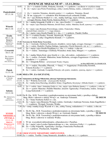 INTENCJE MSZALNE 07 – 13.11.2016r. 6.45 I. Za ++ z rodzin Cieślik, Podyma, Szostok, ++ z pokrew. i za dusze w czyśćcu cierp. II. Za + męża i ojca Piotra Pożarskiego, córkę i siostrę Helenę, rodzic., rodzeństwo i ++ z pokrew. Poniedziałek 17.15 07.11.16 Różaniec I. Za ++ teściów Niemiec, dwóch synów i ++ z pokrew. Niemiec, Kosel. II. W int. żyjących i ++ członków Róż Różańcowych zelatorki Fiołek. za zmarłych i Msza III. Za + ojca Roberta Henkel w r. śm., matkę Jadwigę, męża Alfreda, siostrę Gizelę, szwagra Horsta, brata Pawła, bratową Różę i ++ z pokrew. 6.45 I. Za + matkę Irmgardę Cieślik w r. śm., ojca Józefa i ++ z pokrew. II. Za + męża i ojca Henryka Matonia, dwóch braci, rodzic. Matonia, Ksoll, synową i ++ z pokrew. Wtorek 08.11.16 Środa 09.11.16 ŚWIĘTO ROCZNICA POŚWIĘCENIA BAZYLIKI LATERAŃSKIEJ Czwartek 10.11.16 ŚW. LEONA WIELKIEGO PAPIEŻA I DRA KOŚCIOŁA 17.15 Różaniec za zmarłych i Msza I. Za + męża i ojca Romana Przowskiego, rodzic. Franciszka i Marię, czterech braci, teściów i ++ z tego miejsca. II. Za + męża i ojca Józefa Pandel w r. śm., i ++ z pokrew. Pandel, Kalka. 6.45 I. Za ++ z rodzin Prusko, Nowak, Strzelczyk, Wyżgoł. II. Za ++ rodzic. Lidię i Engelberta Klonek i ++ z pokrew. 17.30 Nowenna do Matki Bożej Toszeckiej. 18.00 I. II. 6.45 I. II. Za ++ Gertrudę i Herberta Pierończyk, dziadków, teścia Jagła, szwagra Alojzego i ++ z pokrew. Za ++ rodzic. Rudolfa i Paulinę Hatlapa, Agnieszkę i Pawła Hasterok z ok. ur. i ++ z pokrew. Za + męża i ojca Józefa Przeklasę w r. śm. i ++ rodzic. z obu str. Za ++ rodzic. Antoniego i Elżbietę Wienchol, brata Jana, Margot i ++ z pokrew. 17.00 I. Za + matkę Marię Kral, ojca Józefa w r. śm., ich rodzic., rodzeństwo i ++ z pokrew. II. Za ++ rodzic. Zwiorek, Makselon, brata Herberta, szwagra Eugeniusza i Czesława, dziadków i ++ z pokrew. III. Za + Irmgardę Rekus – od koleżanek Wandy i Reginy. po Mszy RÓŻANIEC ZA ZMARŁYCH Piątek 11.11.16 ŚW. MARCINA Z TOURS BISKUPA 6.45 I. Za ++ rodzic. Peczalka, Płaczek, ++ braci, ++ Augustyna i Franciszkę Szostok, Ernesta Kiczka i ++ z pokrew. II. Za ++ rodzic. Gertrudę i Leopolda Polczyk, ich synów, wnuków, synową, zięcia i ++ z pokrew. 11.00 MSZA ŚW. ZA OJCZYZNĘ. 15.00 Nabożeństwo do Bożego Miłosierdzia, adoracja Najświętszego Sakramentu. 17.15 I. Za + Walerię Żywczok – od przyjaciółki Skubała. Różaniec za zmarłych II. Za + matkę Irenę Durszlag, dziadków Klarę i Engelberta, Krystynę i Alfreda Zurek i ++ z pokrew. i Msza Sobota 12.11.16 ŚW. JOZAFATA BISKUPA I MĘCZENNIKA 6.45 I. Za ++ rodzic. Jana i Antoninę Grala w r. śm., męża i ojca Huberta Janotę i ++ z pokrew. z obu str. II. Za ++ synów Marcina i Rafała Maicher, teściów Agnieszkę i Franciszka, rodzic. Jerzego i Łucję Katryniok i ++ z pokrew. 16.00 Do B. Op., M.B. Toszeckiej z podziękowaniem za otrzymane łaski, z prośbą o dalsze błog. Boże i zdrowie z okazji 50-tej r. ur. Andrzeja Tomanek. TE DEUM 17.15 I. Za + brata Norberta Sobel w r. śm. Różaniec za zmarłych II. Za + męża i ojca Brunona Wyżgoł, rodzic. Gertrudę i Andrzeja Nowara, brata Engelberta i i Msza ++ z pokrew. Wyżgoł, Nowara, Wutke. 7.30 Za + żonę i matkę Łucję Wycisk w r. śm., córkę Teresę, rodzeństwo i ++ rodzic. z obu str. 9.00 I. Do B. Op., M.B. Toszeckiej z podziękowaniem za otrzymane łaski, z prośbą o dalsze błog. Boże i zdrowie z okazji 90-tej r. ur. Gertrudy Stanek. TE DEUM XXXIII II. Do B. Op., M.B. Toszeckiej z podziękowaniem za otrzymane łaski, z prośbą o dalsze NIEDZIELA błog. Boże i zdrowie w rodzinie Wutke. ZWYKŁA 13.11.16 11.00 I. W int. wszystkich dobrodziejów, ofiarodawców i Parafian. ODPUST SUMA II. Za + męża i ojca Leszka Ogonowskiego w r. śm., teściową Zofię i ++ z pokrew. PARAFIALNY KU CZCI III. Za + Lidię Noparlik, Agnieszkę i Jerzego, Franciszka Piechaczek ŚW. KATARZYNY ALEKSANDRYJSKIEJ i ++ z pokrew. Piechaczek, Noparlik. 17.30 UROCZYSTE NIESZPORY ODPUSTOWE. 18.00 Za ++ rodzic. Teofila i Annę Strancich, dziadków z obu str. i ++ z pokrew.