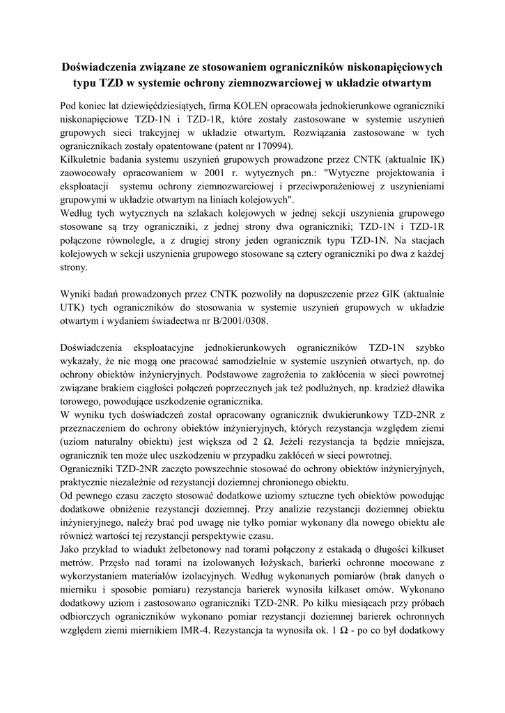 Doświadczenia związane ze stosowaniem ograniczników niskonapięciowych typu TZD w systemie ochrony ziemnozwarciowej w układzie otwartym Pod koniec lat dziewięćdziesiątych, firma KOLEN opracowała jednokierunkowe ograniczniki niskonapięciowe TZD-1N i TZD-1R, które zostały zastosowane w systemie uszynień grupowych sieci trakcyjnej w układzie otwartym. Rozwiązania zastosowane w tych ogranicznikach zostały opatentowane (patent nr 170994). Kilkuletnie badania systemu uszynień grupowych prowadzone przez CNTK (aktualnie IK) zaowocowały opracowaniem w 2001 r. wytycznych pn.: "Wytyczne projektowania i eksploatacji systemu ochrony ziemnozwarciowej i przeciwporażeniowej z uszynieniami grupowymi w układzie otwartym na liniach kolejowych". Według tych wytycznych na szlakach kolejowych w jednej sekcji uszynienia grupowego stosowane są trzy ograniczniki, z jednej strony dwa ograniczniki; TZD-1N i TZD-1R połączone równolegle, a z drugiej strony jeden ogranicznik typu TZD-1N. Na stacjach kolejowych w sekcji uszynienia grupowego stosowane są cztery ograniczniki po dwa z każdej strony. Wyniki badań prowadzonych przez CNTK pozwoliły na dopuszczenie przez GIK (aktualnie UTK) tych ograniczników do stosowania w systemie uszynień grupowych w układzie otwartym i wydaniem świadectwa nr B/2001/0308. Doświadczenia eksploatacyjne jednokierunkowych ograniczników TZD-1N szybko wykazały, że nie mogą one pracować samodzielnie w systemie uszynień otwartych, np. do ochrony obiektów inżynieryjnych. Podstawowe zagrożenia to zakłócenia w sieci powrotnej związane brakiem ciągłości połączeń poprzecznych jak też podłużnych, np. kradzież dławika torowego, powodujące uszkodzenie ogranicznika. W wyniku tych doświadczeń został opracowany ogranicznik dwukierunkowy TZD-2NR z przeznaczeniem do ochrony obiektów inżynieryjnych, których rezystancja względem ziemi (uziom naturalny obiektu) jest większa od 2 Ω. Jeżeli rezystancja ta będzie mniejsza, ogranicznik ten może ulec uszkodzeniu w przypadku zakłóceń w sieci powrotnej. Ograniczniki TZD-2NR zaczęto powszechnie stosować do ochrony obiektów inżynieryjnych, praktycznie niezależnie od rezystancji doziemnej chronionego obiektu. Od pewnego czasu zaczęto stosować dodatkowe uziomy sztuczne tych obiektów powodując dodatkowe obniżenie rezystancji doziemnej. Przy analizie rezystancji doziemnej obiektu inżynieryjnego, należy brać pod uwagę nie tylko pomiar wykonany dla nowego obiektu ale również wartości tej rezystancji perspektywie czasu. Jako przykład to wiadukt żelbetonowy nad torami połączony z estakadą o długości kilkuset metrów. Przęsło nad torami na izolowanych łożyskach, barierki ochronne mocowane z wykorzystaniem materiałów izolacyjnych. Według wykonanych pomiarów (brak danych o mierniku i sposobie pomiaru) rezystancja barierek wynosiła kilkaset omów. Wykonano dodatkowy uziom i zastosowano ograniczniki TZD-2NR. Po kilku miesiącach przy próbach odbiorczych ograniczników wykonano pomiar rezystancji doziemnej barierek ochronnych względem ziemi miernikiem IMR-4. Rezystancja ta wynosiła ok. 1 Ω - po co był dodatkowy uziom szpilkowy (koszty) który miał rezystancję rzędu kilkunastu omów. Pomiar rezystancji doziemnej barierek po kilku miesiącach w warunkach zimowych (śnieg) dał wynik ok. 0,5 Ω. W 2008 roku został opracowany i wykonany ogranicznik dwukierunkowy typu TZD-1NR, który jest równoważny równoległemu połączeniu dwóch ograniczników jednokierunkowych TZD-1N i TZD-1R. Ograniczniki typu TZD-1NR zostały poddane badaniom w Instytucie Elektrotechniki w Warszawie co zostało potwierdzone wydaniem ATESTU Nr 0976/NBR/09. Następnie ograniczniki te zostały zainstalowane do próbnej eksploatacji w tunelu średnicowym w Warszawie. Po pozytywnym okresie próbnej eksploatacji, podczas której były wykonywane badania kontrolne i próby zwarciowe, ograniczniki te zostały dopuszczone do eksploatacji przez PKP PLK SA. Ograniczniki TZD-1NR zostały wprowadzone do katalogu sieci trakcyjnej PLK pod nr 7340 w dodatku pn.: „Ograniczniki niskonapięciowe”, Warszawa 2010. Ograniczniki TZD-1NR mogą być stosowane we wszystkich warunkach czyli do systemu uszynień grupowych w układzie otwartym sieci trakcyjnej oraz do uszynień otwartych obiektów inżynieryjnych niezależnie od wartości rezystancji doziemnej tych obiektów. Zastosowanie w systemie uszynień grupowych ograniczników typu TZD-1NR po jednym z każdej strony sekcji uszynienia grupowego zarówno na szlaku kolejowym jak i stacji jest rozwiązaniem prostszym i bardziej skutecznym. Rozwiązanie to jest całkowicie zgodne z obowiązującymi przepisami PKP PLK SA, pn.: „Wytyczne projektowania i eksploatacji systemu uszynień grupowych w układzie otwartym na liniach kolejowych” (pkt.3.17.). Zastosowanie dwóch ograniczników typu TZD-1NR w sekcji uszynienia grupowego pozwoli na: zwiększenie niezawodności pracy ograniczników, zmniejszenie nakładów inwestycyjnych, uproszczenie montażu. Zwiększenie niezawodności polega na tym, że w przypadku przerwania liny uszynienia grupowego (np. kradzież) na jednym z końców sekcji pozostawał pojedynczy ogranicznik TZD-1N, który mógł ulec uszkodzeniu w przypadku zakłóceń w sieci powrotnej. Zastosowanie ograniczników TZD-1NR eliminuje taki przypadek. Zastosowanie dwóch dwukierunkowych ograniczników typu TZD-1NR w sekcji uszynienia grupowego jest bardziej ekonomiczne niż trzech lub czerech ograniczników jednokierunkowych typu TZD-1N i TZD-1R. Montaż jednego ogranicznika TZD-1NR jest prostszy niż dwóch ograniczników TZD-1N i TZD-1R i wykonanie połączeń między nimi. Występowanie kilku typów ograniczników stwarza szereg możliwości wyboru niewłaściwego rozwiązania na etapie projektowania jak też wykonawstwa, ze względów technicznych jak też ekonomicznych. Oto kilka przykładów niewłaściwego doboru lub montażu ograniczników: uszynianie o