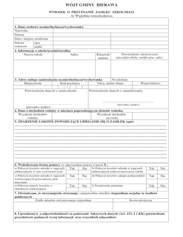 WÓJT GMINY BIERAWA WNIOSEK O PRZYZNANIE ZASIŁKU SZKOLNEGO A/ Wypełnia wnioskodawca 1. Dane osobowe ucznia/słuchacza/wychowanka Nazwisko Imiona Data i miejsce urodzenia Imiona ojca rodziców matki 2. Informacja o szkole/uczelni/o rodku Nazwa szkoły Adres Klasa/rok studiów Potwierdzenie szkoły/uczelni (piecz tka szkoły i podpis prac. adm.) Nr telefonu: 3. Adres stałego zamieszkania ucznia/słuchacza/wychowanka Miejscowo Kod pocztowy Ulica, numer domu Województwo Potwierdzenie danych o zamieszkaniu Potwierdzenie danych o zameldowaniu ............................................................. ……………………………………… (piecz tka i podpis) (piecz tka i podpis) 4. Dane o dochodach rodziny w miesi cu poprzedzaj cym zło enie wniosku Wysoko dochodów Wysoko dochodów rodziny na osob 5. ZDARZENIE LOSOWE POWODUJ CE UBIEGANIE SI O ZASIŁEK (opis) ……………………………………………………………………………………………………………………… ……………………………………………………………………………………………………………………… ……………………………………………………………………………………………………………………… ……………………………………………………………………………………………………………………… ……………………………………………………………………………………………………………………… ……………………………………………………………………………………………………………………… ……………………………………………………………………………………………………………………… ……………………………………………………………………………………………………………………… ……………………………………………………………………………………………………………………… ……………………………………………………………………………………………………………………… 6. Wnioskowana forma pomocy (w odpowiednim miejscu wstawi X ) a) Pokrycie kosztów udziału w zaj ciach Tak Nie b) Pokrycie kosztów udziału w zaj ciach edukacyjnych, w tym wyrównawczych c) Pokrycie kosztów udziału w zaj ciach wykraczaj cych poza ramowy plan nauczania e) Pokrycie innych kosztów o charakterze edukacyjnym Tak Nie edukacyjnych realizowanych poza szkoł d) Pokrycie kosztów zakupu podr czników Tak Nie f) wiadczenie pieni ne Tak Nie Tak Nie Tak Nie 7. O wiadczam, e otrzymuj /nie otrzymuj ( niepotrzebne skre li ) stypendium socjalne ze rodków publicznych ródło aktualnie otrzymywanego stypendium Kwota miesi czna 8. Uprzedzony/a o odpowiedzialno ci za podawanie fałszywych danych (Art. 233, § 1 KK) potwierdzam prawdziwo podanych wy ej informacji oraz wszystkich zał czników 9. Wyra am zgod na przetwarzanie podanych wy ej danych osobowych wył cznie dla potrzeb realizacji pomocy materialnej ........................................................ ........................................................................................ (miejscowo , data) (czytelny podpis wnioskodawcy – pełnoletniego ucznia, ew. rodzica lub opiekuna prawnego ucznia niepełnoletniego) 10. Zał czniki (w odpowiednim miejscu wstawi X ) a) za wiadczenie o dochodach ojca Tak Nie b) za wiadczenie o dochodach matki Tak Nie c) za wiadczenie o bezrobociu z Powiatowego Urz du Pracy e) za wiadczenie o dochodach rolniczych Tak Nie Tak Nie d) za wiadczenie o korzystaniu ze wiadcze Tak Nie z OPS f) za wiadczenia o spełnianiu kryteriów wymienionych w Tak Nie pkt 6, lit. c – h (wymieni je poni ej) Za wiadczenie o ......................................................................................................................................................... Za wiadczenie o ......................................................................................................................................................... Za wiadczenie o ......................................................................................................................................................... Opinia dyrektora szkoły/o rodka/kolegium ............................................................................................................. ..................................................................................................................................................................................... B/ Wypełnia organ podejmuj cy decyzj (w odpowiednim miejscu wstawi X ) Stwierdza si poprawno wypełnienia wniosku Stwierdza si prawdziwo danych Przyznaje si pomoc materialn w postaci zasiłku szkolnego Ustalona wysoko Tak Nie zasiłku szkolnego (w zł) Formy realizacji przyznanego zasiłku szkolnego (w odpowiednim miejscu wstawi X ) a) Pokrycie kosztów udziału w zaj ciach edukacyjnych, w tym wyrównawczych c) Pokrycie kosztów udziału w zaj ciach wykraczaj cych poza ramowy plan nauczania e) Pokrycie innych kosztów o charakterze edukacyjnym b) Pokrycie kosztów udziału w zaj ciach edukacyjnych realizowanych poza szkoł d) Pokrycie kosztów zakupu podr czników f) wiadczenie pieni ne ......... ............................................................................ (podpis osoby odpowiedzialnej za weryfikacj danych) Wydano decyzj administracyjn nr : ....................................................................................... Bierawa, .............................................. (data) ...................................................................... (podpis Wójta Gminy Bierawa lub osoby upowa nionej)