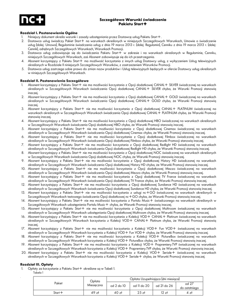 Szczegółowe Warunki świadczenia Pakietu Start+ Rozdział I. Postanowienia Ogólne 1. Niniejszy dokument określa warunki i zasady udostępniania przez Dostawcę usług Pakietu Start+. 2. Dostawca usług świadczy Pakiet Start+ na warunkach określonych w niniejszych Szczegółowych Warunkach, Umowie o świadczenie usług (dalej: Umowa), Regulaminie świadczenia usług z dnia 19 marca 2013 r. (dalej: Regulamin), Cenniku z dnia 19 marca 2013 r. (dalej: Cennik), odrębnych Szczegółowych Warunkach, Warunkach Promocji. 3. Dostawca usług zobowiązuje się do świadczenia Pakietu Start+ w zakresie i na warunkach określonych w Regulaminie, Cenniku, niniejszych Szczegółowych Warunkach, zaś Abonent zobowiązuje się do ich przestrzegania. 4. Abonent korzystający z Pakietu Start+ ma możliwość korzystania z innych usług Dostawcy usług, z wyłączeniem Usług telewizyjnych określonych w Rozdziale II niniejszych Szczegółowych Warunków, z zastrzeżeniem Warunków Promocji. 5. Dostawca usług zastrzega sobie prawo do zmian nazw produktów i Usług telewizyjnych będących w ofercie Dostawcy usług określonych w niniejszych Szczegółowych Warunkach. Rozdział II. Postanowienia Szczegółowe 1. Abonent korzystający z Pakietu Start+ nie ma możliwości korzystania z Opcji dodatkowej CANAL+ SILVER świadczonej na warunkach określonych w Szczegółowych Warunkach świadczenia Opcji dodatkowej CANAL+ SILVER chyba, że Warunki Promocji stanowią inaczej. 2. Abonent korzystający z Pakietu Start+ nie ma możliwości korzystania z Opcji dodatkowej CANAL+ GOLD świadczonej na warunkach określonych w Szczegółowych Warunkach świadczenia Opcji dodatkowej CANAL+ GOLD chyba, że Warunki Promocji stanowią inaczej. 3. Abonent korzystający z Pakietu Start+ nie ma możliwości korzystania z Opcji dodatkowej CANAL+ PLATINUM świadczonej na warunkach określonych w Szczegółowych Warunkach świadczenia Opcji dodatkowej CANAL+ PLATINUM chyba, że Warunki Promocji stanowią inaczej. 4. Abonent korzystający z Pakietu Start+ nie ma możliwości korzystania z Opcji dodatkowej HBO świadczonej na warunkach określonych w Szczegółowych Warunkach świadczenia Opcji dodatkowej HBO chyba, że Warunki Promocji stanowią inaczej. 5. Abonent korzystający z Pakietu Start+ nie ma możliwości korzystania z Opcji dodatkowej Cinemax świadczonej na warunkach określonych w Szczegółowych Warunkach świadczenia Opcji dodatkowej Cinemax chyba, że Warunki Promocji stanowią inaczej. 6. Abonent korzystający z Pakietu Start+ nie ma możliwości korzystania z Opcji dodatkowej Filmbox świadczonej na warunkach określonych w Szczegółowych Warunkach świadczenia Opcji dodatkowej Filmbox chyba, że Warunki Promocji stanowią inaczej. 7. Abonent korzystający z Pakietu Start+ nie ma możliwości korzystania z Opcji dodatkowej Redlight HD świadczonej na warunkach określonych w Szczegółowych Warunkach świadczenia Opcji dodatkowej Redlight HD chyba, że Warunki Promocji stanowią inaczej. 8. Abonent korzystający z Pakietu Start+ nie ma możliwości korzystania z Opcji dodatkowej NOC świadczonej na warunkach określonych w Szczegółowych Warunkach świadczenia Opcji dodatkowej NOC chyba, że Warunki Promocji stanowią inaczej. 9. Abonent korzystający z Pakietu Start+ nie ma możliwości korzystania z Opcji dodatkowej History HD świadczonej na warunkach określonych w Szczegółowych Warunkach świadczenia Opcji dodatkowej History HD chyba, że Warunki Promocji stanowią inaczej. 10. Abonent korzystający z Pakietu Start+ nie ma możliwości korzystania z Opcji dodatkowej Mezzo świadczonej na warunkach określonych w Szczegółowych Warunkach świadczenia Opcji dodatkowej Mezzo chyba, że Warunki Promocji stanowią inaczej. 11. Abonent korzystający z Pakietu Start+ nie ma możliwości korzystania z Opcji dodatkowej TV France świadczonej na warunkach określonych w Szczegółowych Warunkach świadczenia Opcji dodatkowej TV France chyba, że Warunki Promocji stanowią inaczej. 12. Abonent korzystający z Pakietu Start+ nie ma możliwości korzystania z Opcji dodatkowej Sundance HD świadczonej na warunkach określonych w Szczegółowych Warunkach świadczenia Opcji dodatkowej Sundance HD chyba, że Warunki Promocji stanowią inaczej. 13. Abonent korzystający z Pakietu Start+ nie ma możliwości korzystania z usługi nc+GO świadczonej na warunkach określonych w Szczegółowych Warunkach testowego świadczenia Opcji dodatkowej nc+GO chyba, że Warunki Promocji stanowią inaczej. 14. Abonent korzystający z Pakietu Start+ nie ma możliwości korzystania z Portalu Music+ świadczonego na warunkach określonych w Szczegółowych Warunkach udostępnienia Portalu Music+ chyba, że Warunki Promocji stanowią inaczej. 15. Abonent korzystający z Pakietu Start+ nie ma możliwości korzystania z Opcji dodatkowej Multiroom świadczonej na warunkach określonych w Szczegółowych Warunkach udostępniania Opcji dodatkowej Multiroom chyba, że Warunki Promocji stanowią inaczej. 16. Abonent korzystający z Pakietu Start+ nie ma możliwości korzystania z Kolekcji VOD+ CANAL+ Platinum świadczonej na warunkach określonych w Szczegółowych Warunkach korzystania z Kolekcji VOD+ CANAL+ Platinum chyba, że Warunki Promocji stanowią inaczej. 17. Abonent korzystający z Pakietu Start+ nie ma możliwości korzystania z Kolekcji VOD+ Fun VOD+ świadczonej na warunkach określonych w Szczegółowych Warunkach korzystania z Kolekcji VOD+ Fun VOD+ chyba, że Warunki Promocji stanowią inaczej. 18. Abonent korzystający z Pakietu Start+ nie ma możliwości korzystania z Kolekcji VOD+ PictureBox świadczonej na warunkach określonych w Szczegółowych Warunkach korzystania z Kolekcji VOD+ PictureBox chyba, że Warunki Promocji stanowią inaczej. 19. Abonent korzystający z Pakietu Start+ nie ma możliwości korzystania z Kolekcji VOD+ Prapremiery.TVP świadczonej na warunkach określonych w Szczegółowych Warunkach korzystania