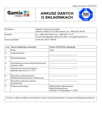 Data utworzenia: 28.04.2012 ARKUSZ DANYCH O SKŁADNIKACH Producent Zakłady Chemiczne GAMIX Jankowo Dolne 64, 62-200 Gniezno, tel. +48(61)425-98-89 Kontakt tel. +48(61)425-98-89, fax +48(61)427-11-63 e-mail: [email protected], http: www.gamix.gniezno.pl Nazwa produktu CAR OK ANTY OWAD L.p. Nazwa chemiczna, zawartość Nazwa INCI/Wzór chemiczny 1. Woda Aqua 2. 2-Butoksyetanol 3. Monoetanolamina 4. Sól trójsodowa kwasu nitrylotrójoctowego roztwór wodny ----------------------------------------- 5. Etoksylowane pierwszorzędowe alkohole tłuszczowe C11-C13 ----------------------------------------- 6. Mieszanina etoksylowanych alkilopochodnych kwasów fosforowych ----------------------------------------- 7. Sól sodowa siarczanu mono(2etyloheksylu) ----------------------------------------- 8. Środek konserwujący Methylchloroisothiazolinone Methylisothiazolinone 2-Bromo-2-Nitropropane-1,3 Diol --------------------------------------------------------------------------------- Zawarte w płynie środki powierzchniowo-czynne wykazują podatność na ostateczną biodegradację tlenową.