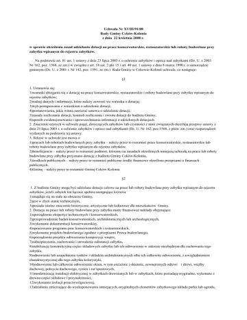 Uchwała Nr XVIII/91/08 Rady Gminy Ceków-Kolonia z dnia 22 kwietnia 2008 r. w sprawie określenia zasad udzielania dotacji na prace konserwatorskie, restauratorskie lub roboty budowlane przy zabytku wpisanym do rejestru zabytków. Na podstawie art. 81 ust. 1 ustawy z dnia 23 lipca 2003 r. o ochronie zabytków i opiece nad zabytkami (Dz. U. z 2003 Nr 162, poz. 1568, ze zm.) w związku z art. 18 ust. 2 pkt 15 i art. 40 ust. 1 ustawy z dnia 8 marca 1990 r. o samorządzie gminnym (Dz. U. z 2001 r. Nr 142, poz. 1591, ze zm.) Rada Gminy w Cekowie-Kolonii uchwala, co następuje: §1 1. Ustanawia się: 1)warunki ubiegania się o dotację na prace konserwatorskie, restauratorskie i roboty budowlane przy zabytku wpisanym do rejestru zabytków; 2)rodzaj danych i informacji, które należy zawrzeć we wniosku o dotację; 3)tryb postępowania z wnioskiem o udzielenie dotacji; 4)postanowienia, jakie winna zawierać umowa o udzielenie dotacji; 5)zasady rozliczania dotacji, kontroli rozliczenia i zwrotu dotacji do budżetu Gminy; 6)sposób ewidencjonowania i upowszechniania informacji o udzielonych dotacjach. 2. Znaczenie użytych w uchwale pojęć, dotyczących zabytków lub czynności z nimi związanych określają przepisy ustawy z dnia 23 lipca 2003 r. o ochronie zabytków i opiece nad zabytkami (Dz. U. Nr 162, poz.1568, z późn. zm.) oraz rozporządzeń wydanych na podstawie tej ustawy. 3. Ilekroć w uchwale jest mowa o: 1)pracach lub robotach budowlanych przy zabytku – należy przez to rozumieć prace konserwatorskie, restauratorskie lub roboty budowlane przy zabytku wpisanym do rejestru zabytków, 2)beneficjencie – należy przez to rozumieć podmiot, któremu na zasadach określonych niniejszą uchwałą na prace lub roboty budowlane przy zabytku przyznano dotację z budżetu Gminy Ceków-Kolonia, 3)środkach publicznych – należy przez to rozumieć publiczne środki finansowe określone przepisami o finansach publicznych. 4)Gminę – należy przez to rozumieć Gminę Ceków-Kolonia §2 1. Z budżetu Gminy mogą być udzielane dotacje celowe na prace lub roboty budowlane przy zabytku wpisanym do rejestru zabytków, jeżeli zabytek ten łącznie spełnia następujące kryteria: 1)znajduje się na stałe na obszarze Gminy, 2)jest w złym stanie technicznym, 3)posiada istotne znaczenie historyczne, artystyczne lub kulturowe dla mieszkańców Gminy. 2. Dotacja na prace lub roboty budowlane przy zabytku może finansować nakłady obejmujące: 1)sporządzenie ekspertyz technicznych i konserwatorskich, 2)przeprowadzenie badań konserwatorskich, architektonicznych lub archeologicznych, 3)wykonanie dokumentacji konserwatorskiej, 4)opracowanie programu prac konserwatorskich i restauratorskich, 5)wykonanie projektu budowlanego zgodnie z przepisami Prawa budowlanego, 6)sporządzenie projektu odtworzenia kompozycji wnętrz, 7)zabezpieczenie, zachowanie i utrwalenie substancji zabytku, 8)stabilizację konstrukcyjną części składowych zabytku lub ich odtworzenie w zakresie niezbędnym dla zachowania tego zabytku, 9)odnowienie lub uzupełnienie tynków i okładzin architektonicznych albo ich całkowite odtworzenie, z uwzględnieniem charakterystycznej dla tego zabytku kolorystyki, 10)odnowienie lub całkowite odtworzenie okien, w tym ościeżnic i okiennic, zewnętrznych odrzwi i drzwi, więźby dachowej, pokrycia dachowego, rynien i rur spustowych, 11)modernizację instalacji elektrycznej w zabytkach drewnianych lub w zabytkach, które posiadają oryginalne, wykonane z drewna części składowe i przynależności, 12)wykonanie izolacji przeciwwilgociowej, 13)działania zmierzające do wyeksponowania istniejących, oryginalnych elementów zabytkowego układu parku lub ogrodu, 14)zakup materiałów konserwatorskich i budowlanych, niezbędnych do wykonania prac i robót budowlanych przy zabytku wpisanym do rejestru, o których mowa w pkt. 7-15, 15)zakup i montaż instalacji przeciw włamaniowej oraz przeciwpożarowej i odgromowej, §3 1. O dotację może się ubiegać każdy podmiot będący właścicielem lub posiadaczem zabytku, a także podmiot, który do tego zabytku posiada tytuł prawny wynikający z użytkowania wieczystego, ograniczonego prawa rzeczowego, trwałego zarządu, albo stosunku zobowiązaniowego z uwzględnieniem zapisu § 2 ust. 1 2. Dotacja może być udzielona na sfinansowanie prac lub robót budowlanych przy zabytku, które wnioskodawca zamierza wykonać w roku złożenia wniosku o udzielenie dotacji, albo w roku złożenia wniosku i w roku następnym. 3. Na zasadach określonych w niniejszej uchwale wnioskodawca może równocześnie wystąpić z kilkoma wnioskami o dotacje do prac lub robót budowlanych przy więcej niż jednym zabytku. §4 1. Dotacja z budżetu Gminy na wykonanie prac lub robót budowlanych przy jednym i tym samym zabytku może być udzielona w wysokości do 50 % ogółu nakładów na te prace lub roboty. 2. Warunkiem udzielenia dotacji przez Gminę jest posiadanie przez beneficjenta środków lub wskazanie źródła sfinansowania 50 % wartości całkowitej zadania. 3. W przypadku, gdy beneficjent na prace lub roboty budowlane przy zabytku otrzymuje również inne środki publiczne, kwota dotacji przyznanej z budżetu Gminy wraz z kwotami przyznanych na ten cel innych środków publicznych nie może przekraczać 100 % nakładów koniecznych na wykonanie tych prac lub robót, przy czym w pierwszej kolejności uwzględnia się nakłady ze środków pozyskanych spoza budżetu Gminy. §5 1. We wniosku o przyznanie dotacji należy wskazać: 1)imię, nazwisko, miejsce zamieszkania wnioskodawcy lub nazwę, adres i siedzibę wnioskodawcy będącego jednostką organizacyjną, 2)dane obiektu uwidocznione w rejestrze zabytków, 3)dokument potwierdzający tytuł prawny wnioskodawcy do władania zabytkiem, 4)decyzję właściwego organu ochrony zabytków zezwalającą na przeprowadzenie prac lub robót budowlanych przy zabytku oraz projekt i pozwolenie na budowę, gdy wnios