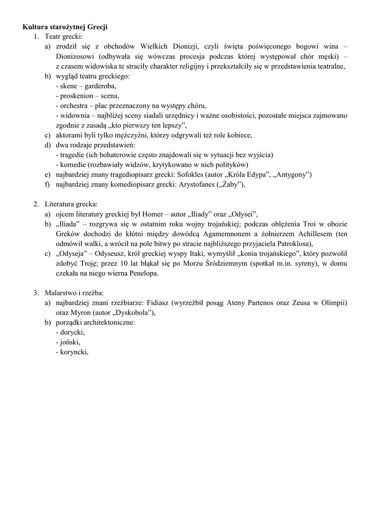 Kultura starożytnej Grecji 1. Teatr grecki: a) zrodził się z obchodów Wielkich Dionizji, czyli święta poświęconego bogowi wina – Dionizosowi (odbywała się wówczas procesja podczas której występował chór męski) – z czasem widowiska te straciły charakter religijny i przekształciły się w przedstawienia teatralne, b) wygląd teatru greckiego: - skene – garderoba, - proskenion – scena, - orchestra – plac przeznaczony na występy chóru, - widownia – najbliżej sceny siadali urzędnicy i ważne osobistości, pozostałe miejsca zajmowano zgodnie z zasadą „kto pierwszy ten lepszy”, c) aktorami byli tylko mężczyźni, którzy odgrywali też role kobiece, d) dwa rodzaje przedstawień: - tragedie (ich bohaterowie często znajdowali się w sytuacji bez wyjścia) - komedie (rozbawiały widzów, krytykowano w nich polityków) e) najbardziej znany tragediopisarz grecki: Sofokles (autor „Króla Edypa”, „Antygony”) f) najbardziej znany komediopisarz grecki: Arystofanes („Żaby”), 2. Literatura grecka: a) ojcem literatury greckiej był Homer – autor „Iliady” oraz „Odysei”, b) „Iliada” – rozgrywa się w ostatnim roku wojny trojańskiej; podczas oblężenia Troi w obozie Greków dochodzi do kłótni między dowódcą Agamemnonem a żołnierzem Achillesem (ten odmówił walki, a wrócił na pole bitwy po stracie najbliższego przyjaciela Patroklosa), c) „Odyseja” – Odyseusz, król greckiej wyspy Itaki, wymyślił „konia trojańskiego”, który pozwolił zdobyć Troję; przez 10 lat błąkał się po Morzu Śródziemnym (spotkał m.in. syreny), w domu czekała na niego wierna Penelopa. 3. Malarstwo i rzeźba: a) najbardziej znani rzeźbiarze: Fidiasz (wyrzeźbił posąg Ateny Partenos oraz Zeusa w Olimpii) oraz Myron (autor „Dyskobola”), b) porządki architektoniczne: - dorycki, - joński, - koryncki,